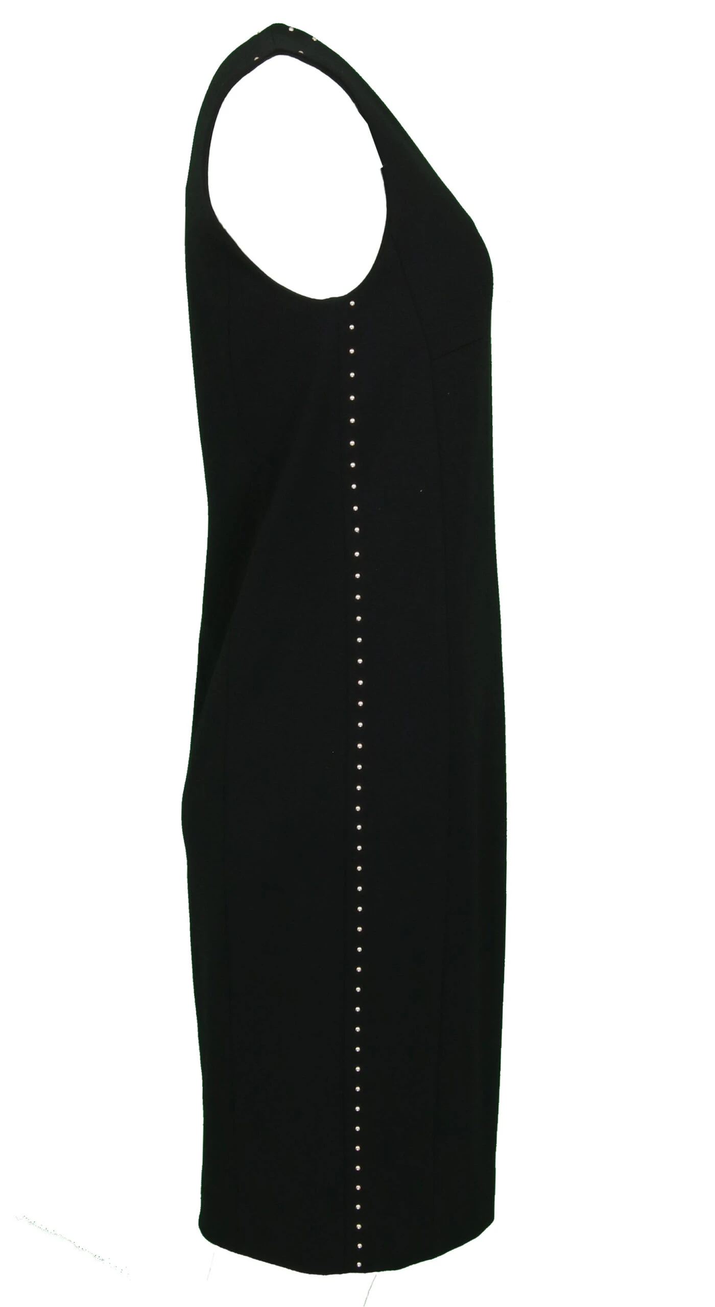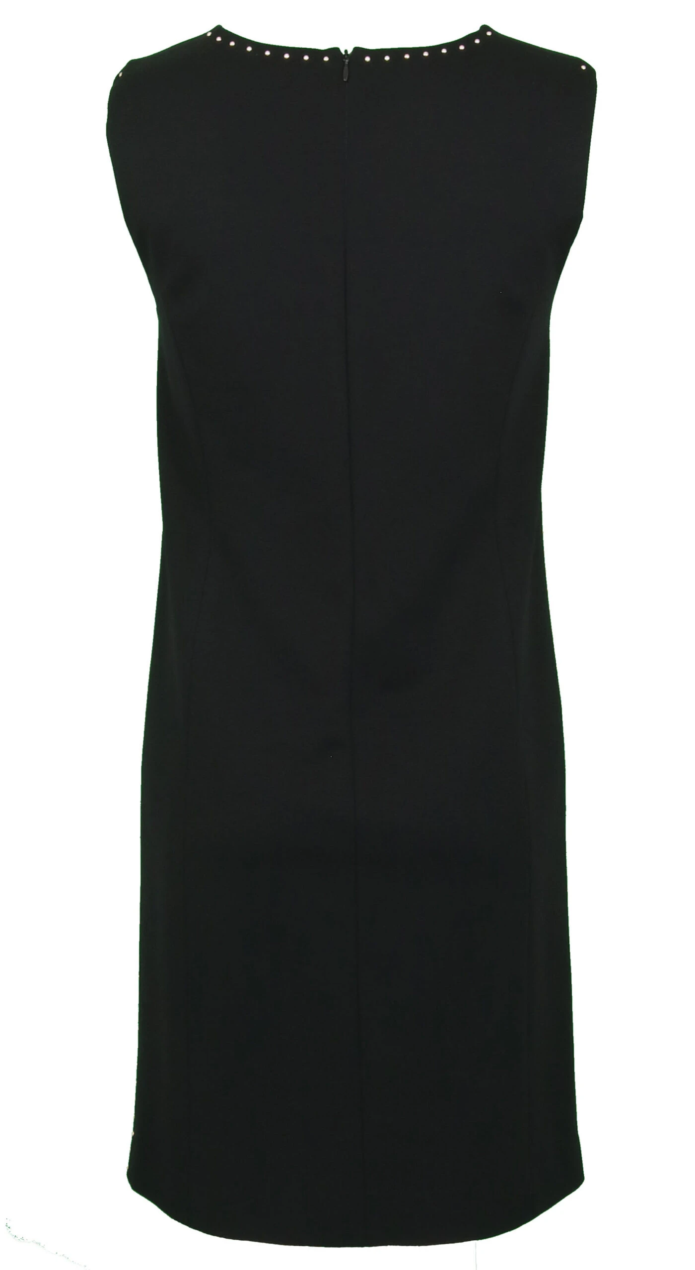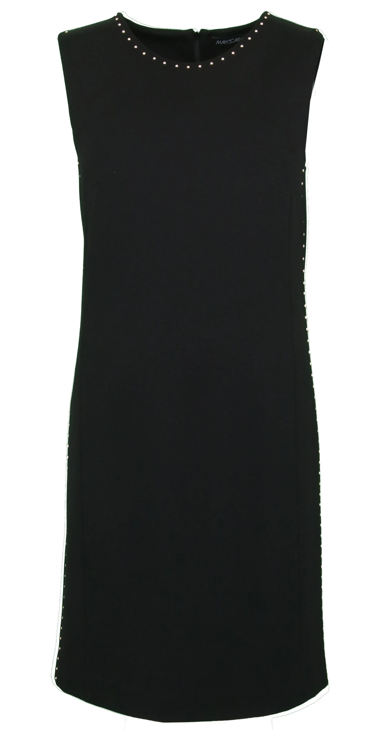 Een mouwlose jurk van Marc Cain in de kleur zwart. Langs de rand van de ronde hals en langs de zijnaden van de jurk zijn decoratieve studs in een messing kleur. De jurk is gevoerd en mag op de hand worden gewassen.