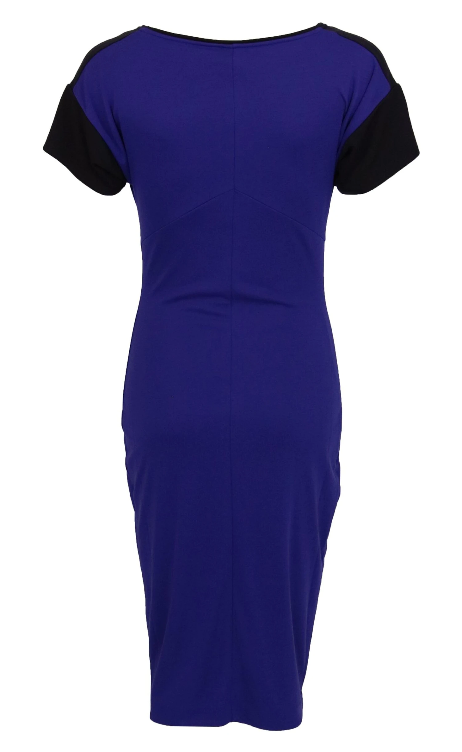 Een jurk van Marc Cain in de kleur kobaltblauw. Op de schouders is een brede zwarte band. De korte mouwen zijn in de kleur zwart en langs de ronde hals is een zwarte bies. De jurk is gevoerd en mag op 30 graden worden gewassen.