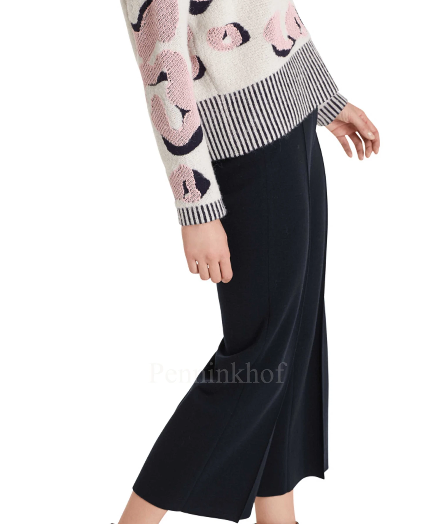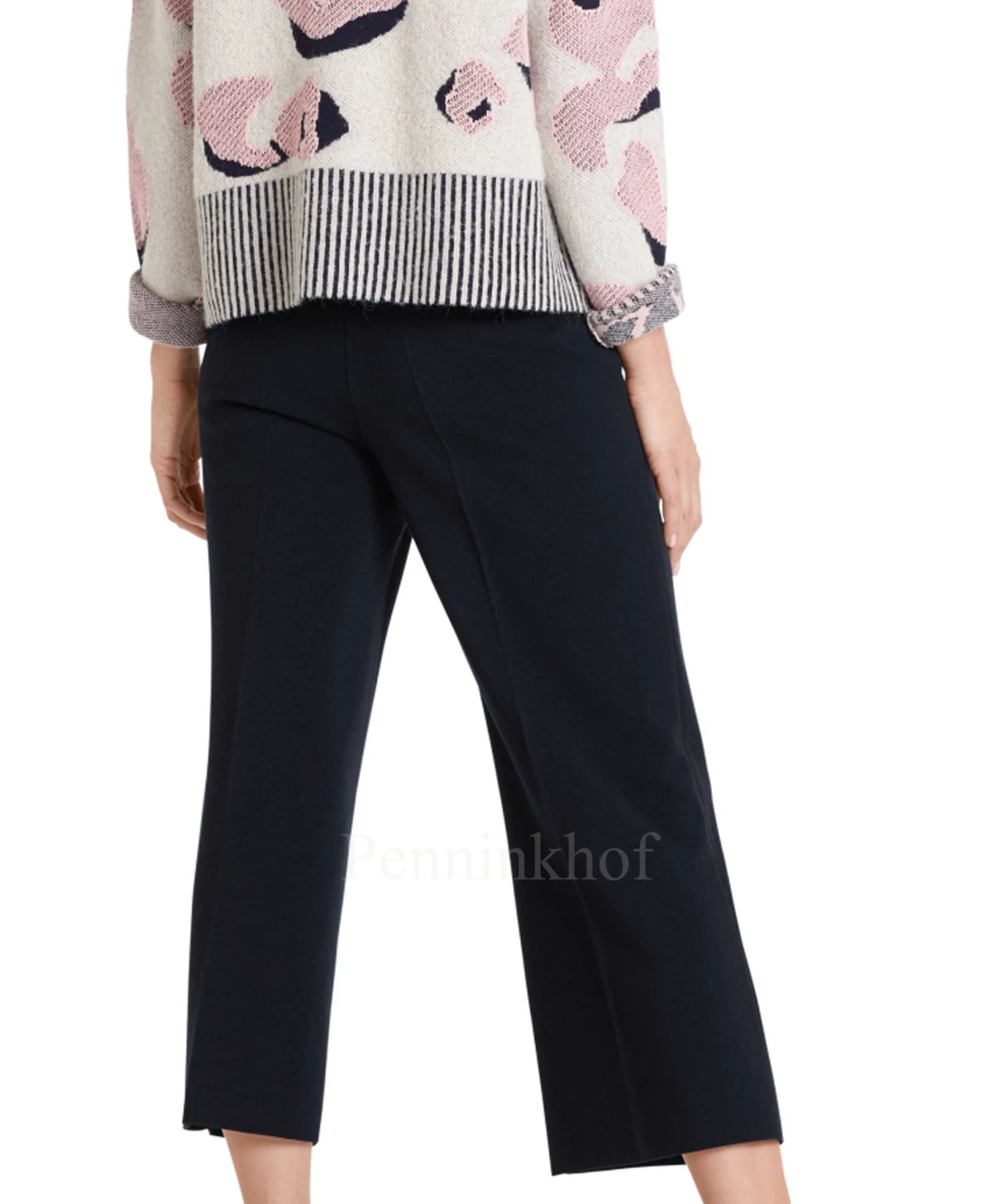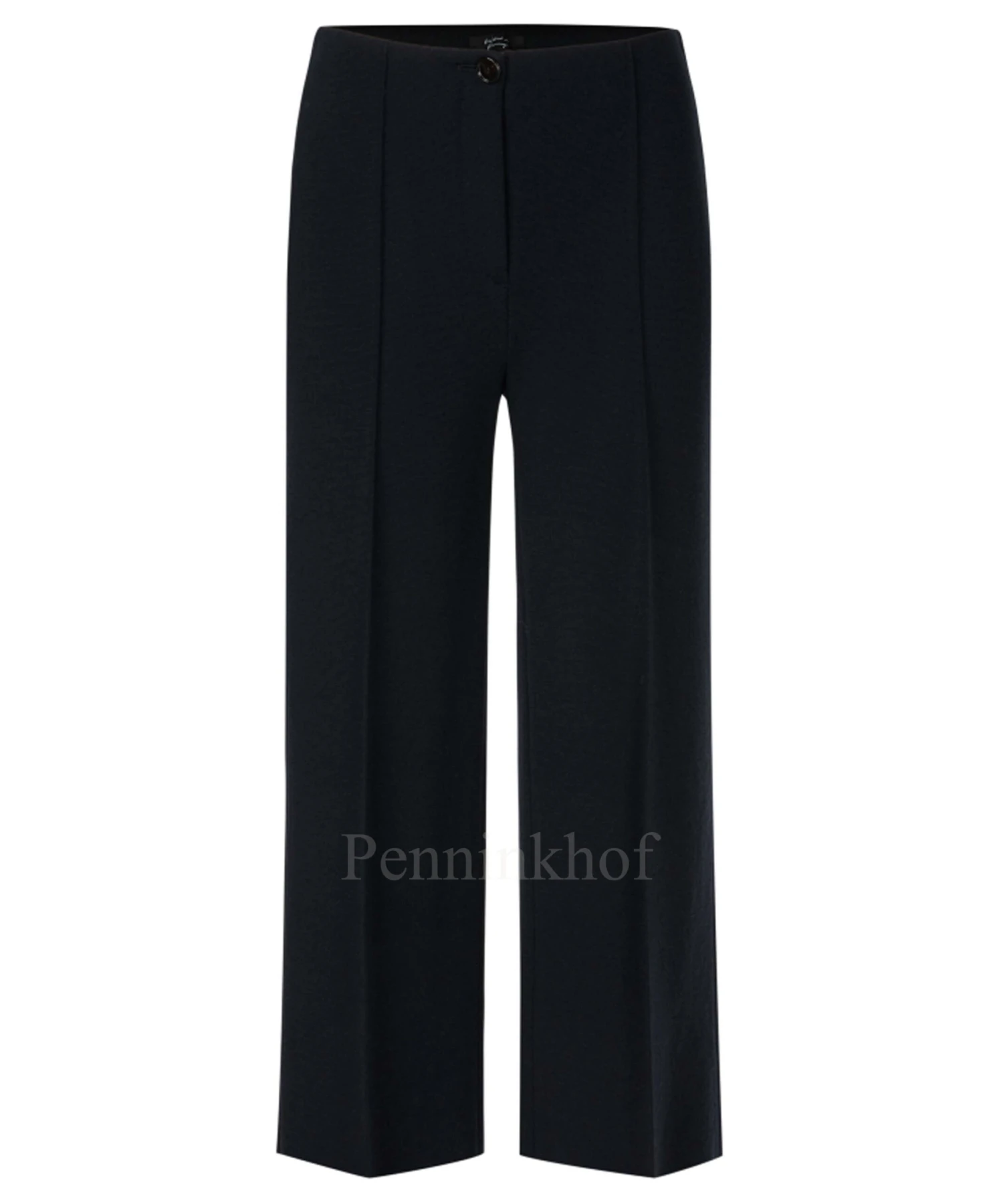 Een wijde broek van Marc Cain in de kleur marineblauw. In de taille is een elastieken band. In het midden van de pijpen is een stiknaad. deze broek mag op de hand worden gewassen.