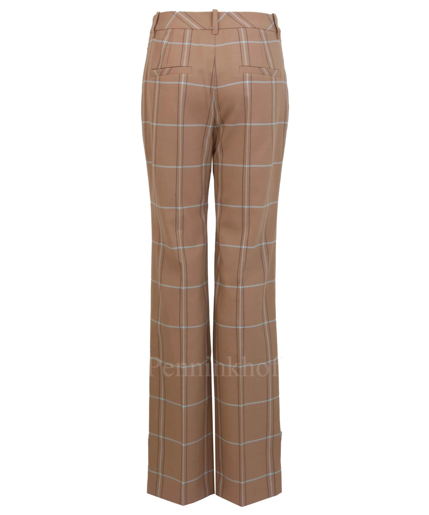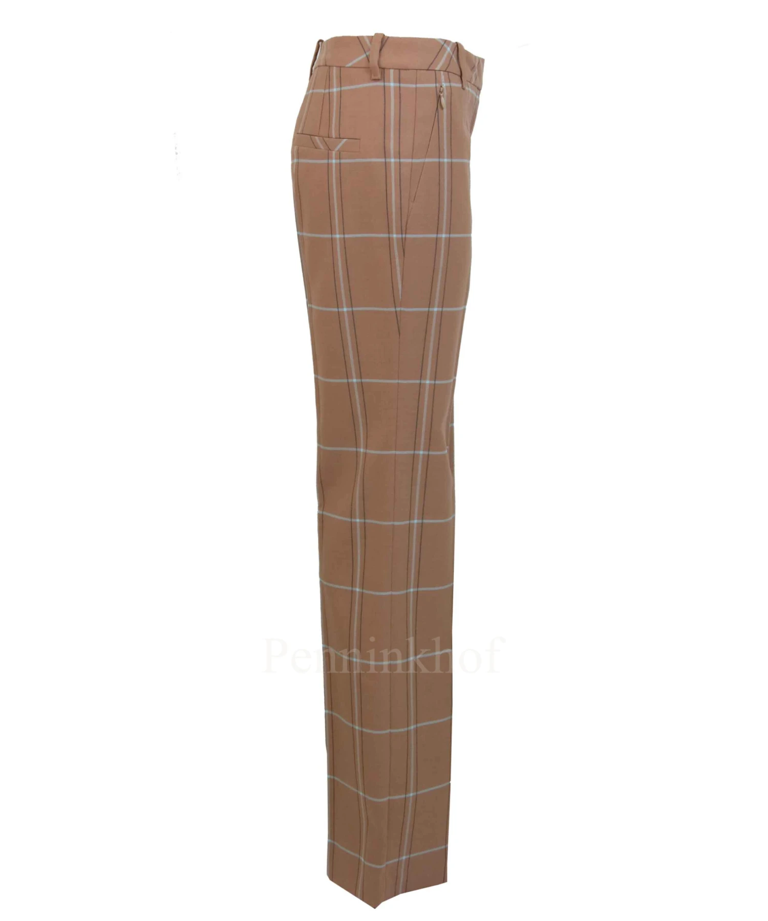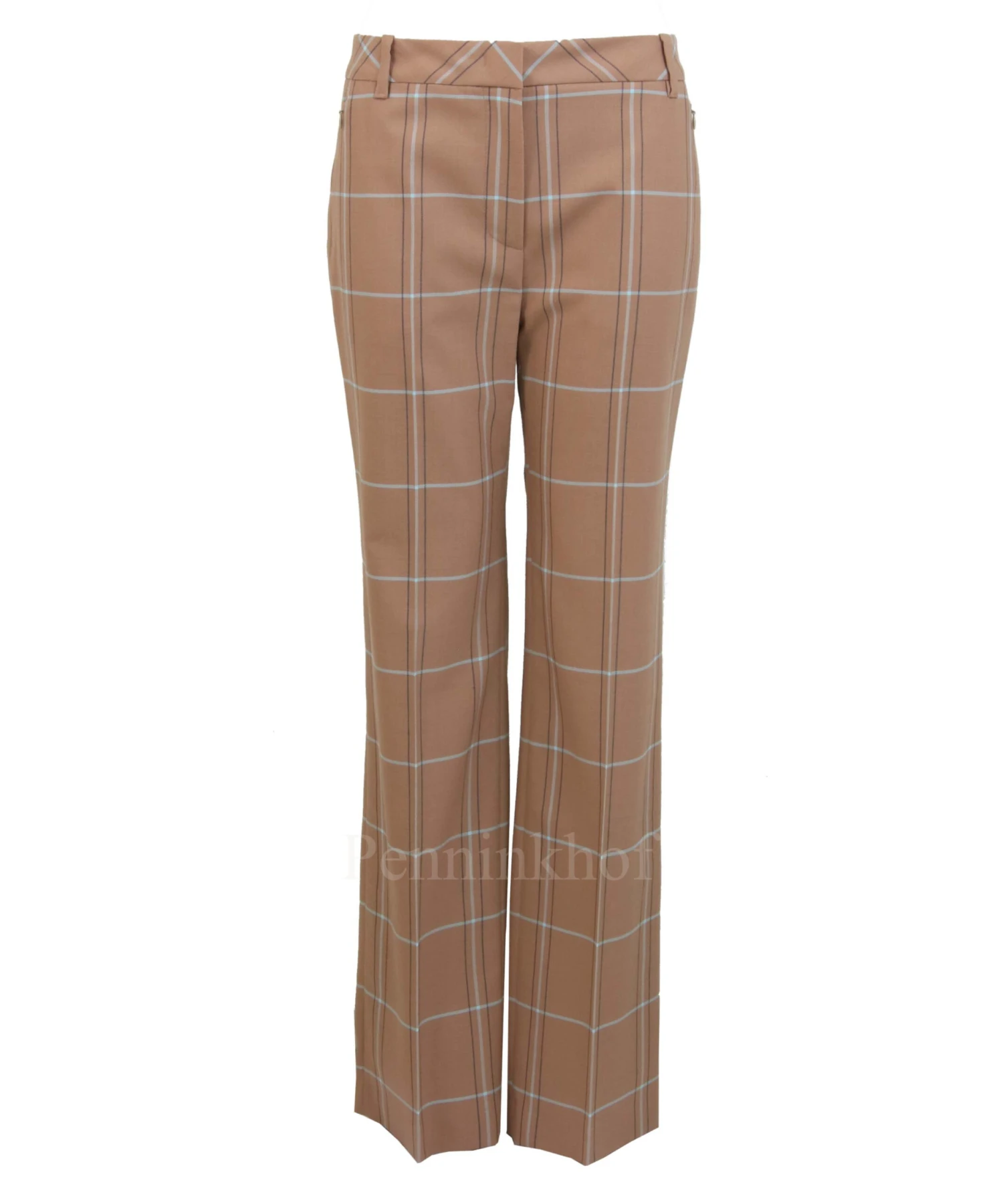 Een recht gesneden broek van Marc Cain in een ruit patroon met de kleuren ijsblauw en mokkabruin op een camel kleurige achtergrond. De steekzakken hebben een ritssluiting. De pijpen hebben een gestreken plooi in het midden. Deze broek mag niet worden gewassen.