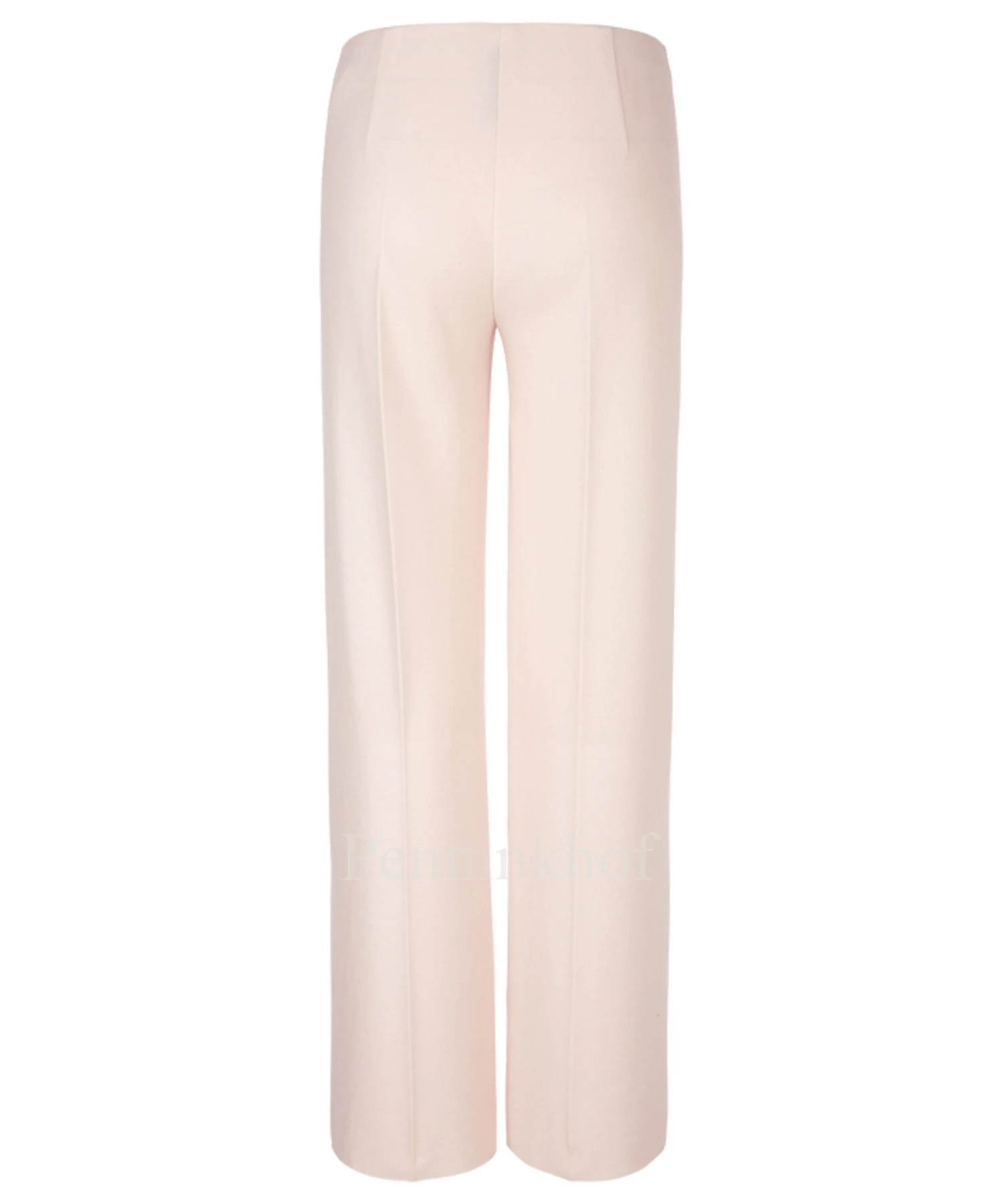 Een wijde tricot broek van Marc Cain in de kleur pastel roze. In de taille is een elastieken band. In het midden van de pijpen is een stiknaad. Deze broek mag op de hand worden gewassen.