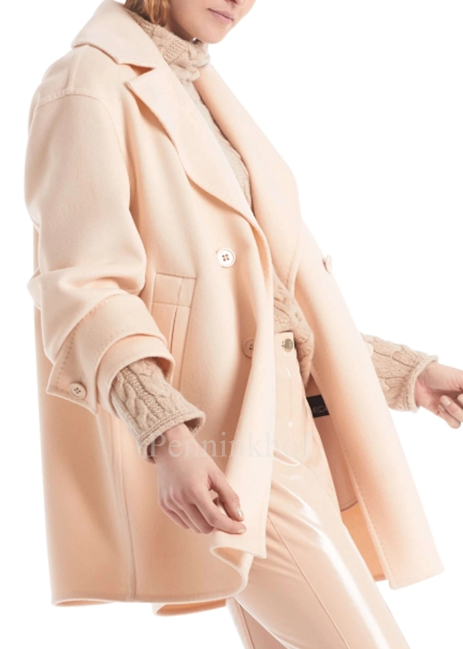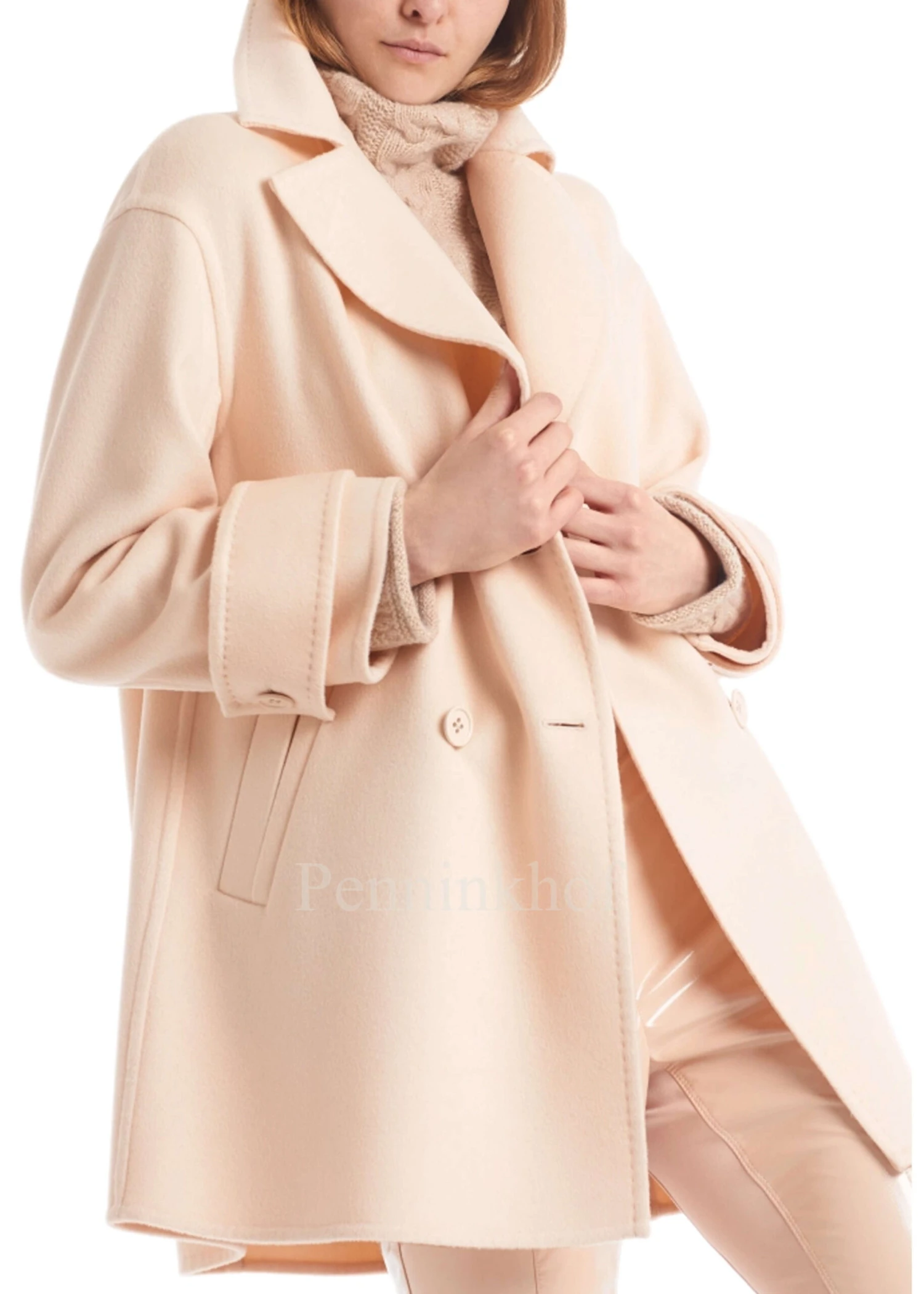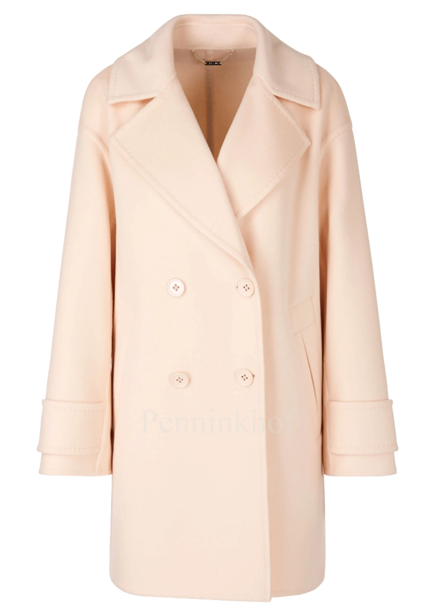 Een double breasted coat van Marc Cain in een pastel roze kleur. De coat heeft een brede kraag en heeft steekzakken. De coat is ongevoerd en mag niet worden gewassen.