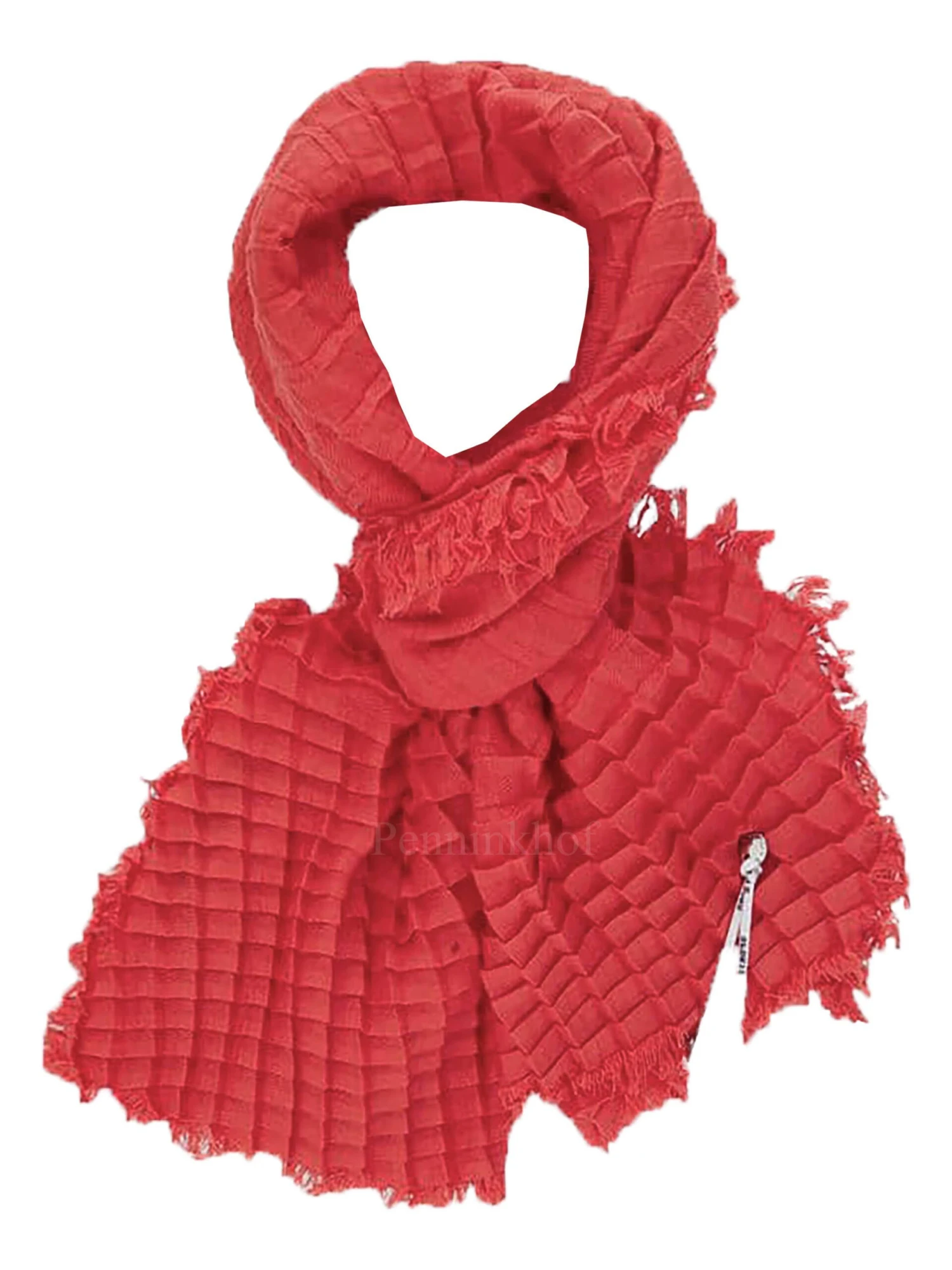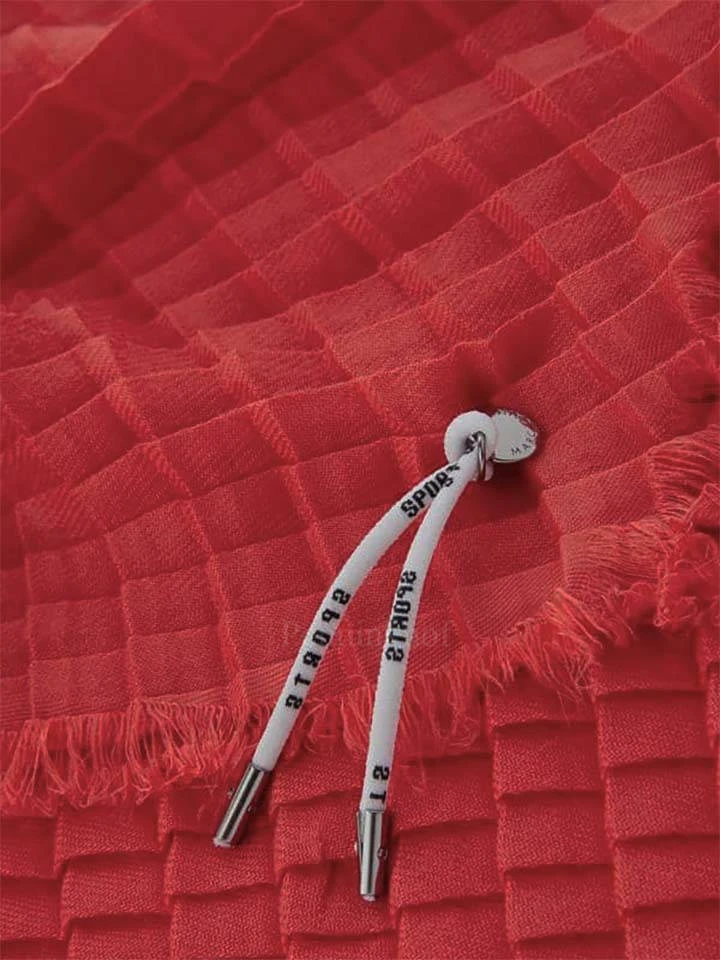 Een shawl van Marc Cain in de kleur framboosrood. De shawl is geweven in een wafel structuur. De randen zijn fijn gerafeld. Deze shawl mag op de hand worden gewassen.