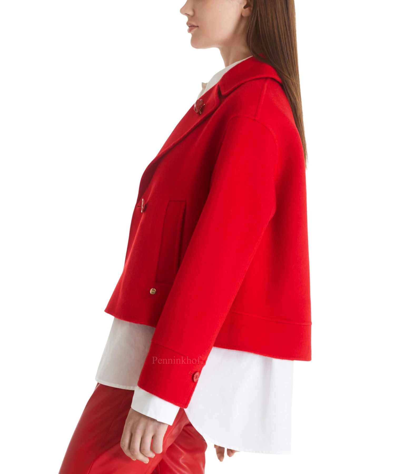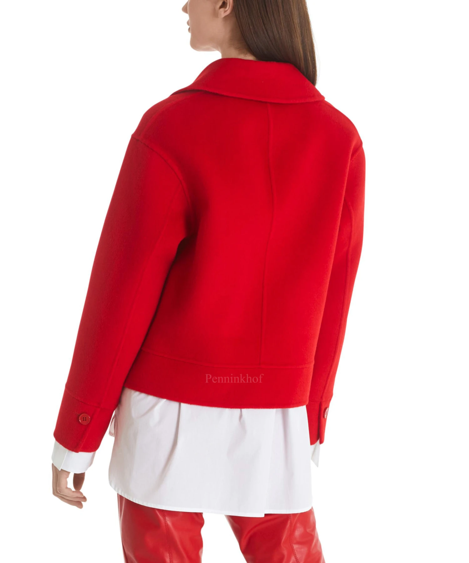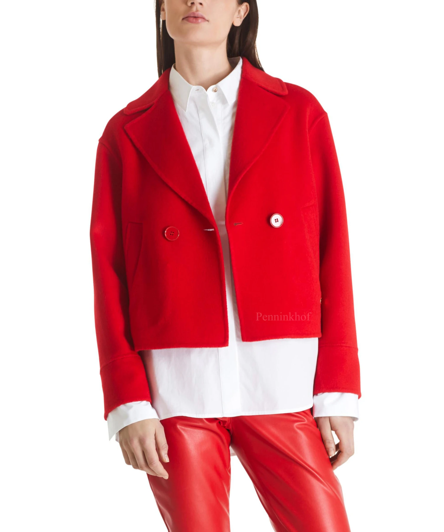 Een korte double breasted coat van Marc Cain in de kleur rood. De coat heeft steekzakken en is ongevoerd. Deze coat mag niet worden gewassen.