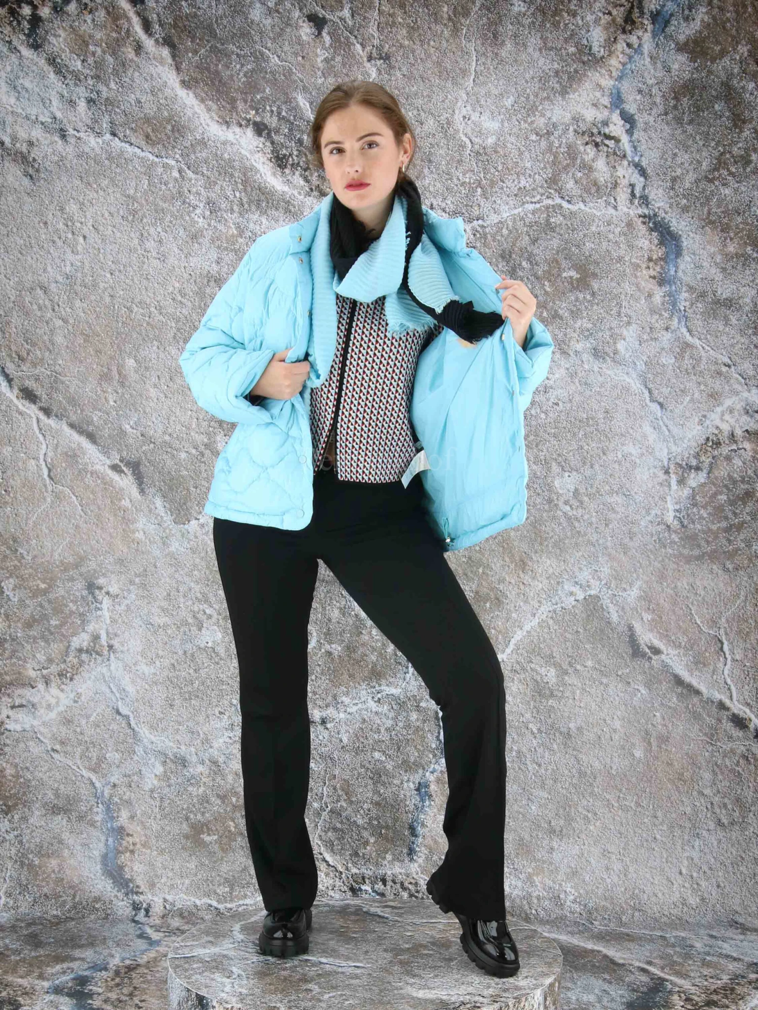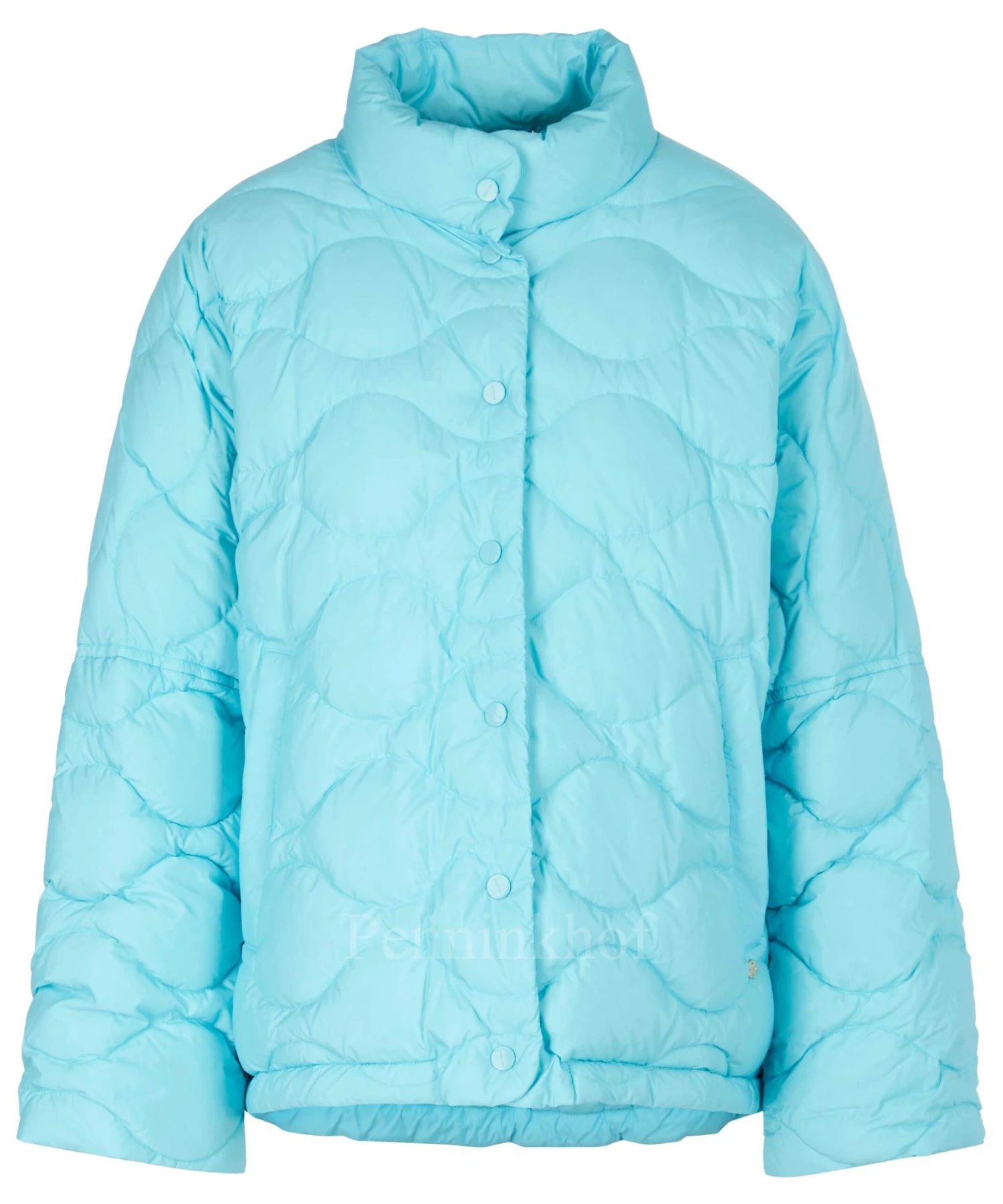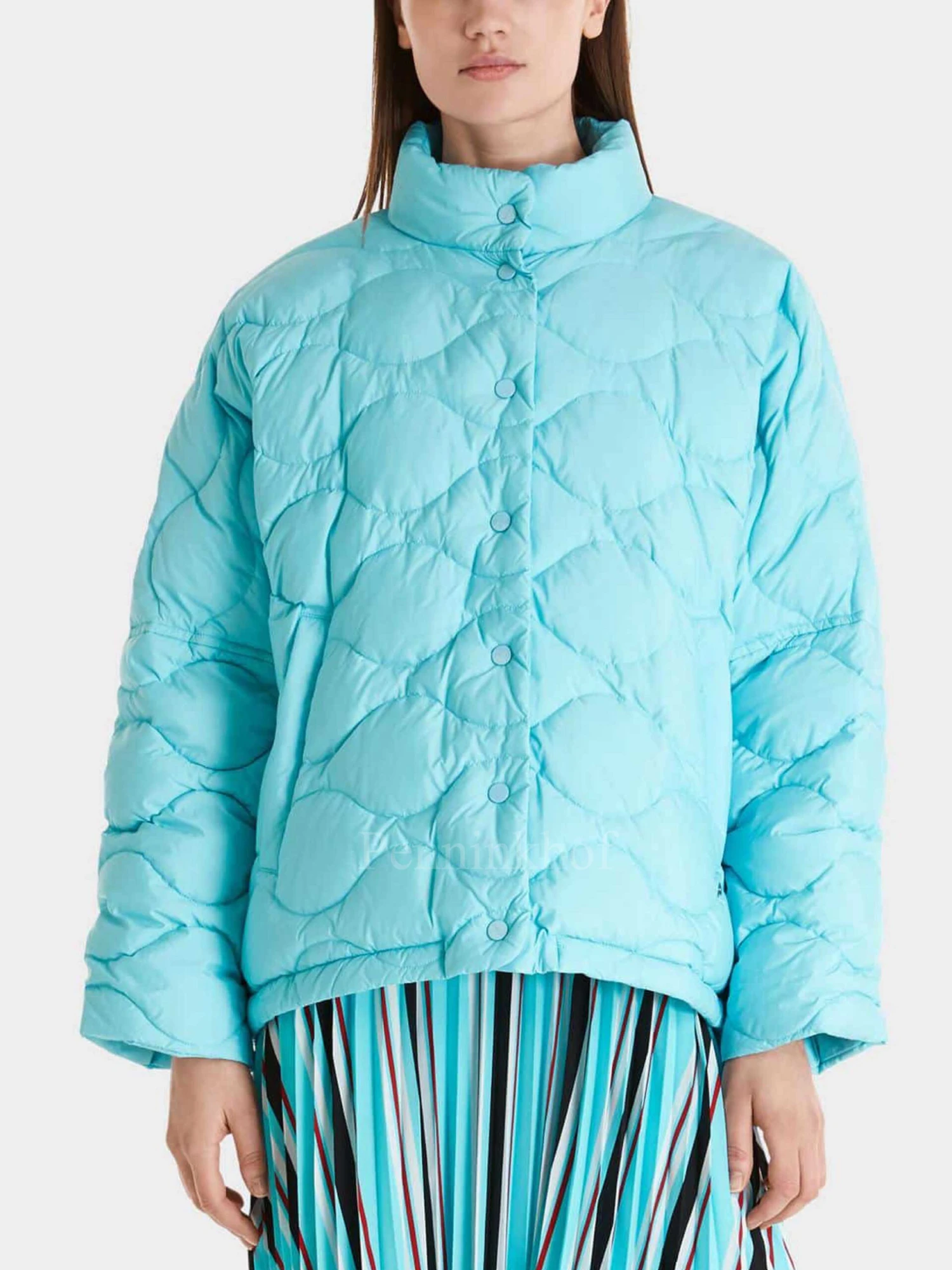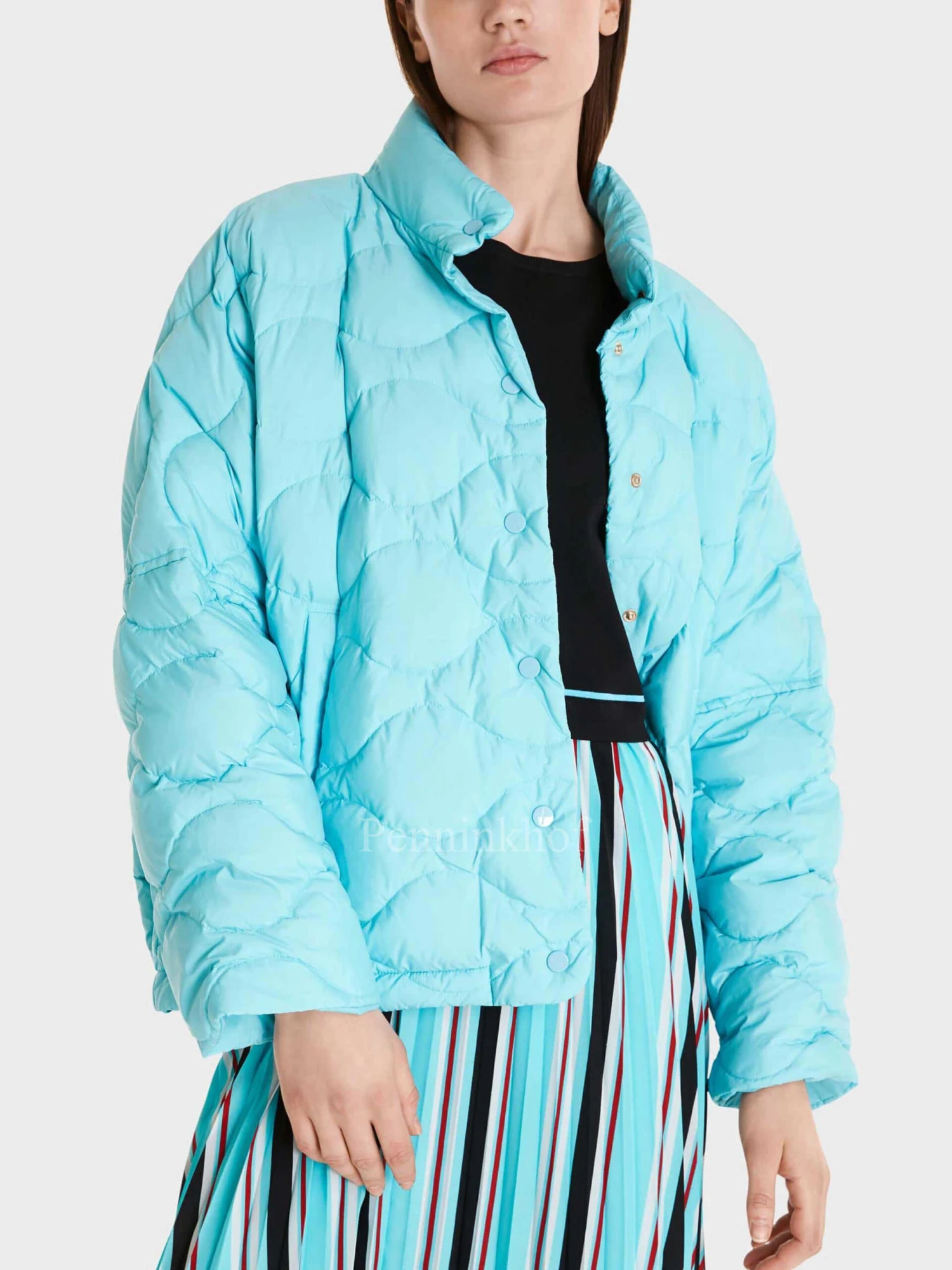 Een golvende gestepte coat van Marc Cain in een zacht blauwe kleur. De coat heeft een sluiting met drukknopen en heeft steekzakken. Deze coat mag op 30 graden worden gewassen.