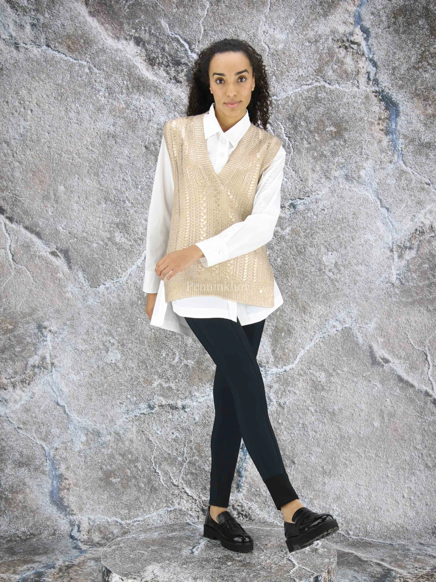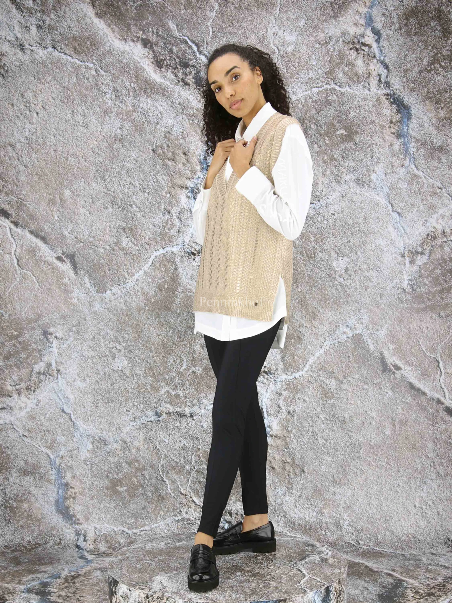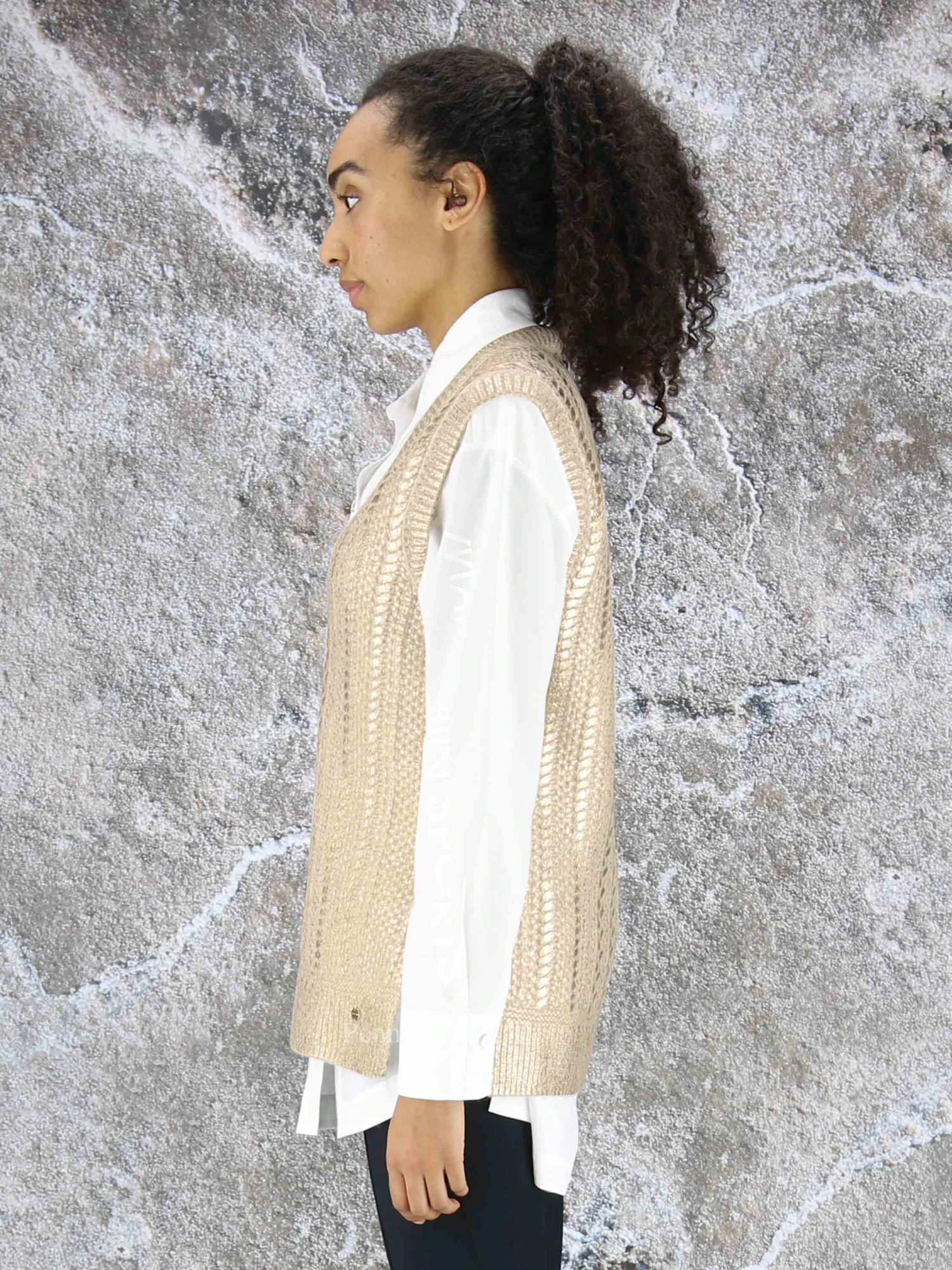 Een spencer van Marc Cain in een beige kleur met een goud laag op de stof ingebrand. De spencer is in een kabelstructuur gebreid en heeft een V – Hals. Deze spencer mag op de hand worden gewassen.