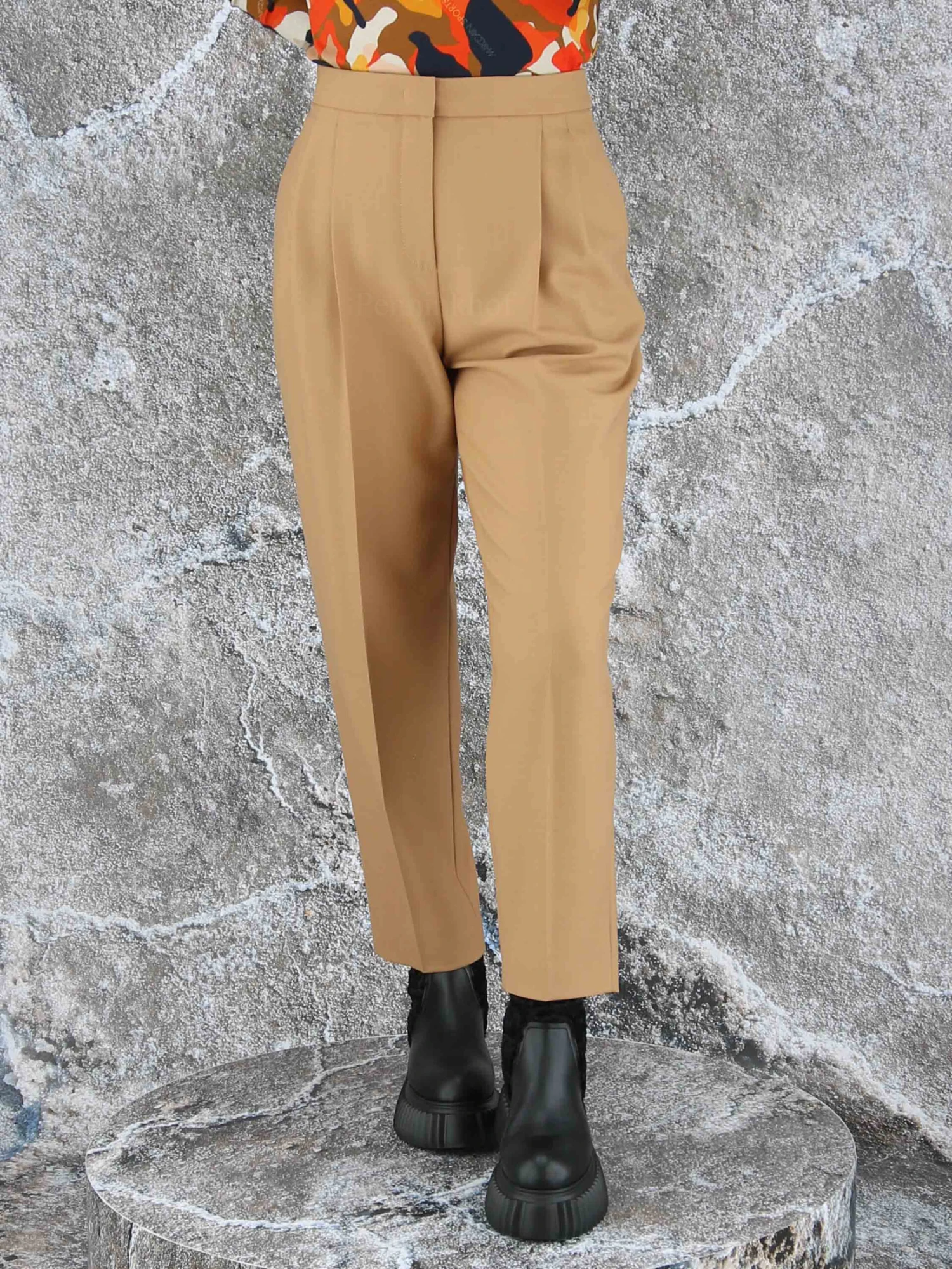 Een broek van Marc Cain in de kleur camel. De broek heeft bandplooien en steekzakken. Deze broek mag op de hand worden gewassen.