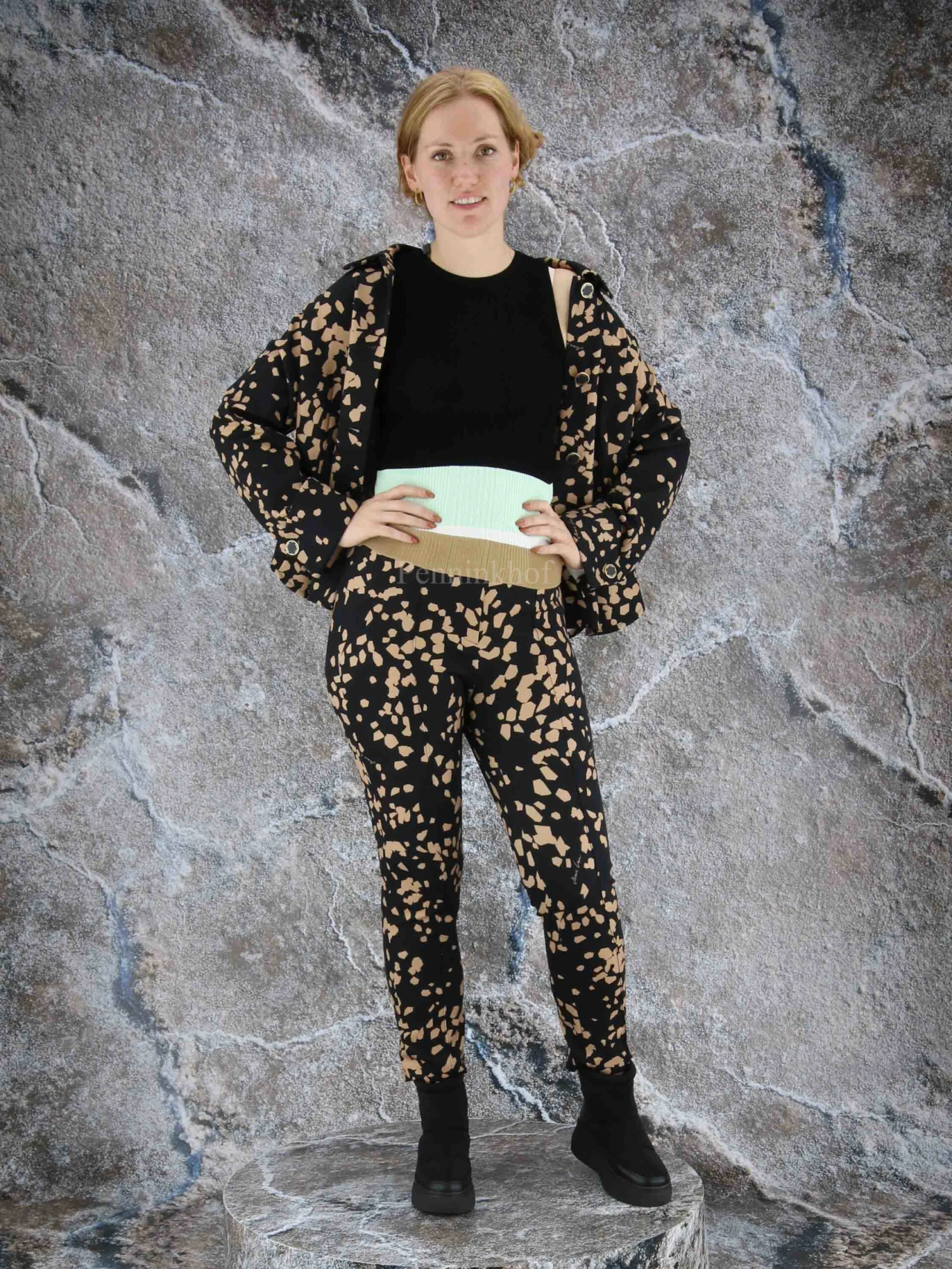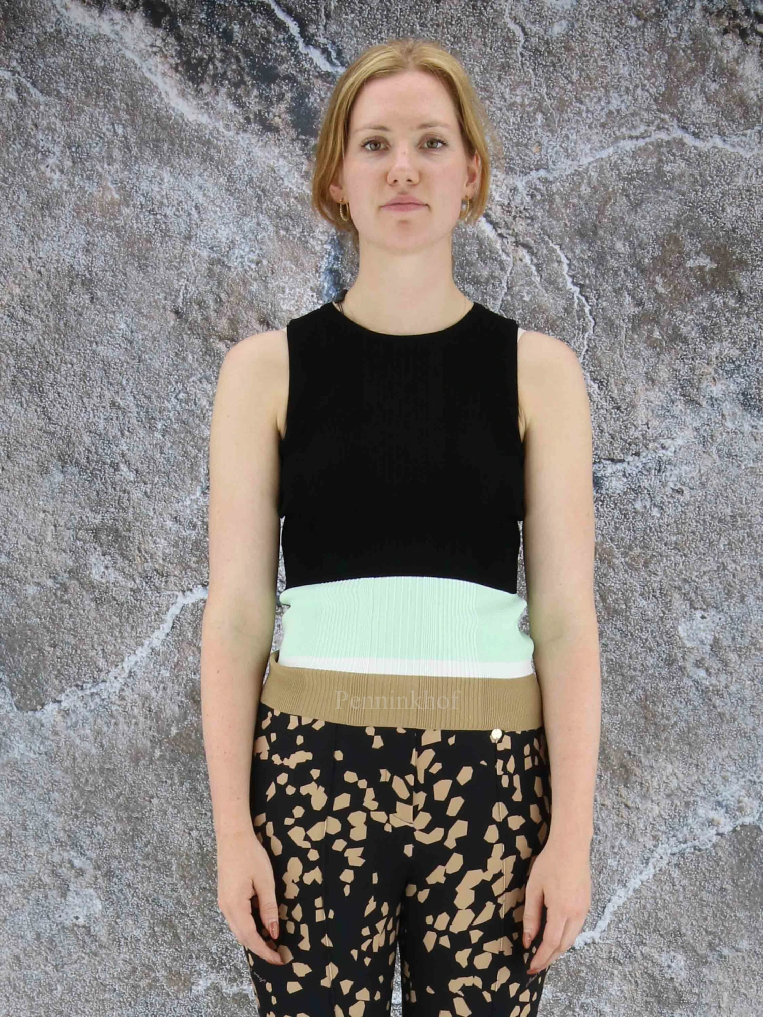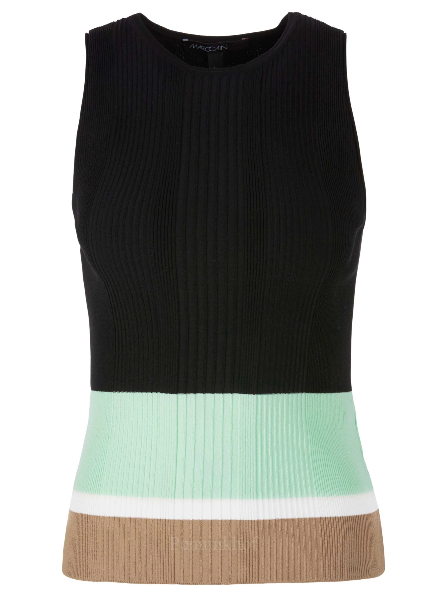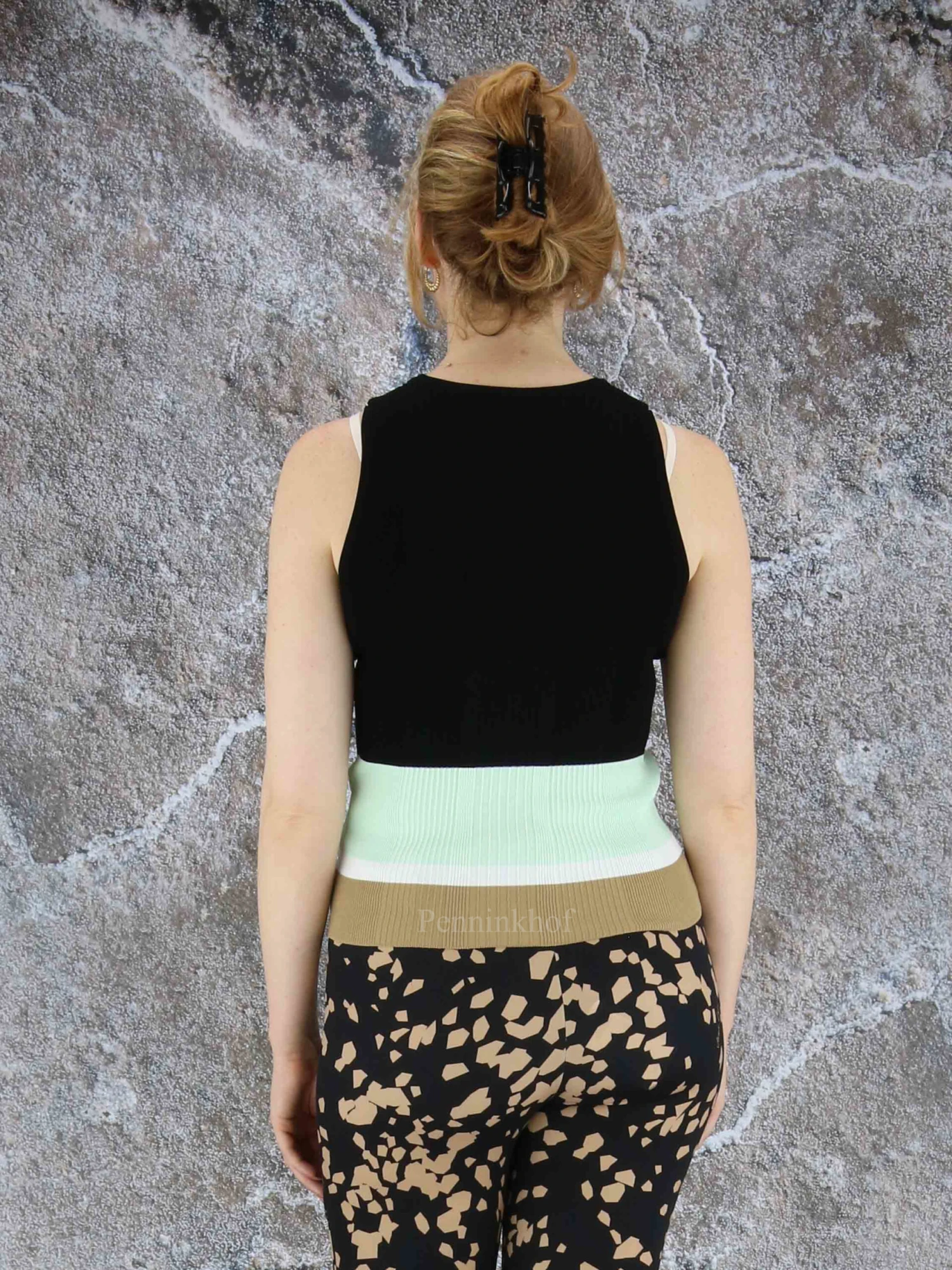 Een top van Marc Cain In een kleuren patroon met de kleuren mint. roomwit, camel en als hoofdkleur zwart. De stof is in een geribbeld patroon en mag op 30 graden worden gewassen.