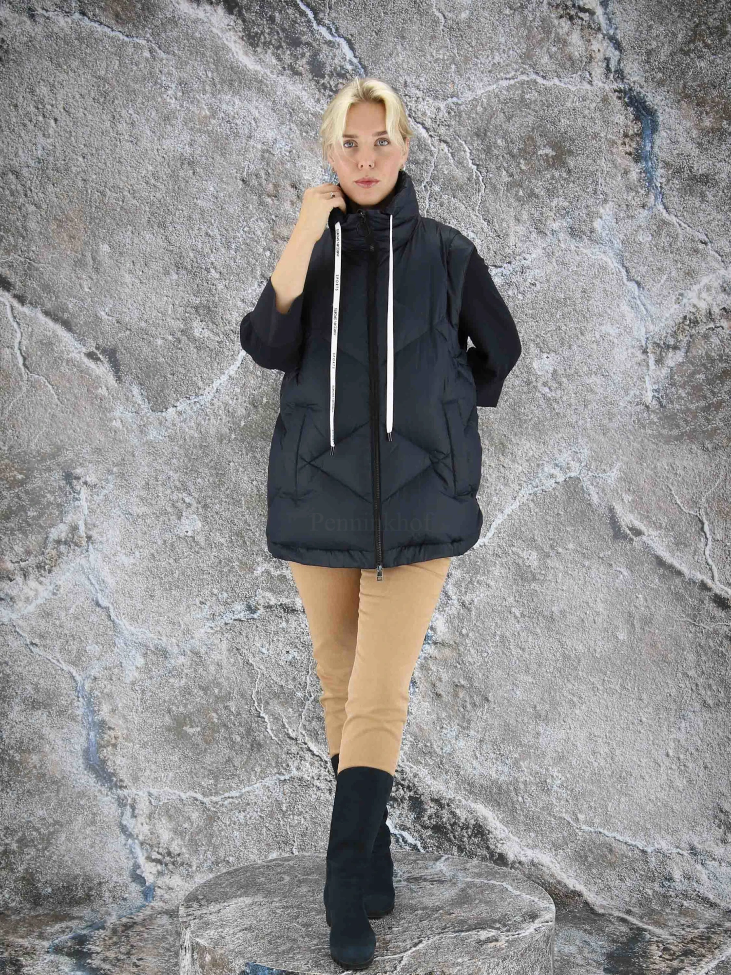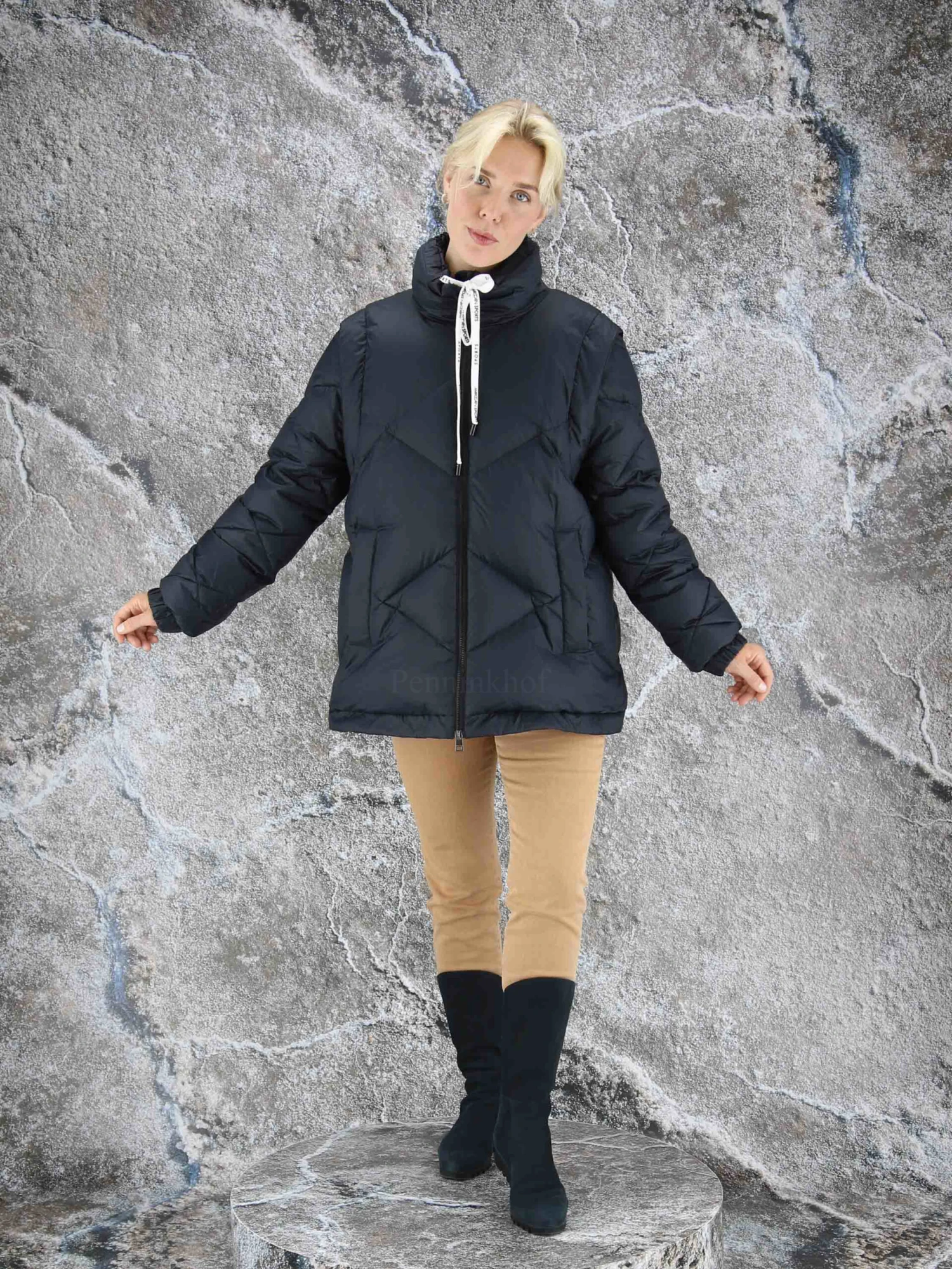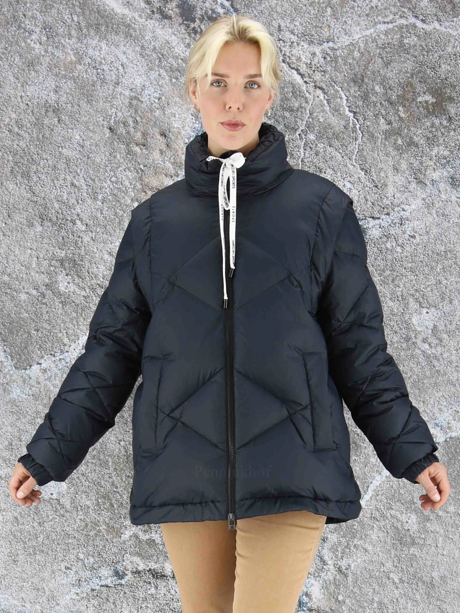 Een coat van Marc Cain in de kleur marineblauw. De mouwen zijn uitritsbaar zodat er een bodywarmer blijft. De coat heeft steekzakken. Aan de onderkant is een koord in een tunnelverweking waarmee deze kan worden aangetrokken. Deze coat mag op 30 graden worden gewassen.