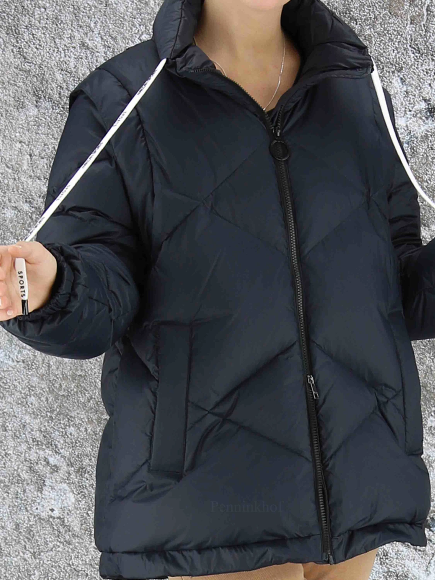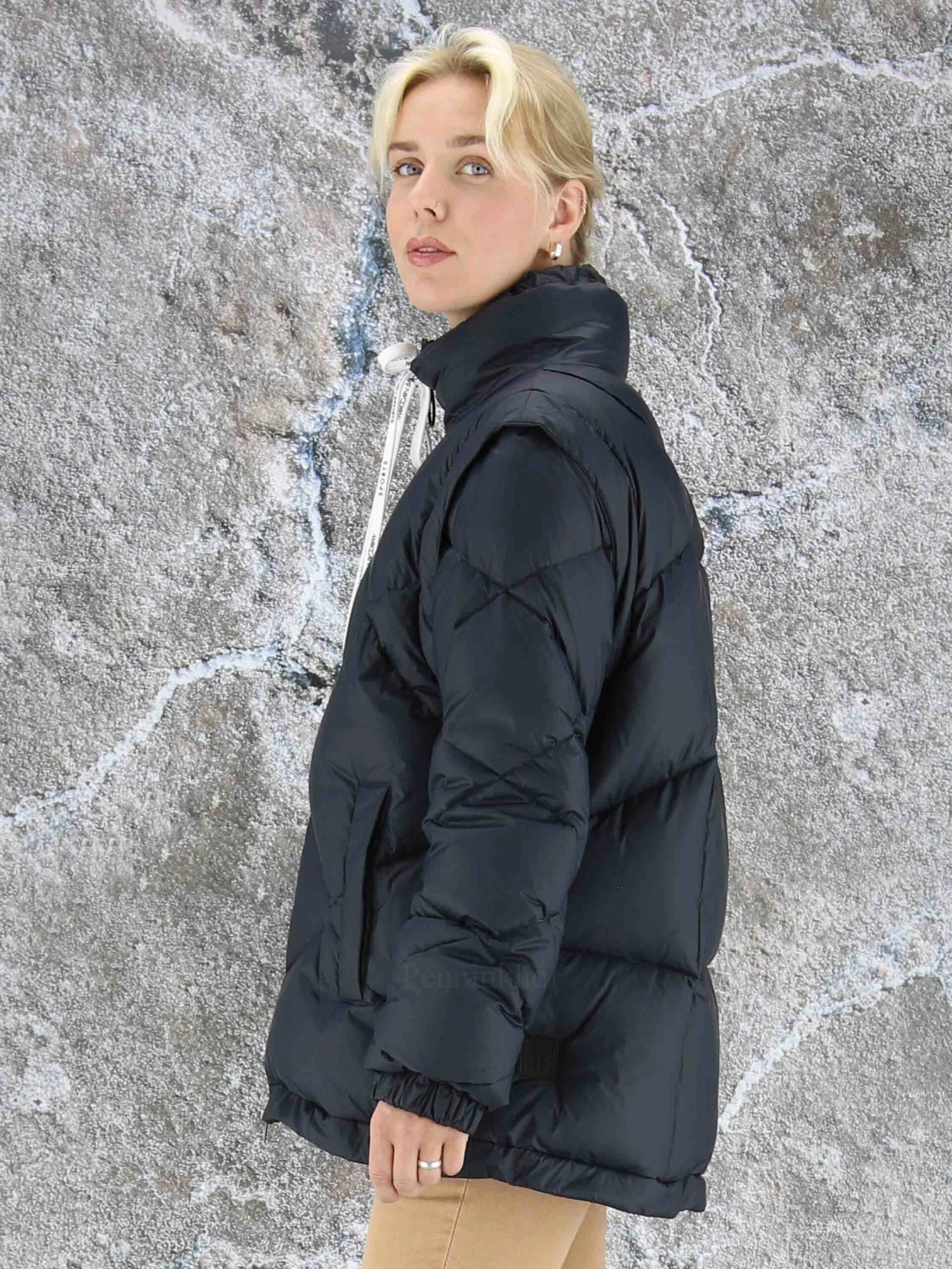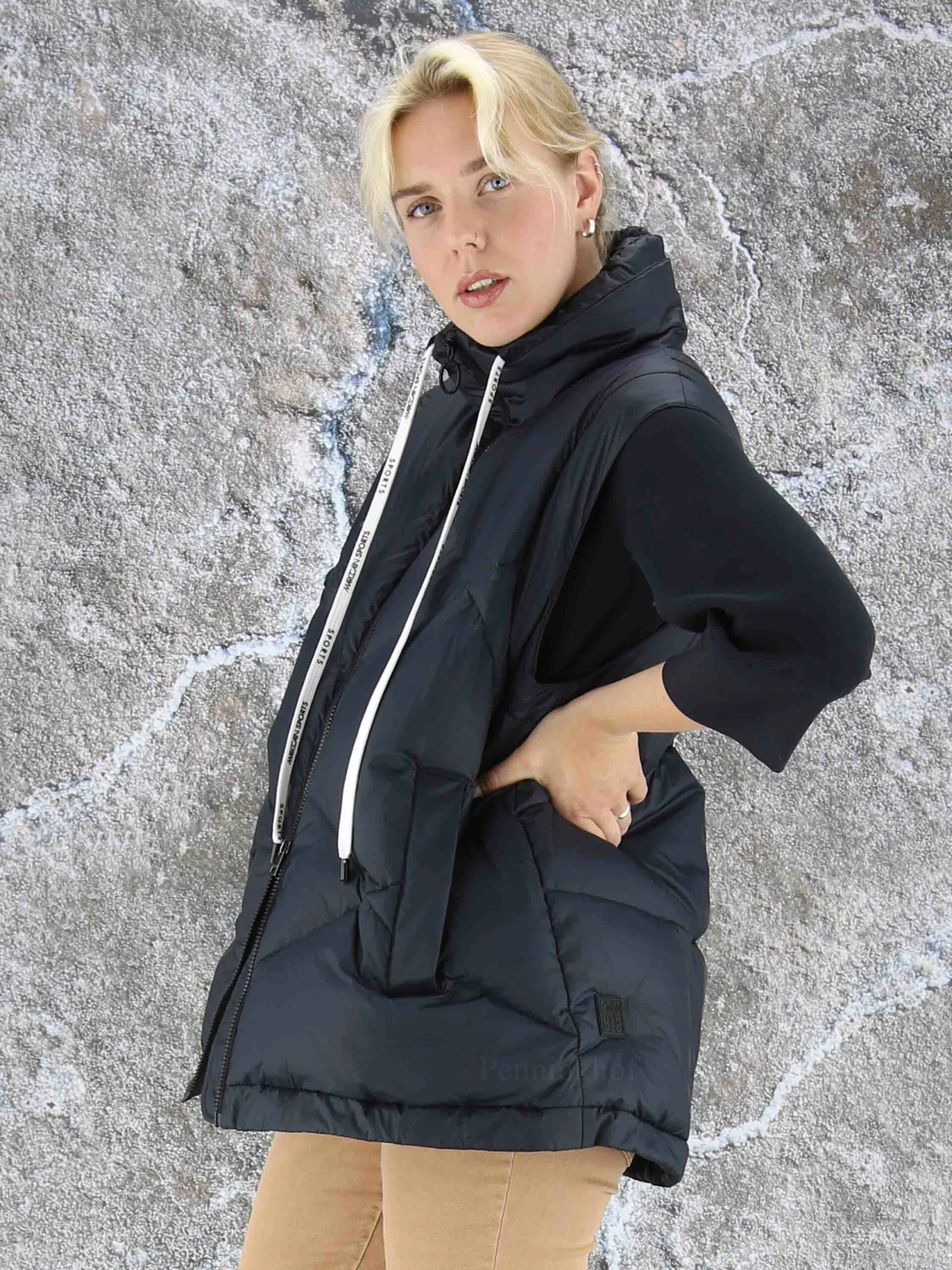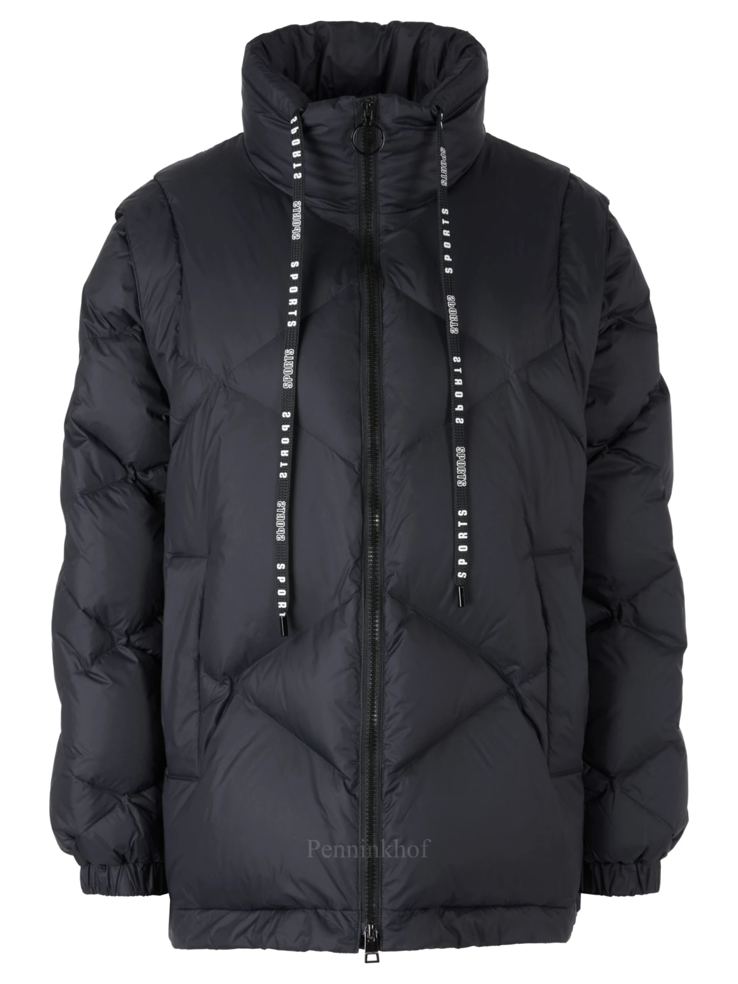 Een coat van Marc Cain in de kleur marineblauw. De mouwen zijn uitritsbaar zodat er een bodywarmer blijft. De coat heeft steekzakken. Aan de onderkant is een koord in een tunnelverweking waarmee deze kan worden aangetrokken. Deze coat mag op 30 graden worden gewassen.