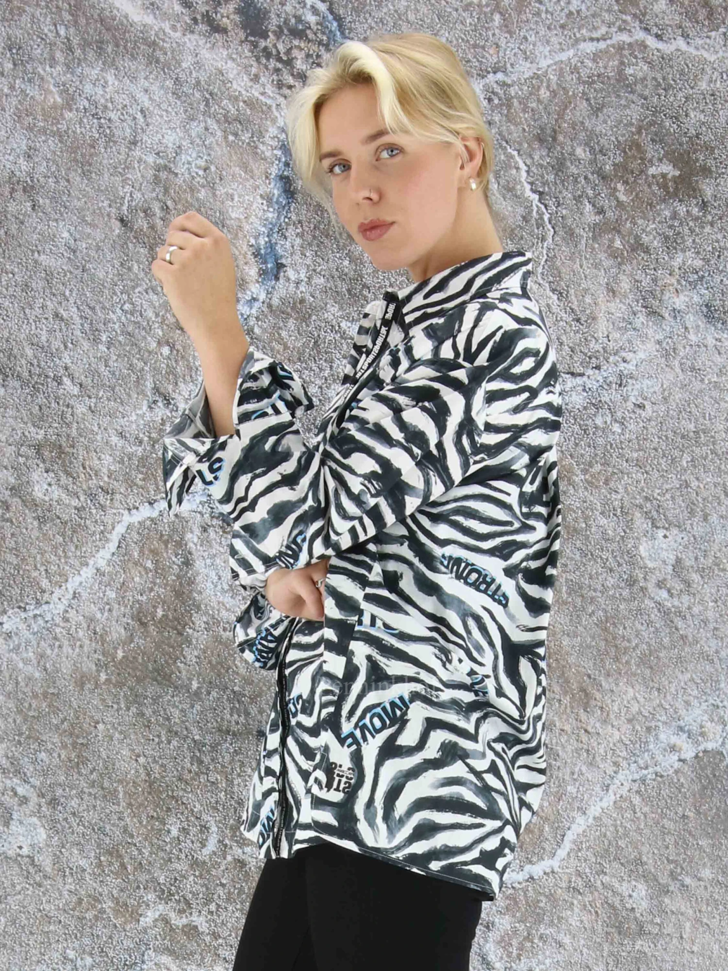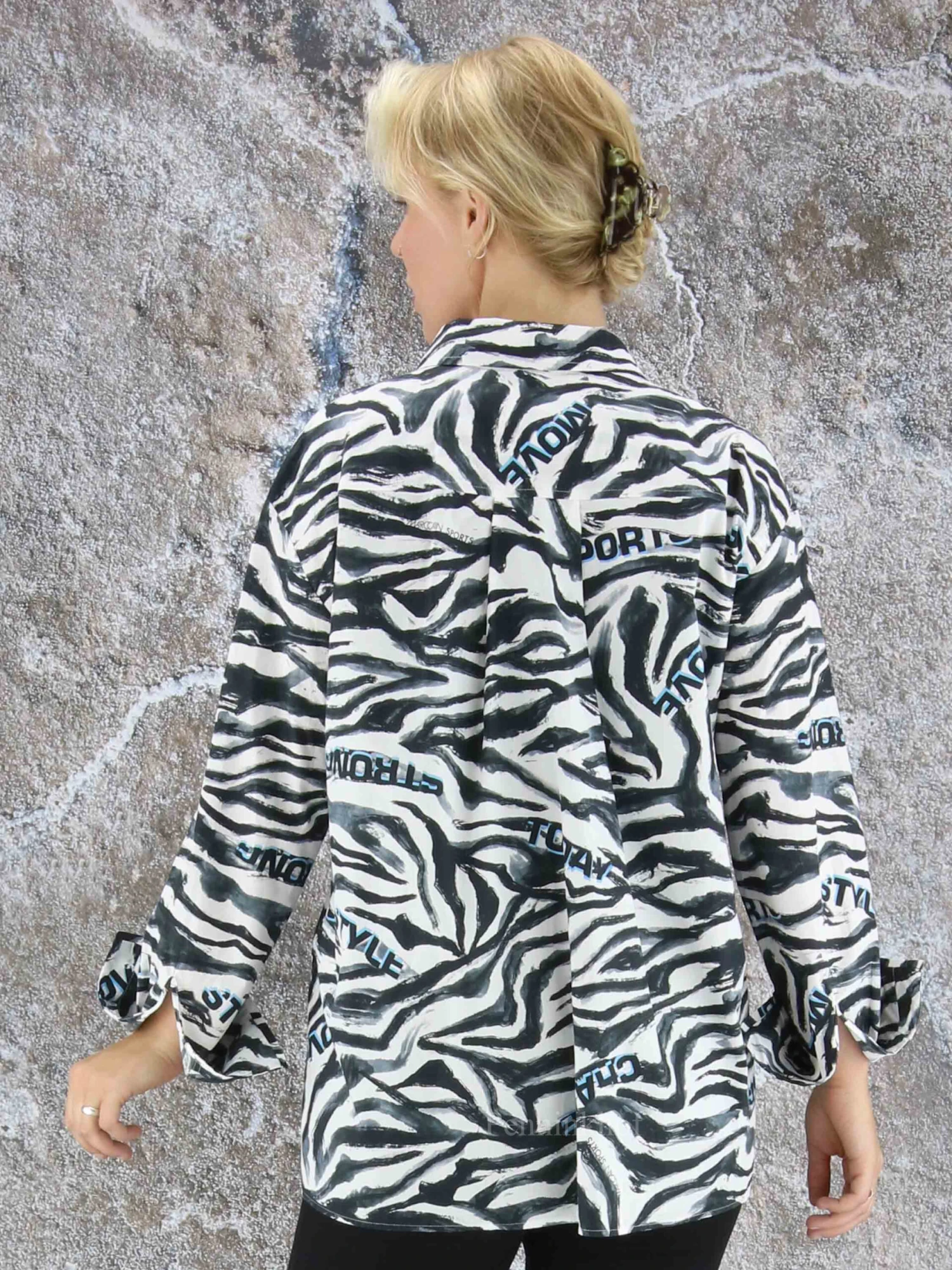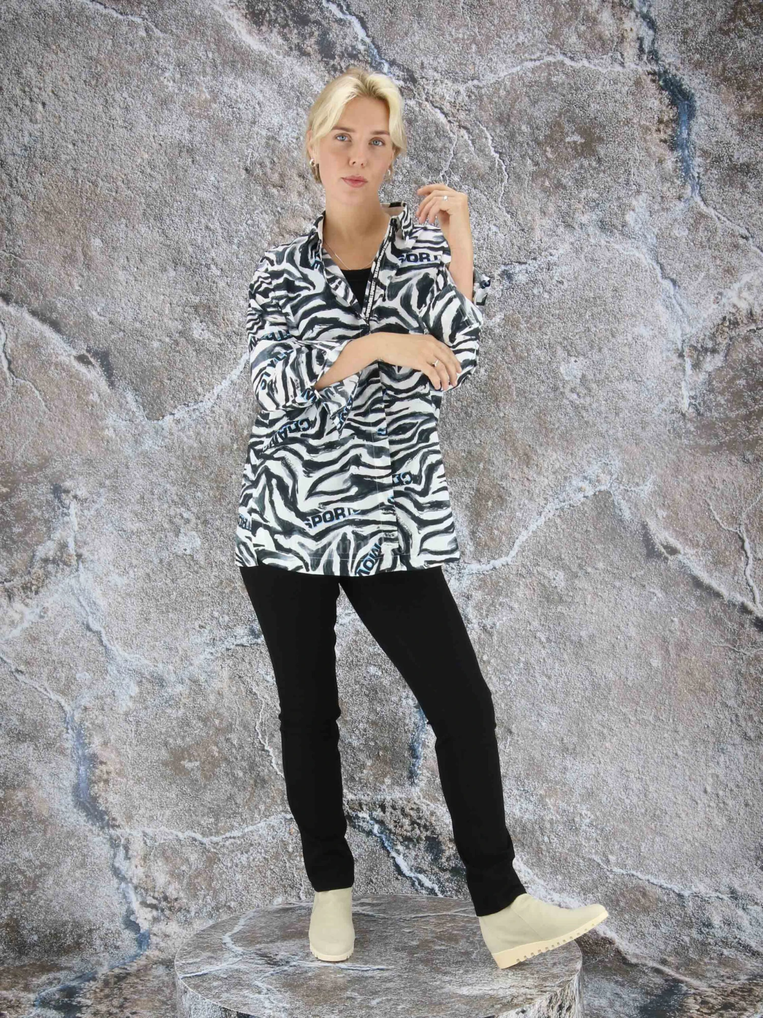 Een blouse van Marc Cain in een zebra print met de kleuren wit, zwart en pastelblauw, De blouse heeft een A – Lijn. De blouse heeft een verborgen knoop sluiting. Aan de onderkant is aan beide zijden een korte split waar de stof rond gesneden is. Aan de achterkant is onder het schouderblad in het midden een dubbele plooi. Deze blouse mag op 30 graden worden gewassen.