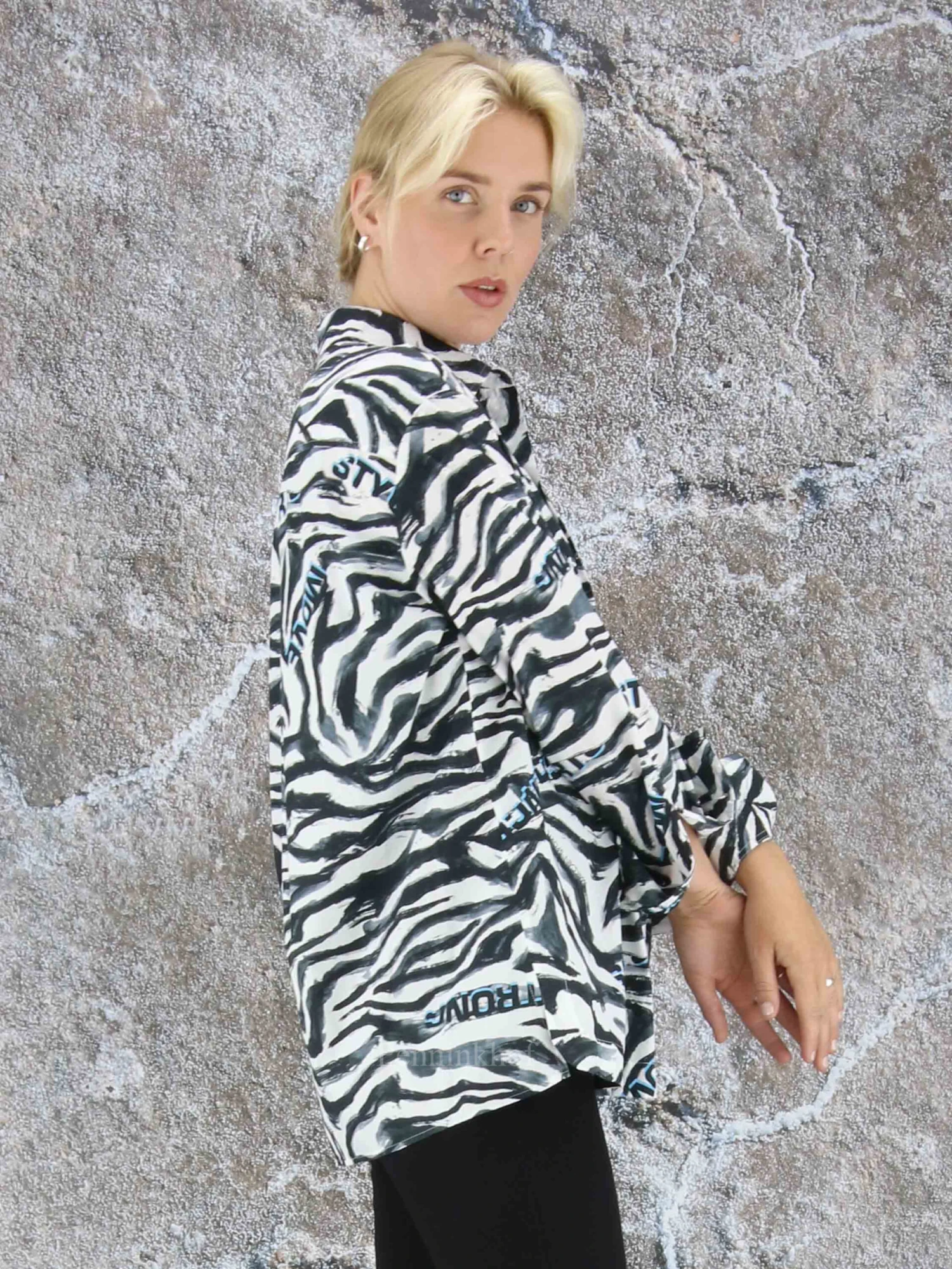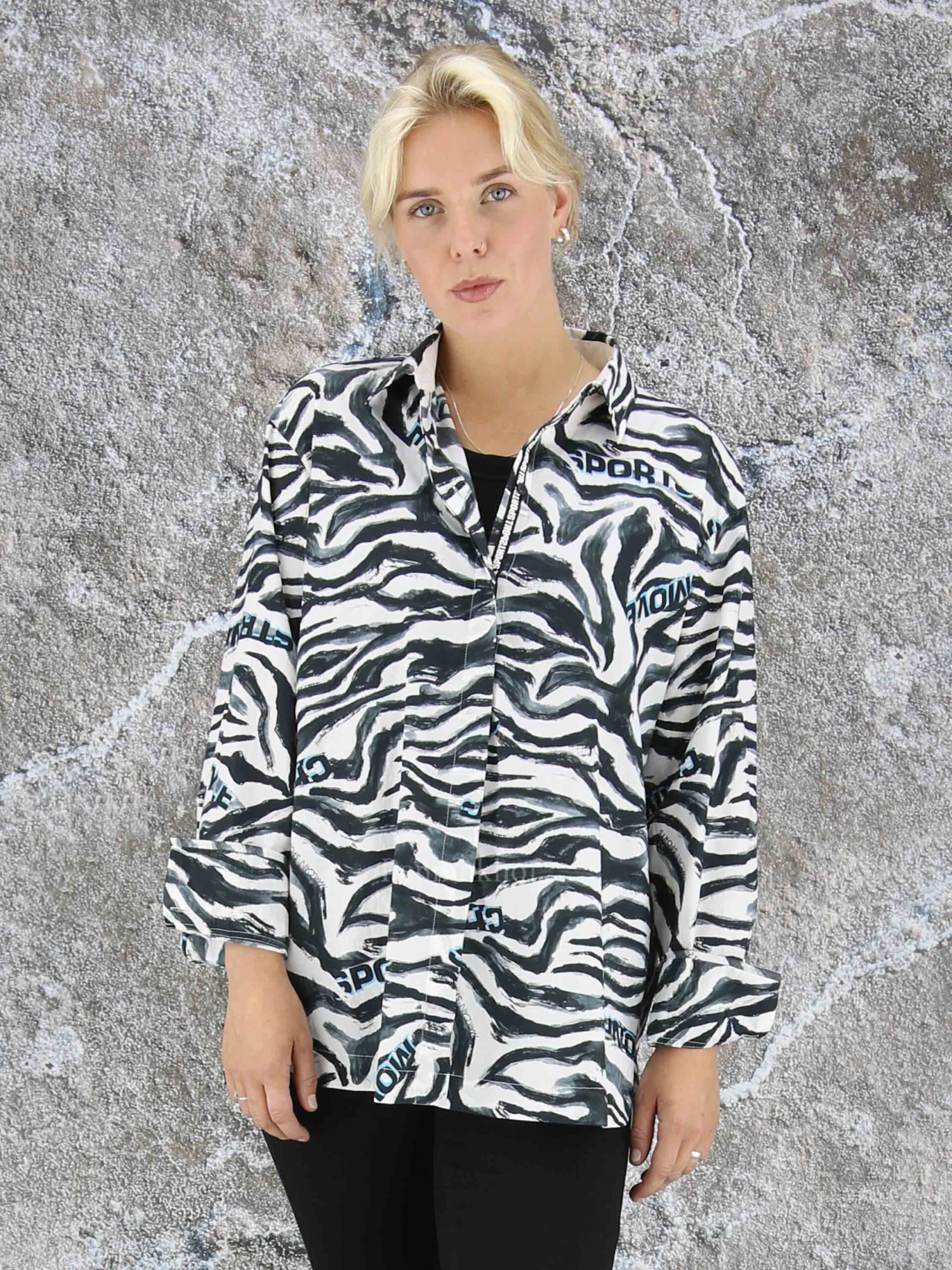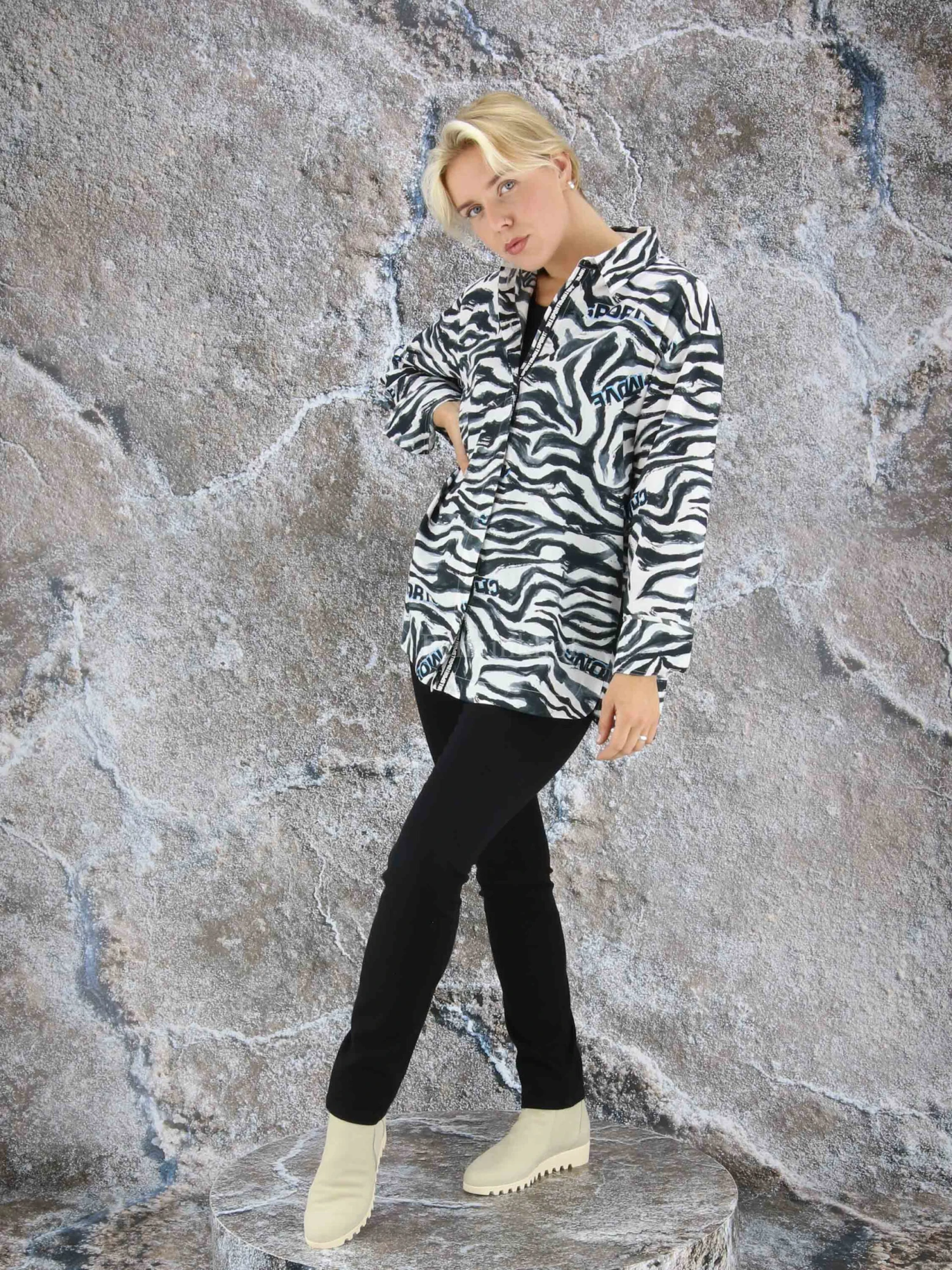 Een blouse van Marc Cain in een zebra print met de kleuren wit, zwart en pastelblauw, De blouse heeft een A – Lijn. De blouse heeft een verborgen knoop sluiting. Aan de onderkant is aan beide zijden een korte split waar de stof rond gesneden is. Aan de achterkant is onder het schouderblad in het midden een dubbele plooi. Deze blouse mag op 30 graden worden gewassen.
