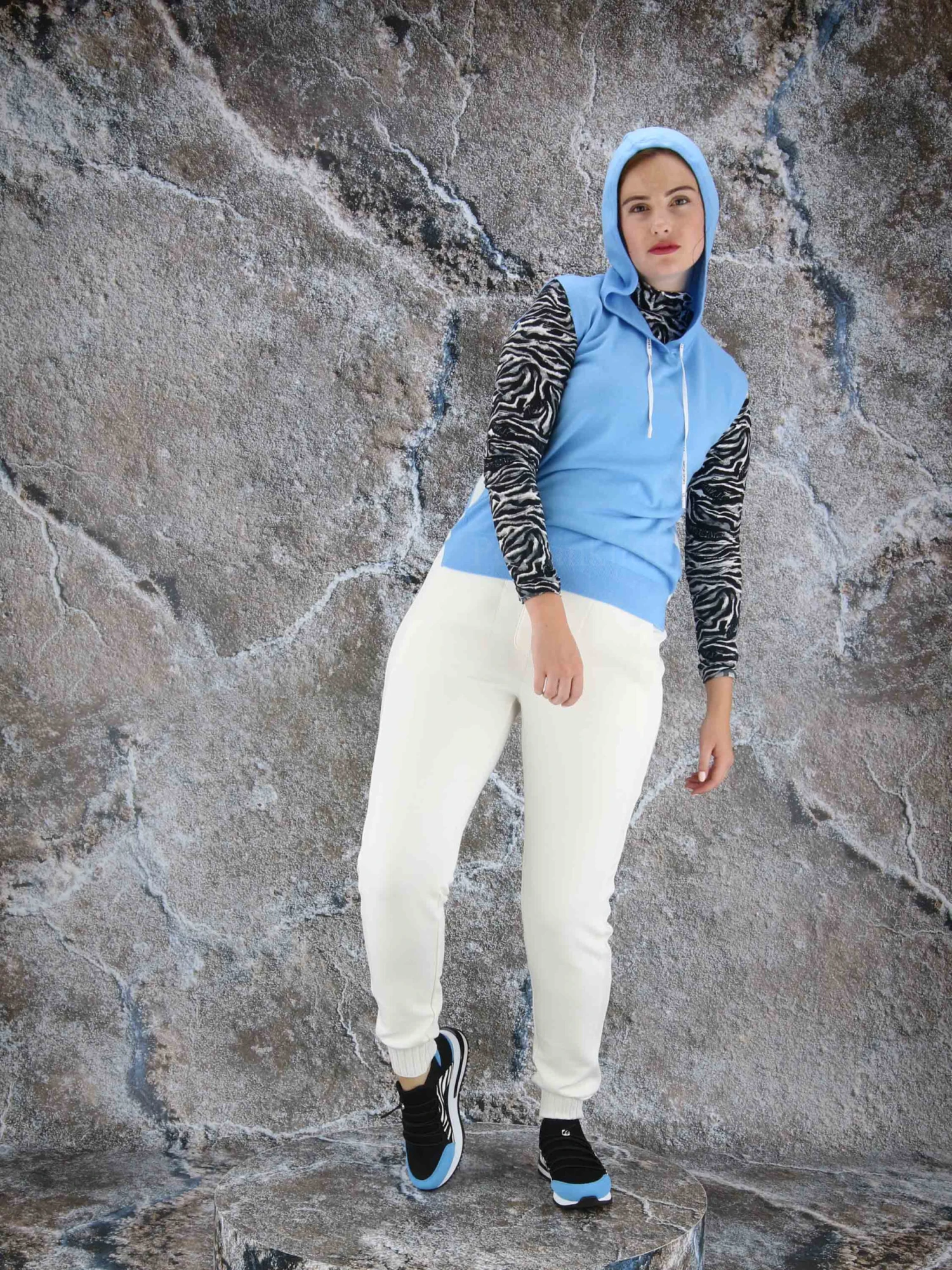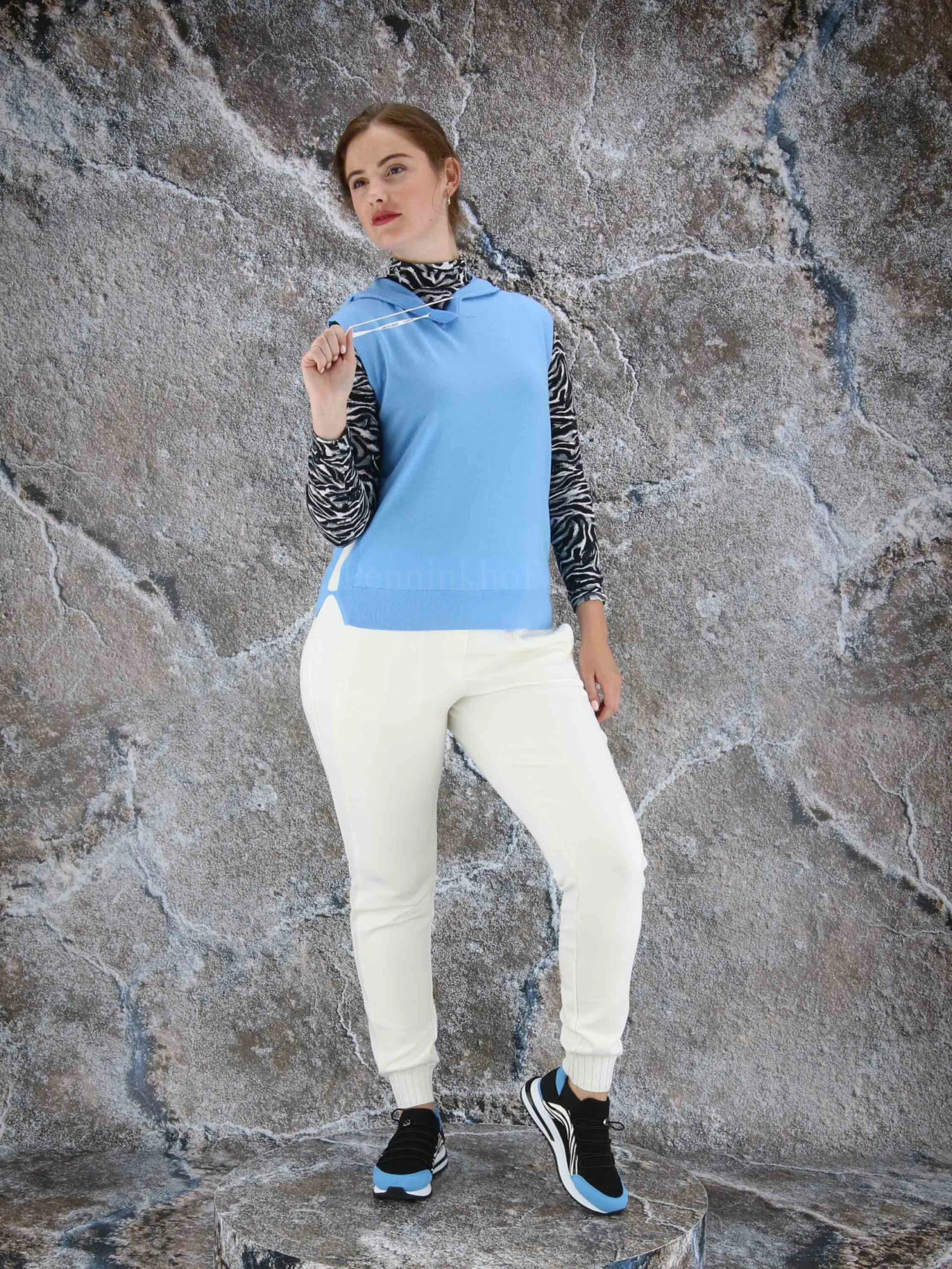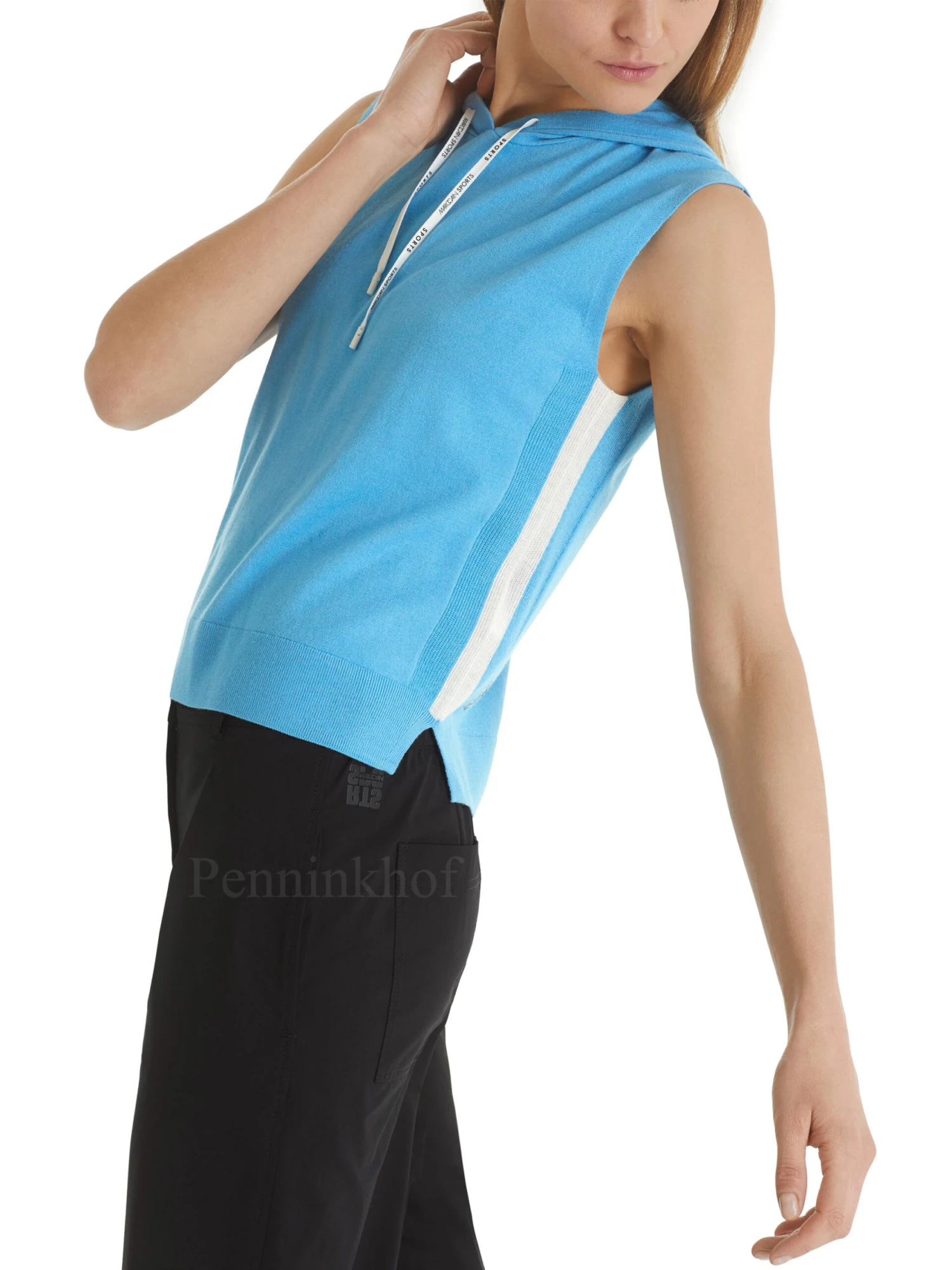 Een top van Marc Cain in de kleur blauw. Vanuit de rand van de hals zijn 2 koorden in een tunnelverwerking. De top heeft een capuchon en langs de zijkanten is een geprinte witte bies. Deze top mag op de hand worden gewassen.