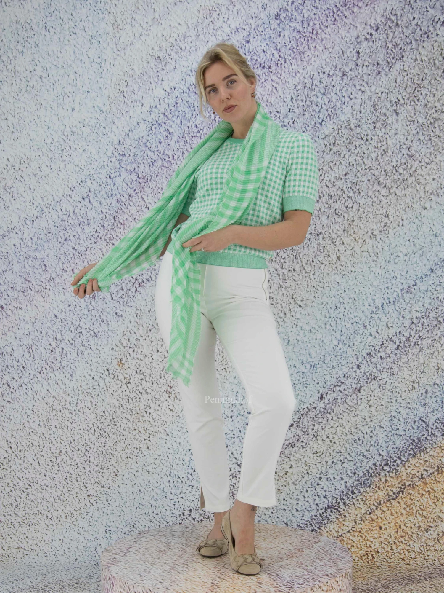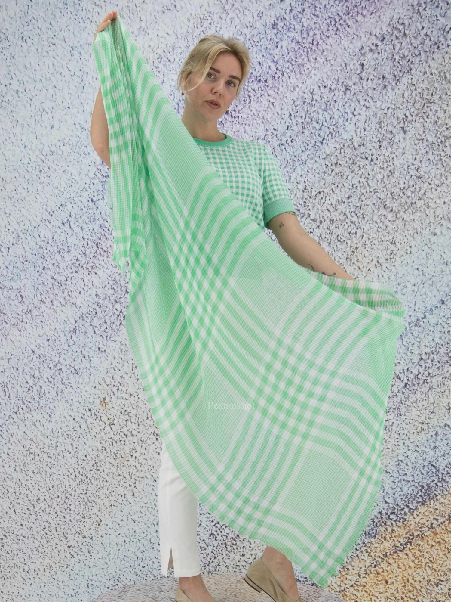 Een licht transparante shawl van Marc Cain in een ruitprint met de kleuren groen en wit. De stof is fijn geplisseerd en langs de rand is de stof fijn gerafeld. Deze shawl mag op de hand worden gewassen.