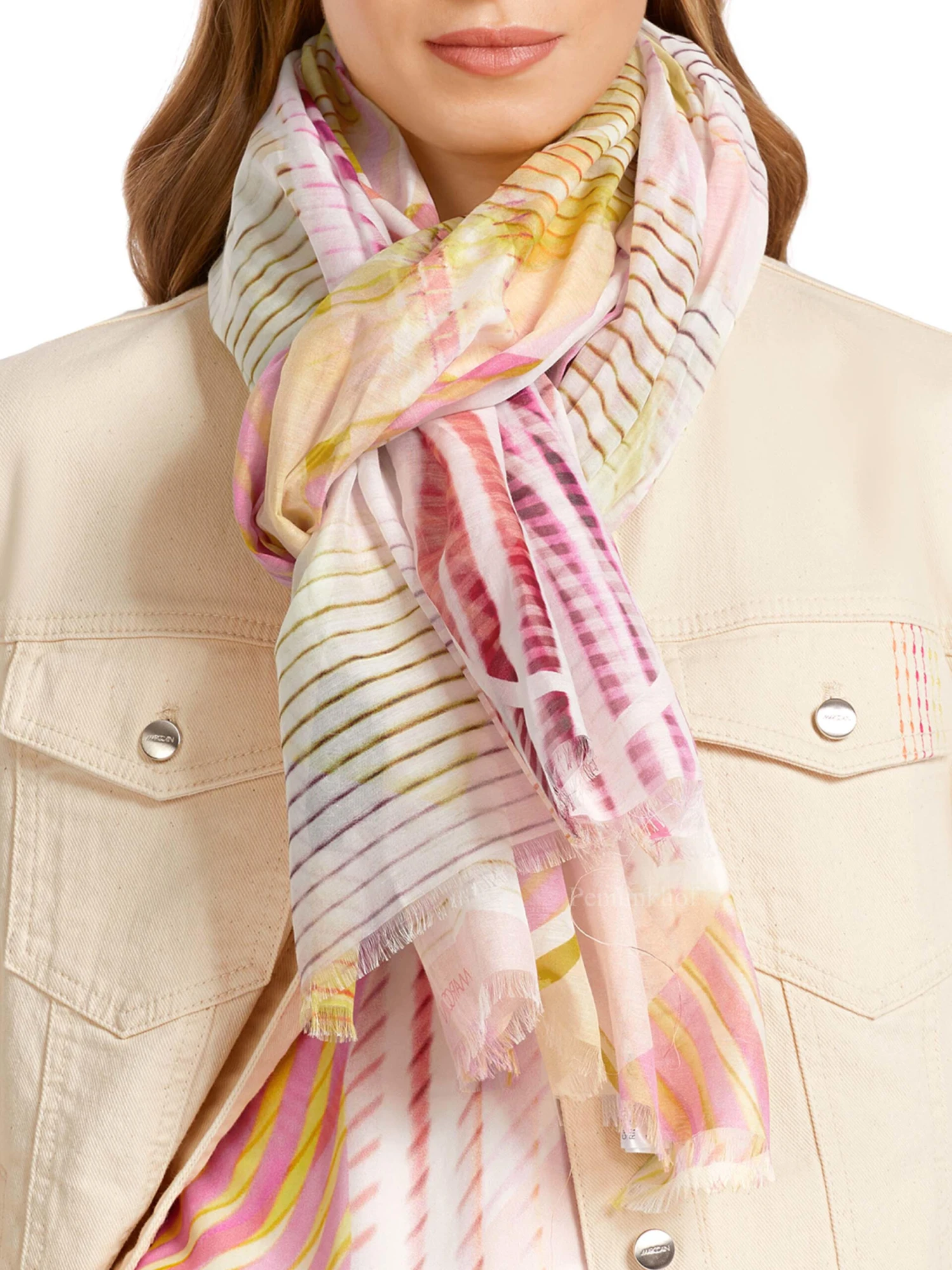 Een licht transparante shawl van Marc Cain in een frisse grafische gestreepte print met de kleuren geel en meerdere tinten fuchsia op een witte achtergrond. De randen van de shawl zijn fijn gerafeld. Deze shawl mag op de hand worden gewassen.
