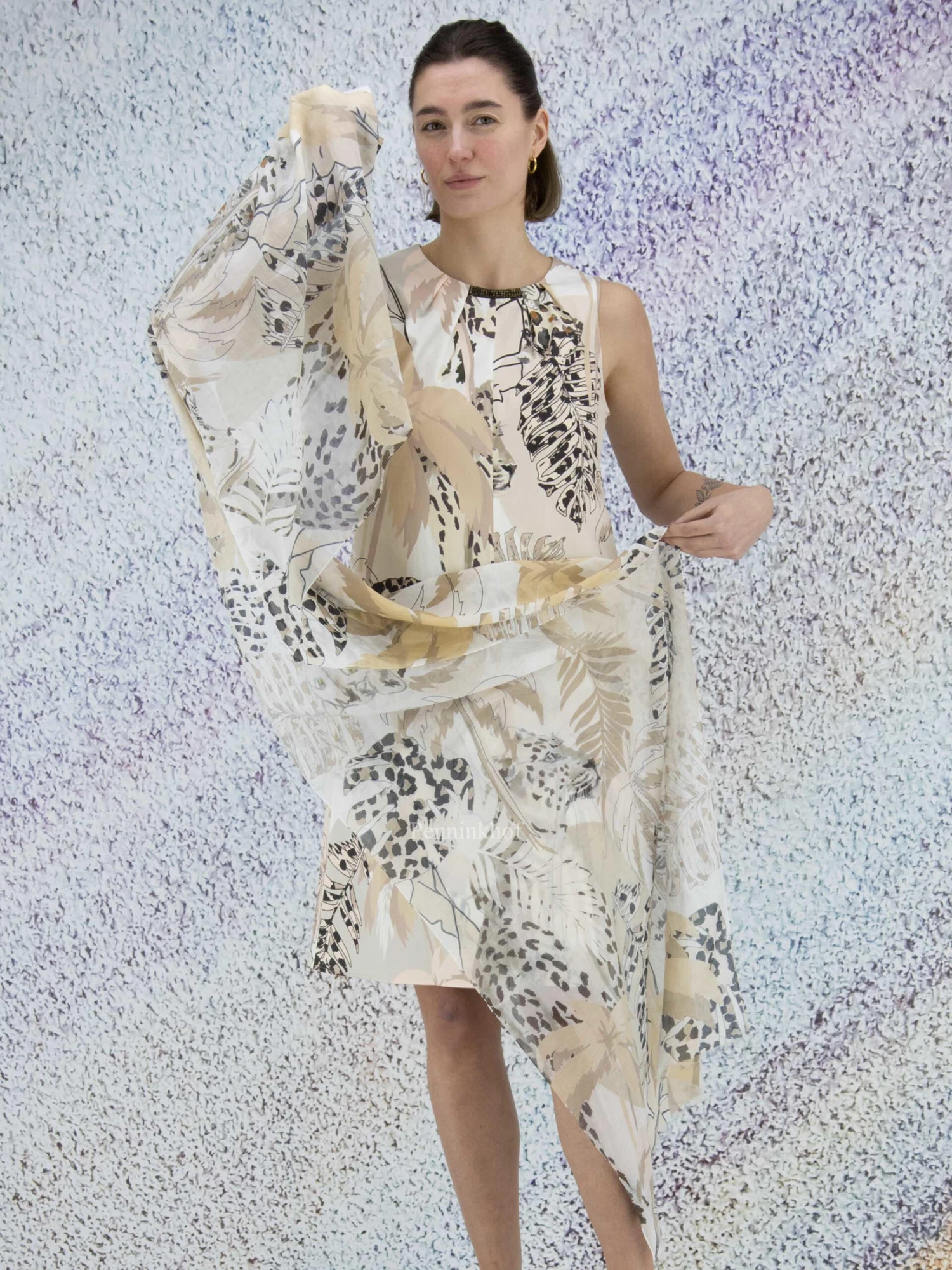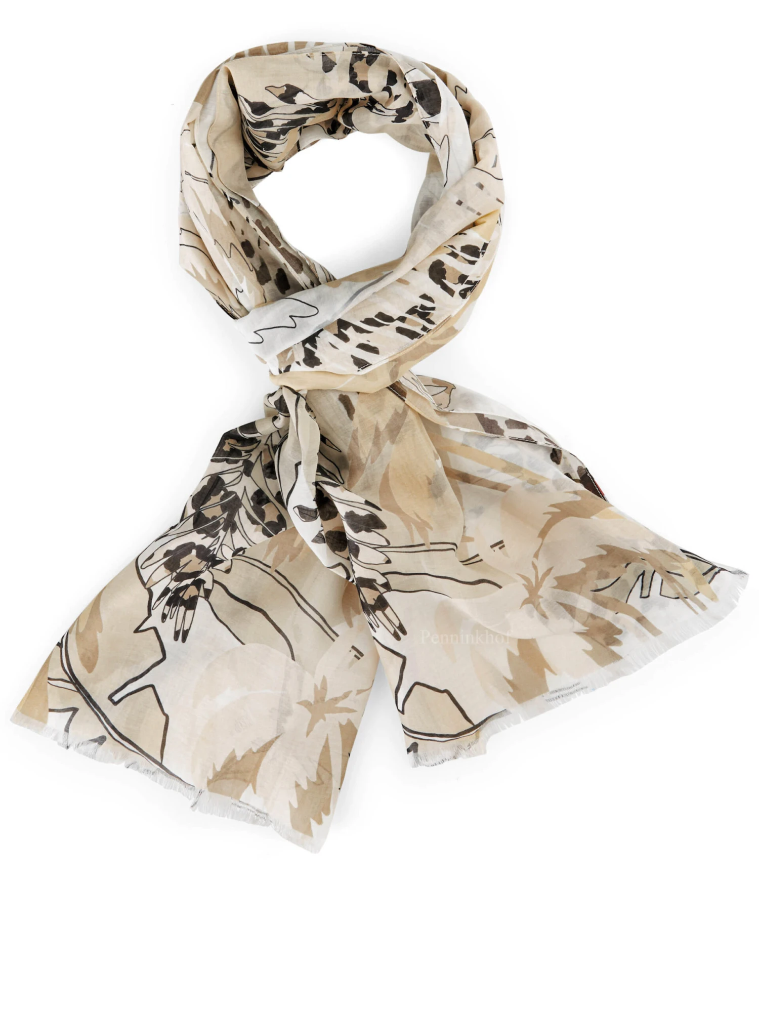 Een licht transparante shawl van Marc Cain in een print van bladeren met een luipaard print in meerdere zandtinten met zwart en roomwit. Deze shawl mag op de hand worden gewassen.