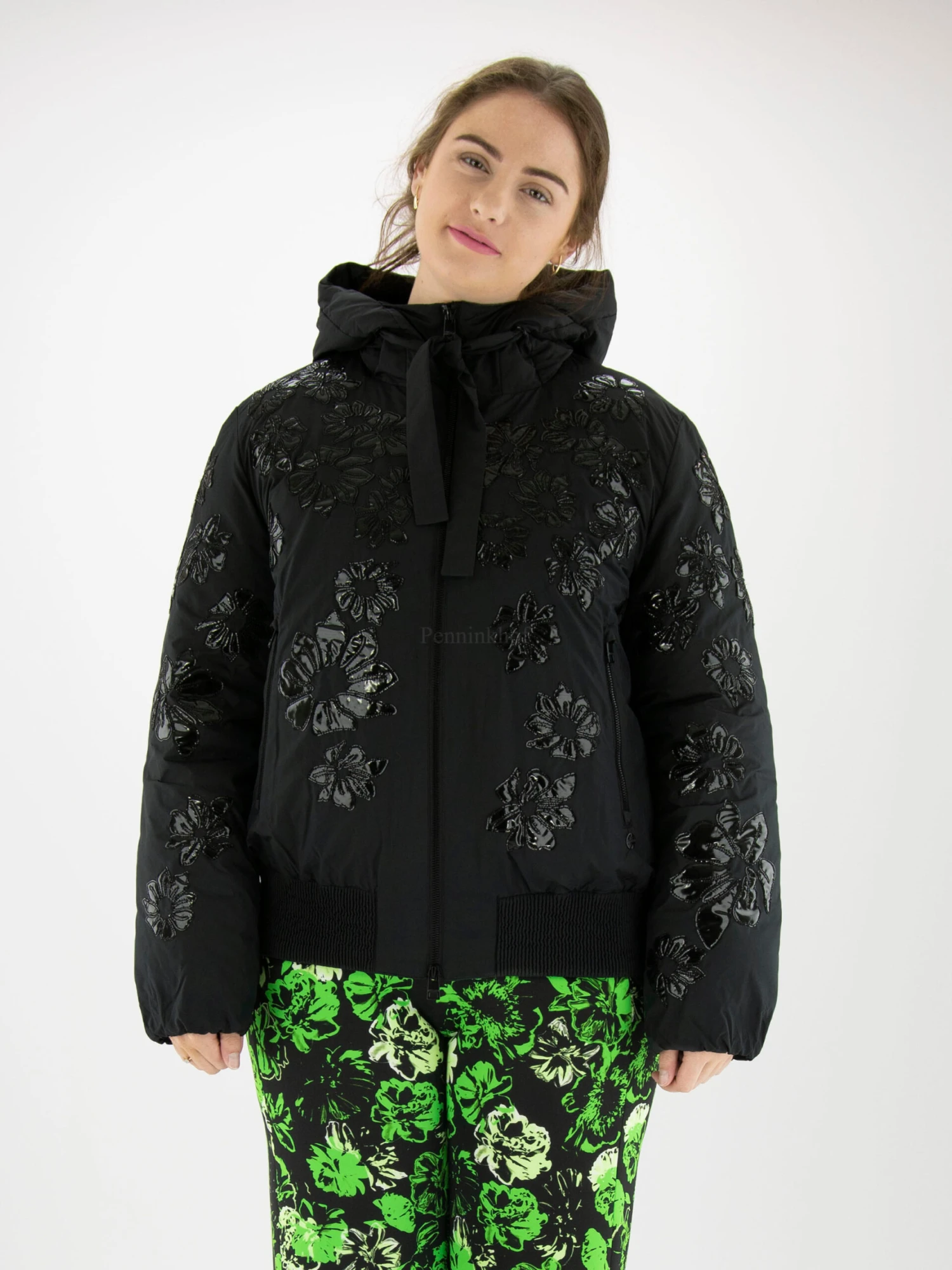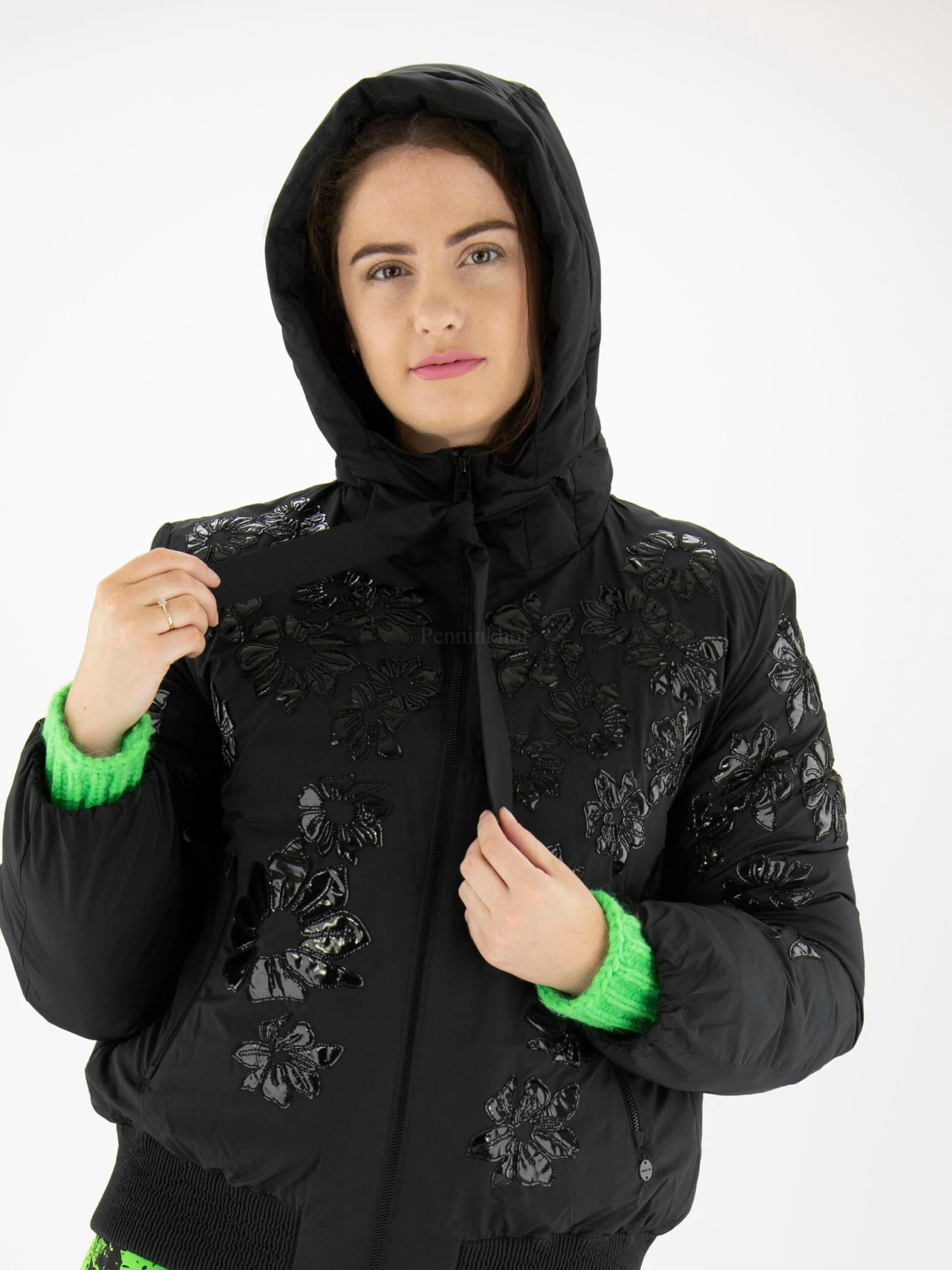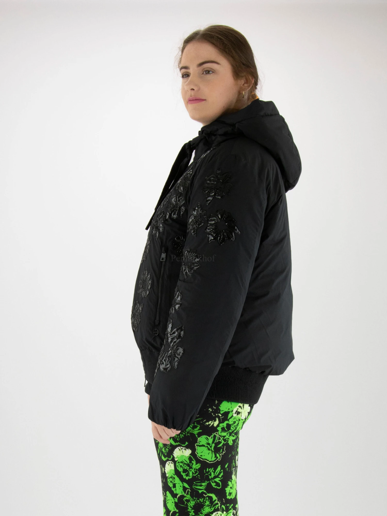 Een coat van Marc Cain in de kleur zwart. Op de stof zijn bloemen bevestigd in een zwarte lak stof. In de rand van de capuchon is een lint waarmee de capuchon kan worden aangetrokken. Aan de onderkant is een elastische en fijn geribbelde brede boord. De coat mag op 30 graden worden gewassen.