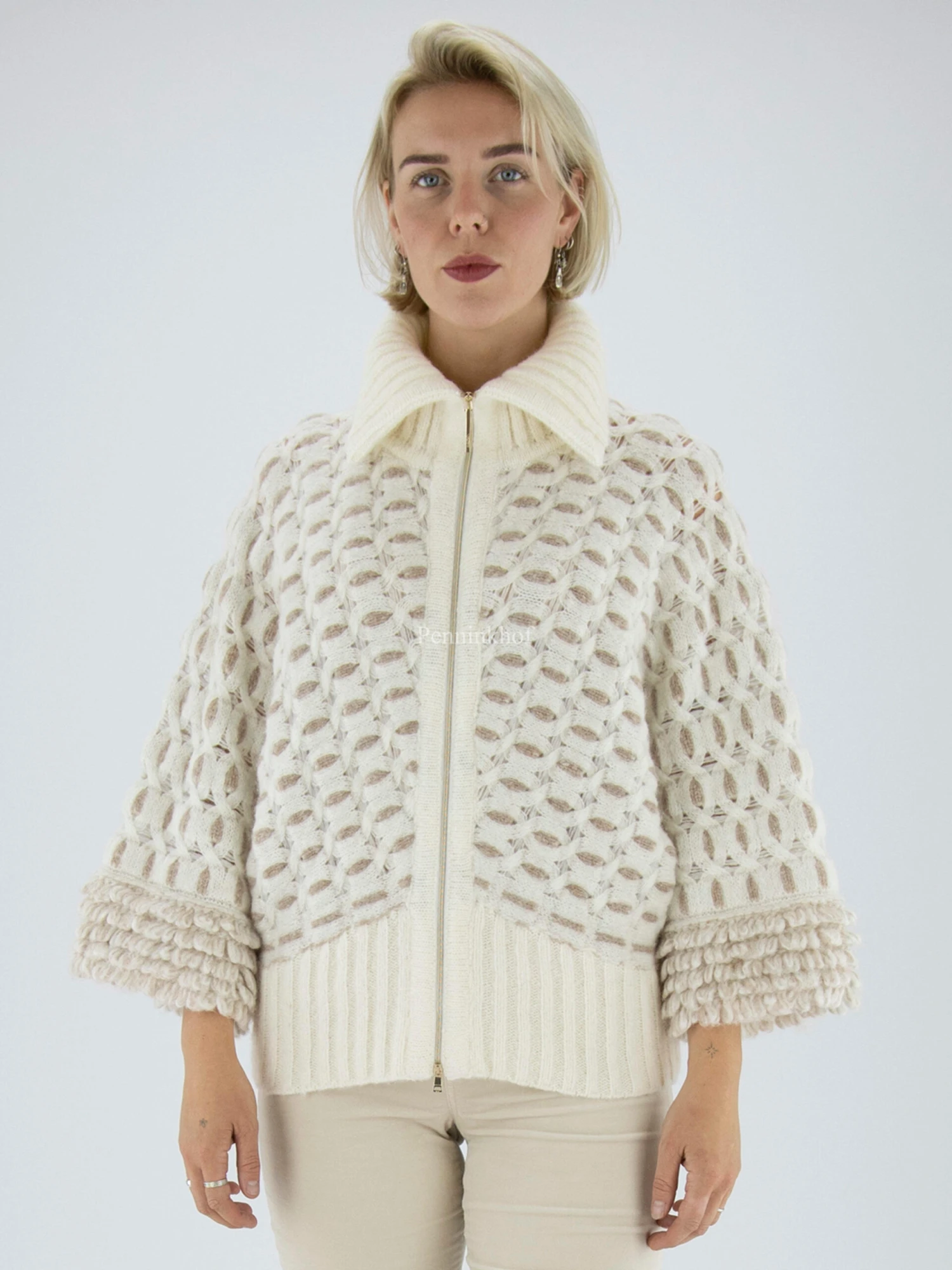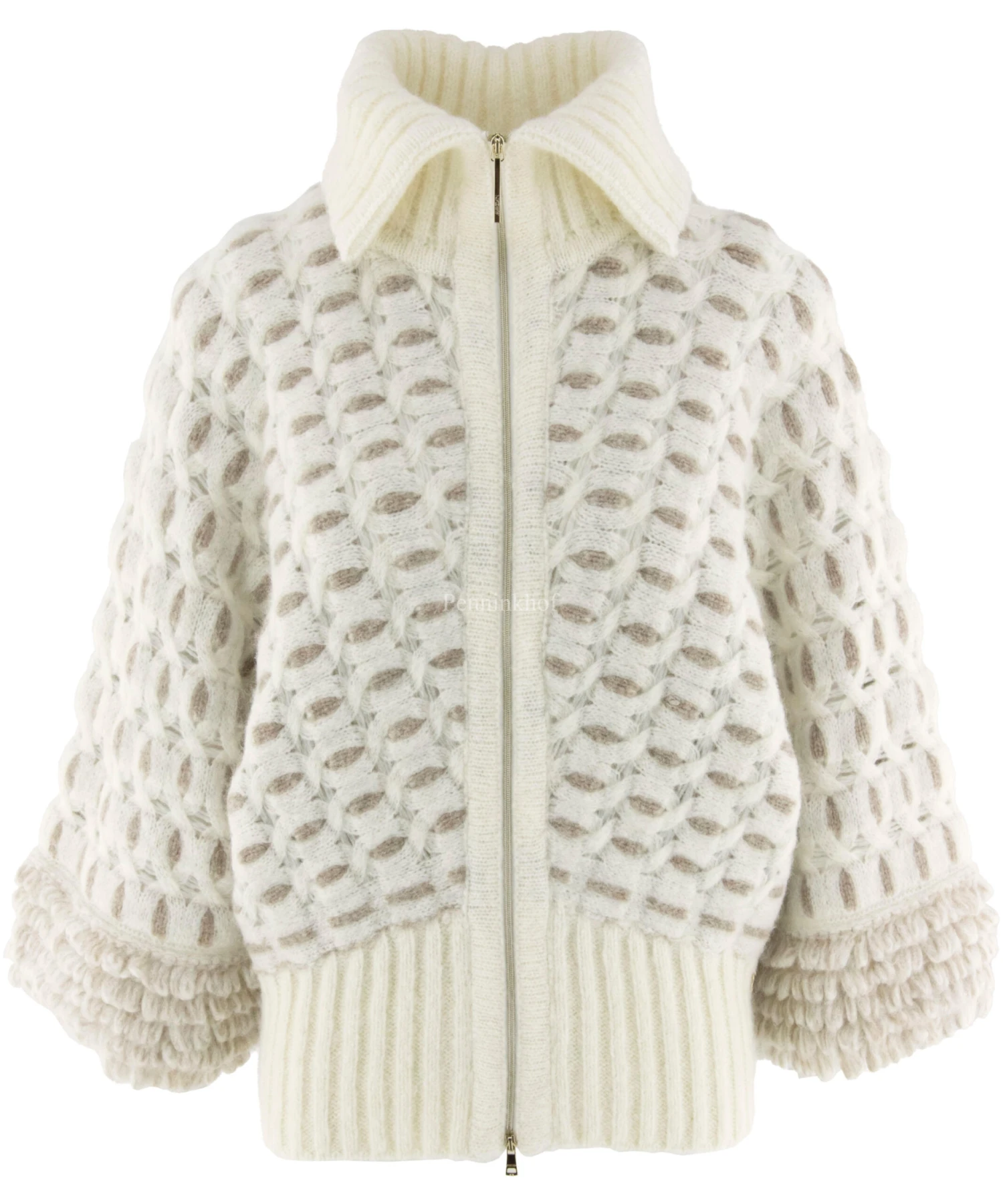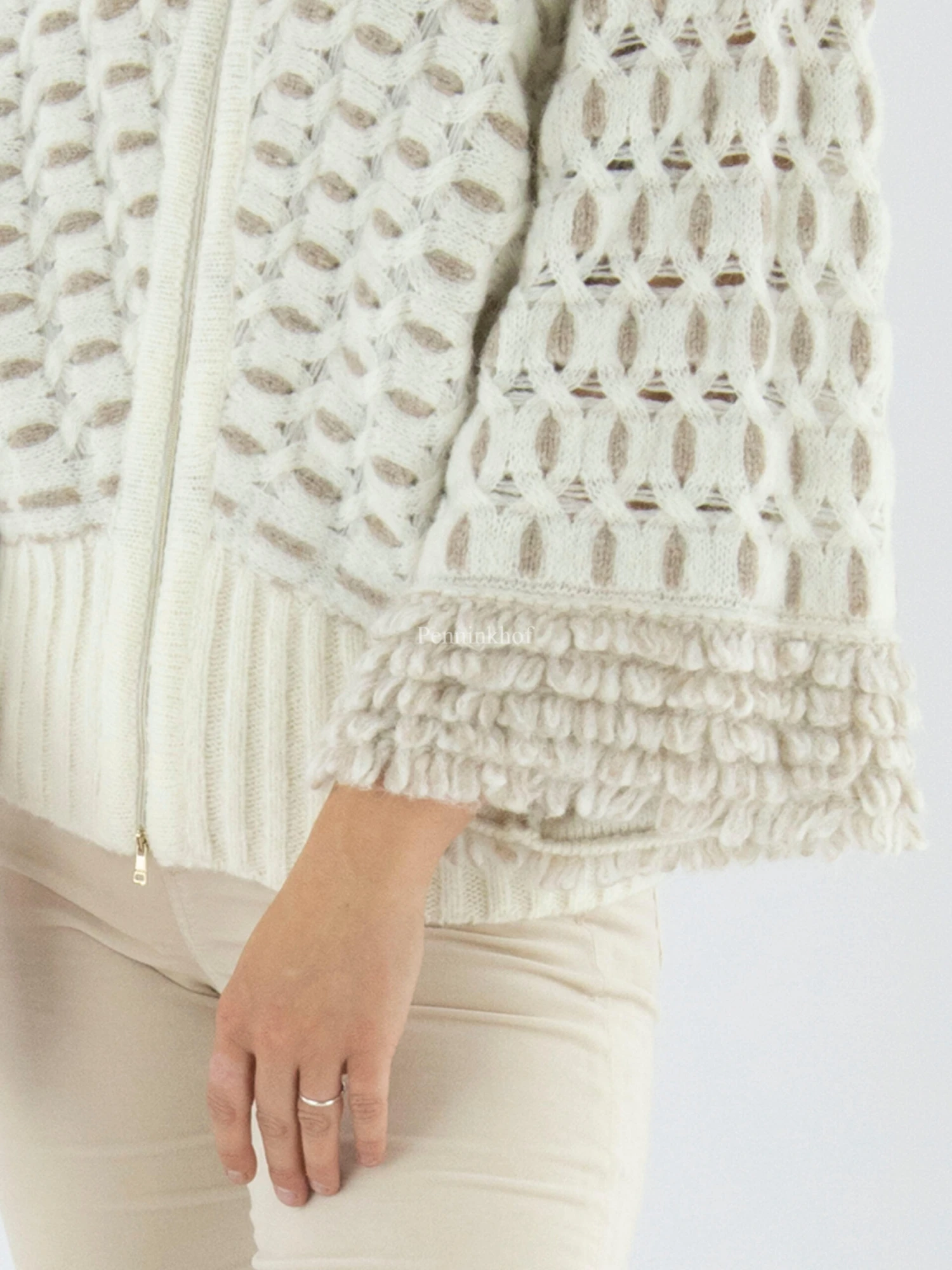 Een kort cape vest van Marc Cain in een grafisch patroon met de kleuren beige en roomwit. Het vest heeft vleermuismouwen en in het midden is een platina kleurige ritssluiting. Dit vest mag op de hand worden gewassen.