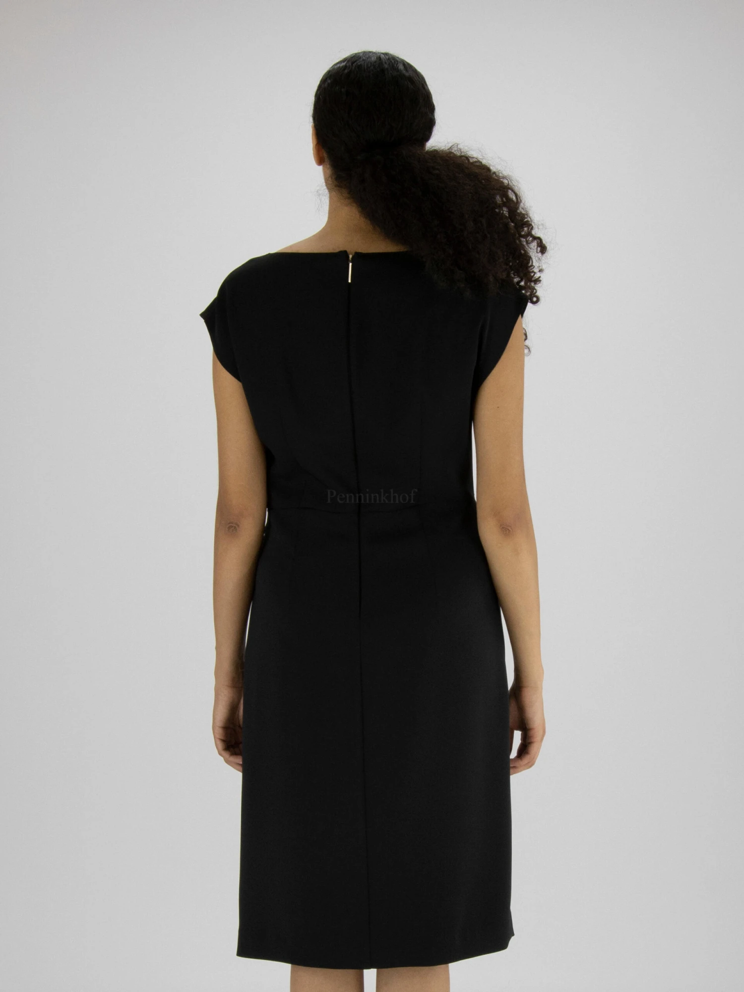 Een jurk van Marc Cain in de kleur zwart. Ter hoogte van de taille is de stof aan de linker zijkant geplooid wat een drapeer effect creëert. Aan de onderkant is links van het midden een split tot onder de knie. De jurk heeft een ronde hals en aan de achterkant is in het midden een rits tot onder de taille. Deze jurk mag op de hand worden gewassen.