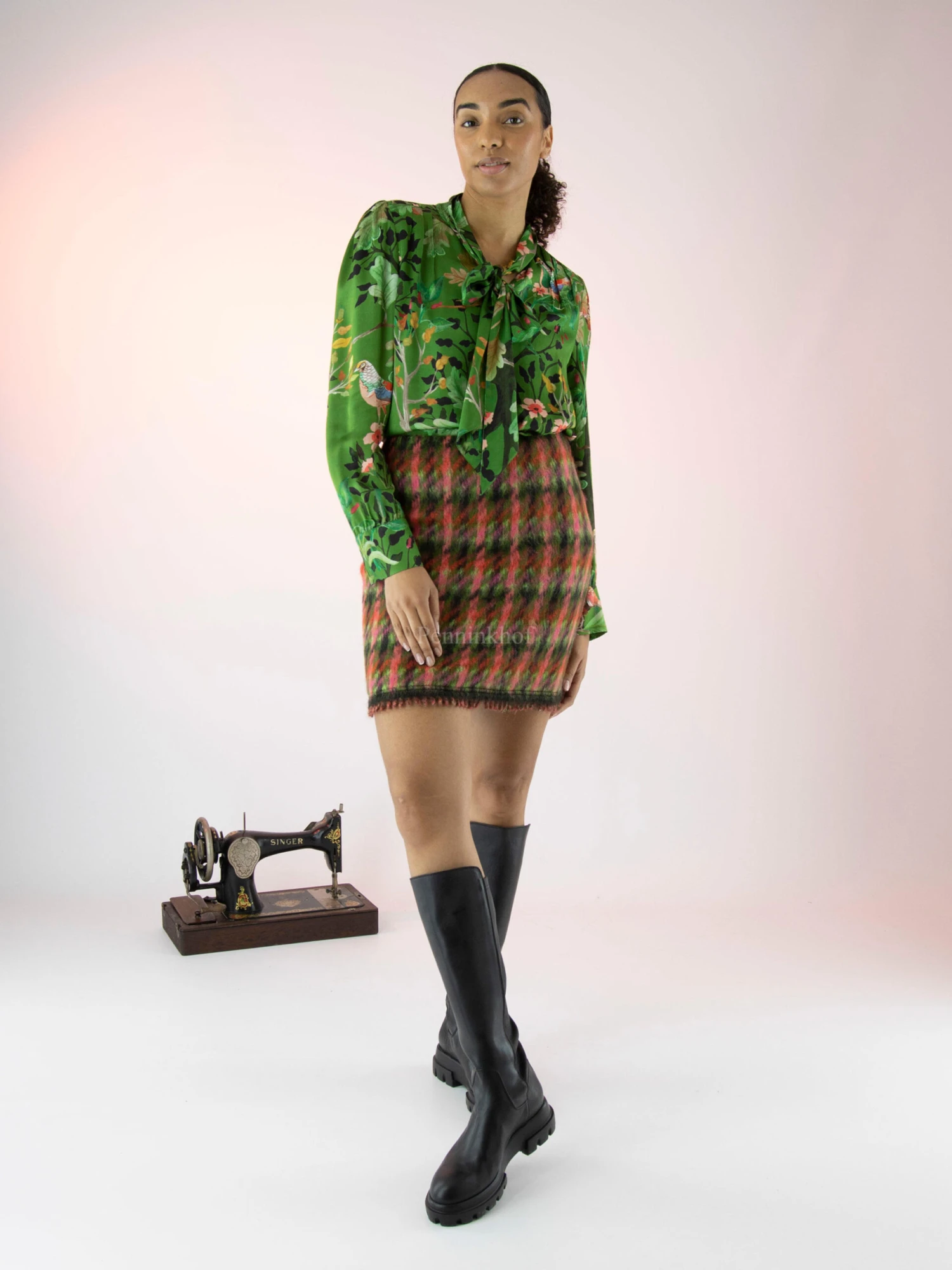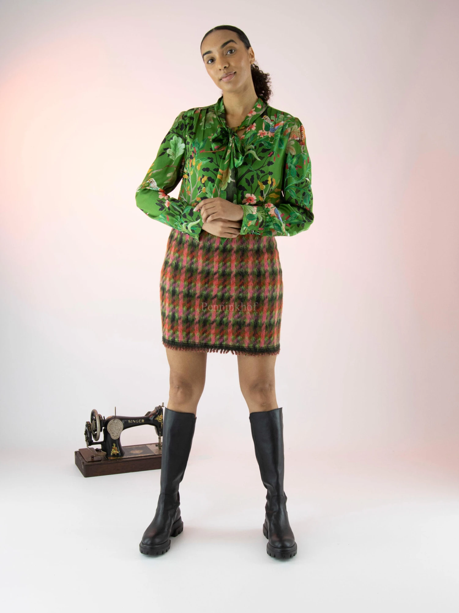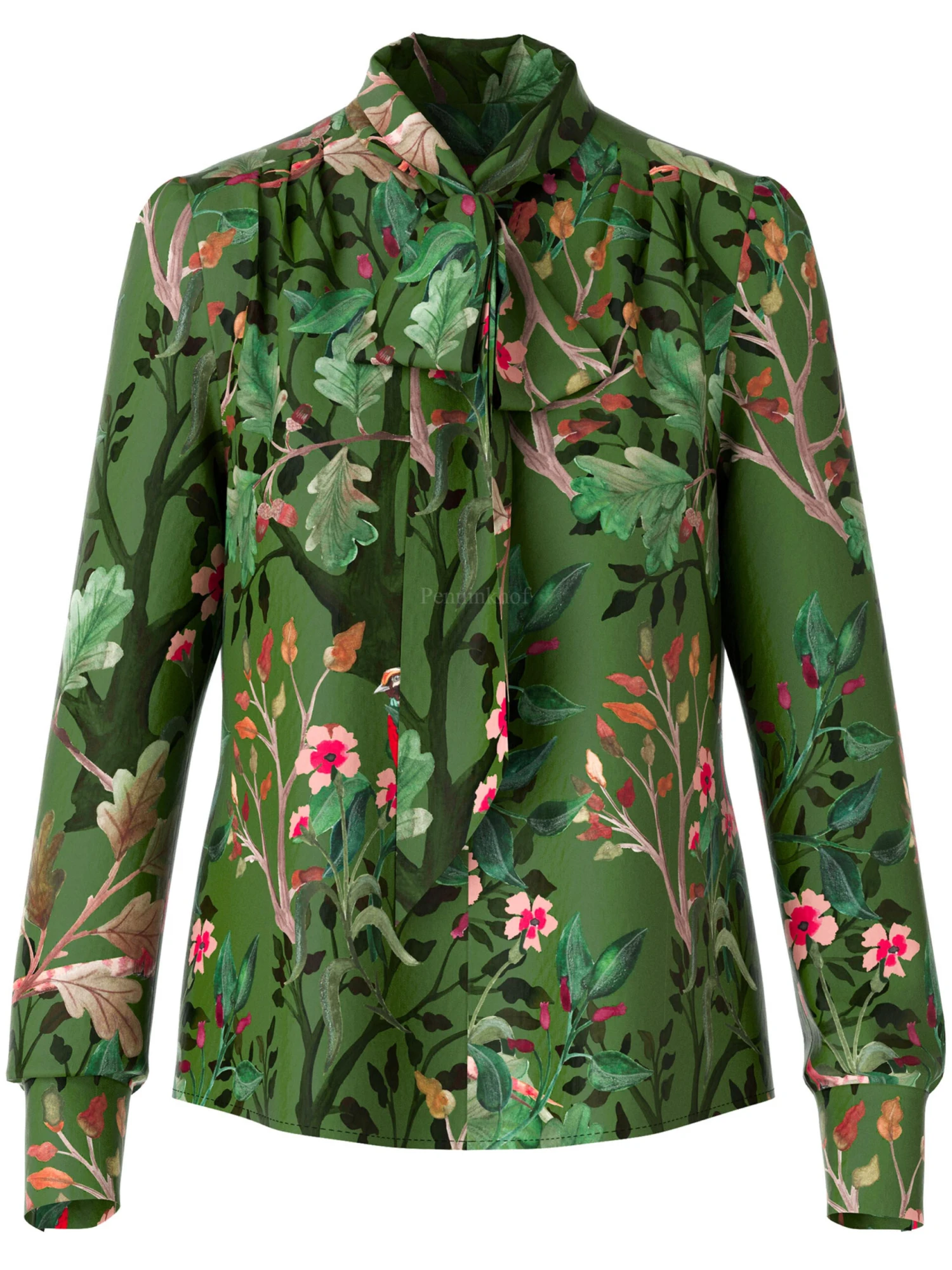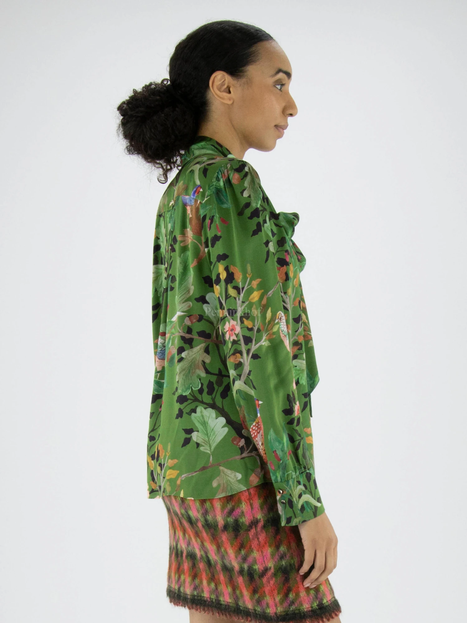 Een blouse van Marc Cain in een bloemen en dierenprint met meerdere tinten geelen roze op een groene achtergrond. Vanuit de hals zijn 2 linten waarmee een decoratieve knoop kan worden gemaakt. Aan de achterkant is ter hoogte van de schouderbladen een stiknaad met in het midden 2 plooien. Deze blouse mag op 30 graden worden gewassen.