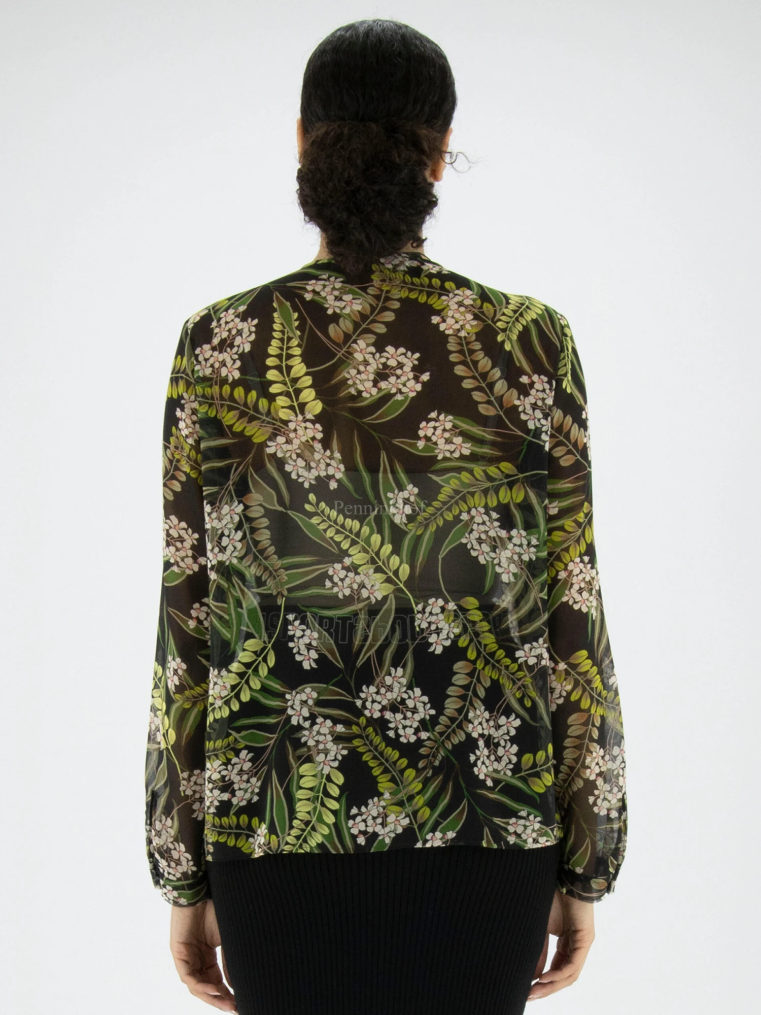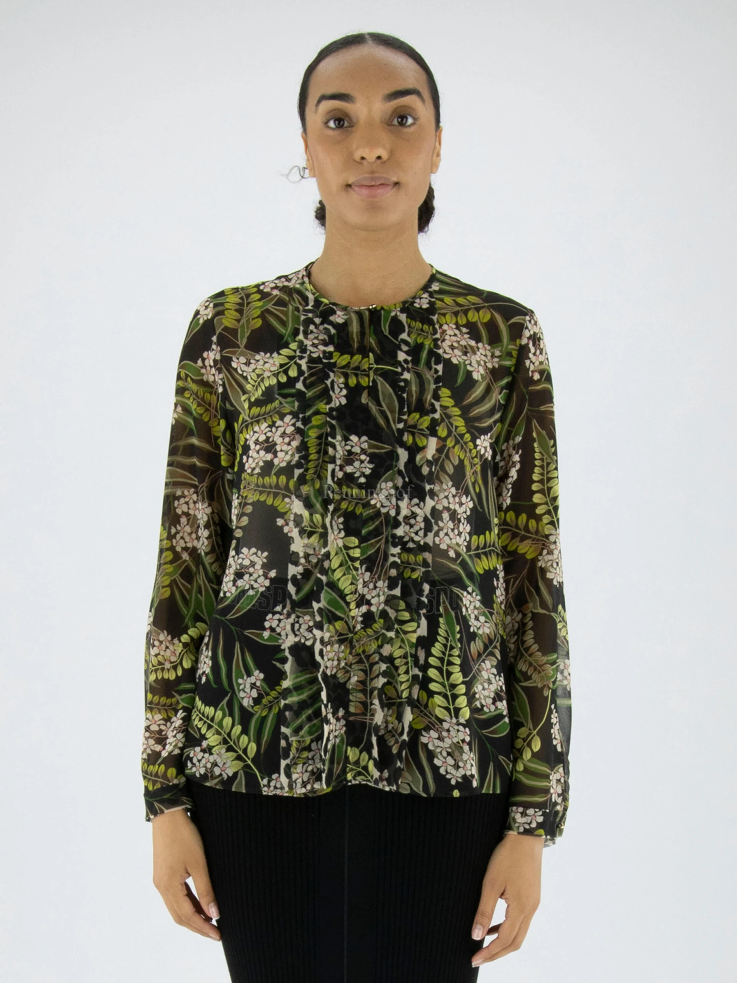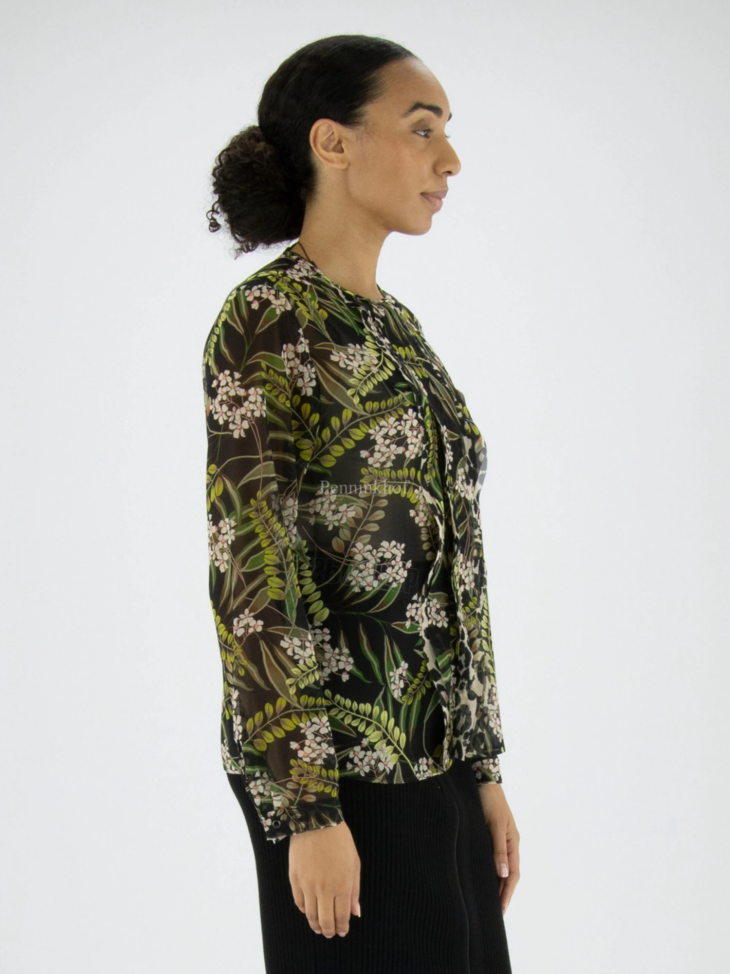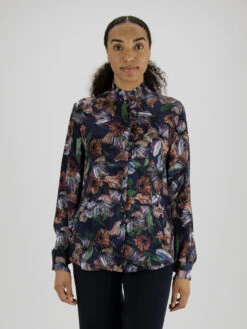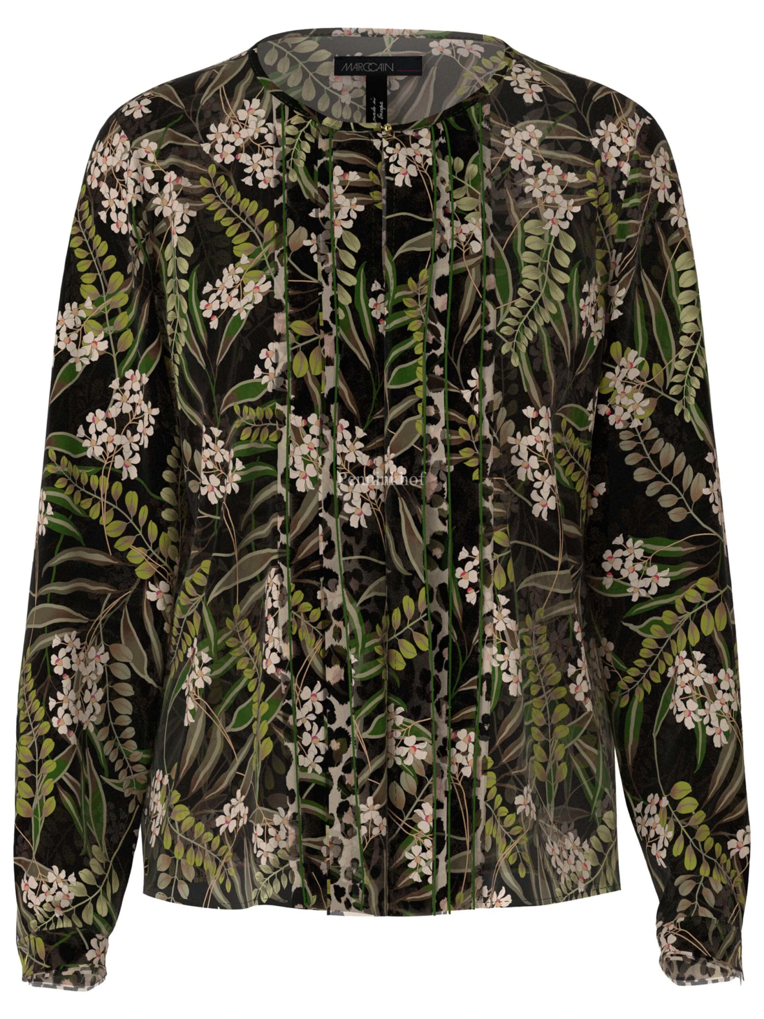 Een licht transparante blouse van Marc Cain in een print van lelietjes van dalen. Vanuit de hooggesloten ronde hals is een uitsnijding in het midden tot aan de buste. Langs de uitsnijding en de naad is aan beide kanten een bies van een 3 dubbele stof. Deze blouse mag op 30 graden worden gewassen.