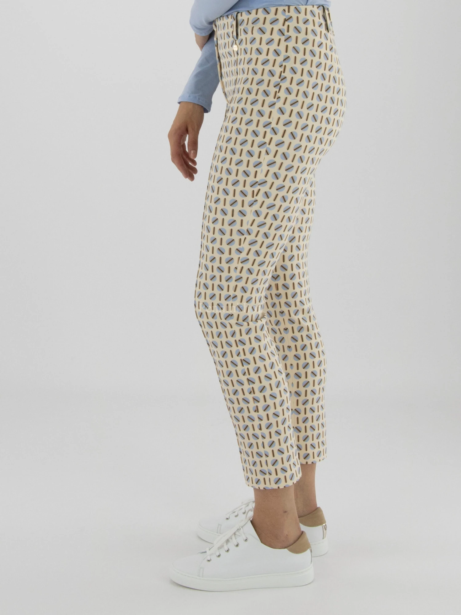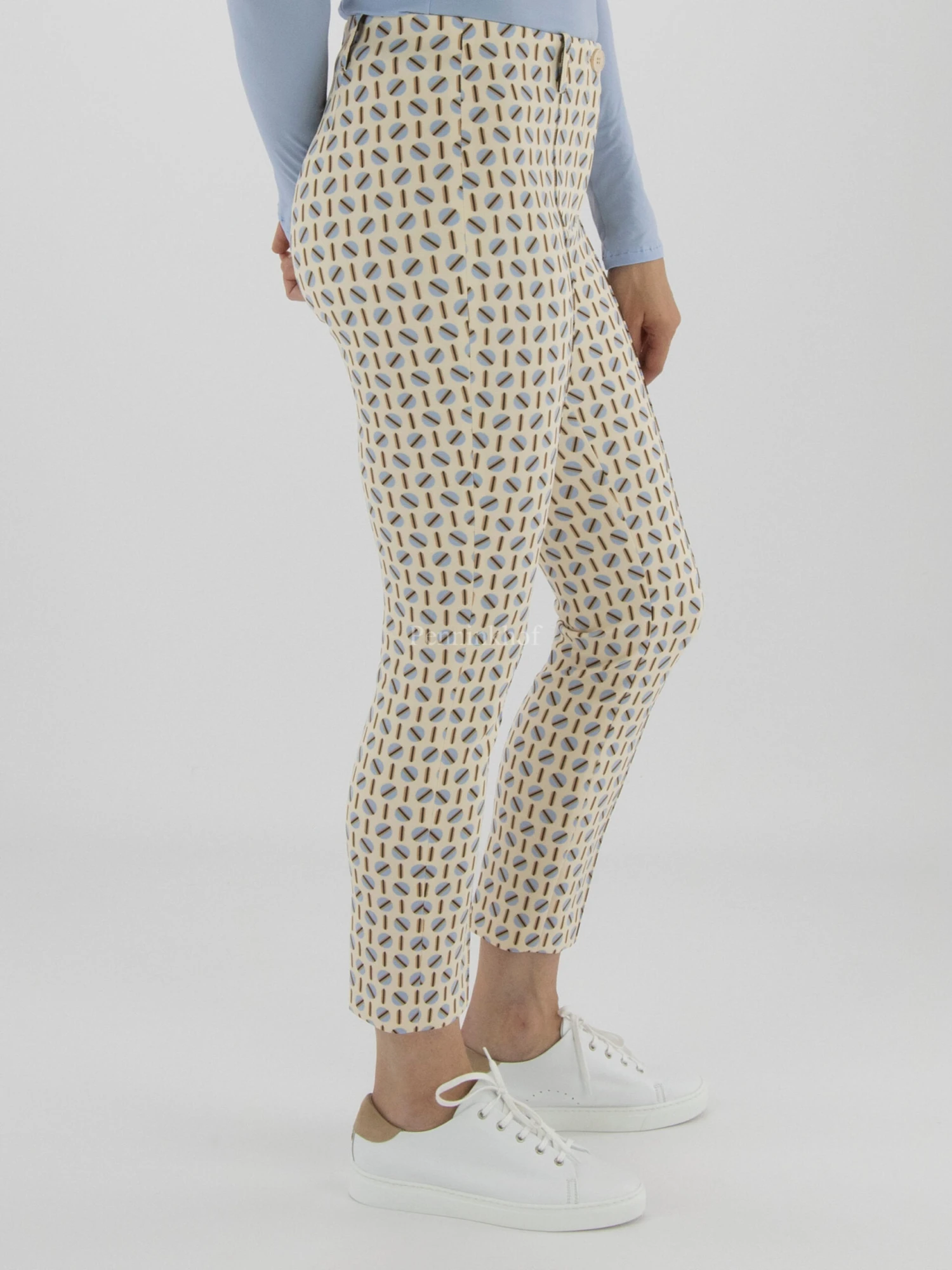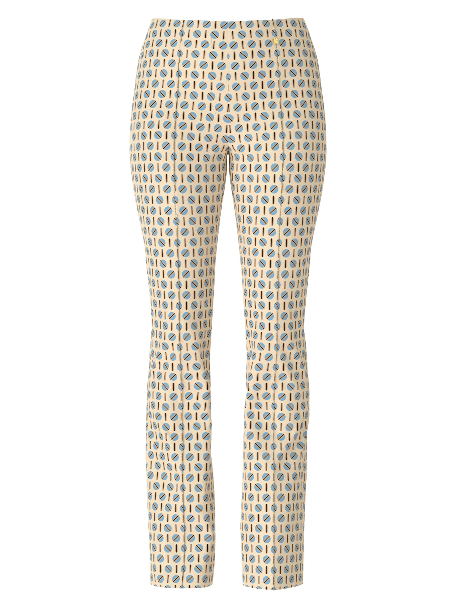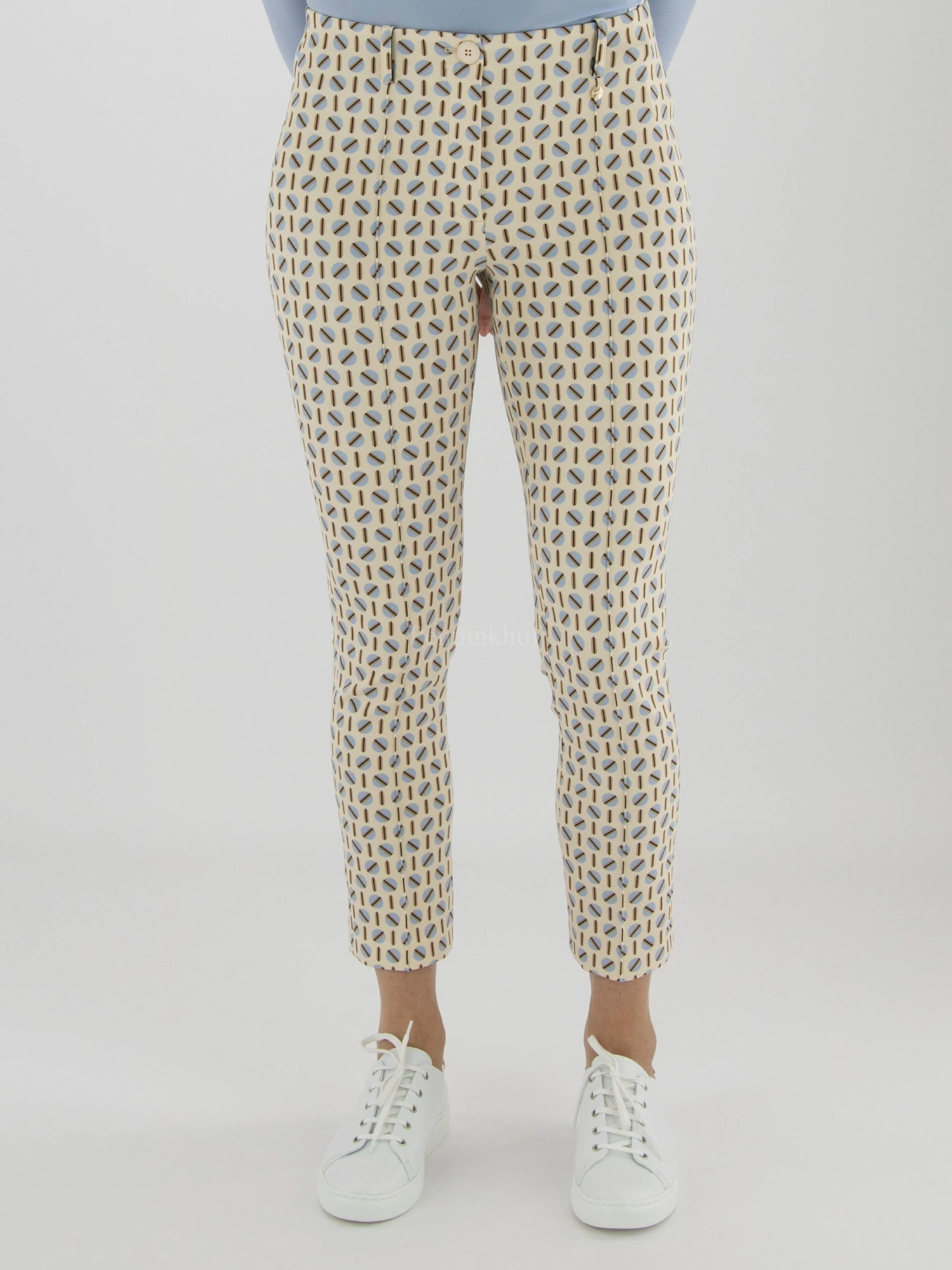 Een broek van Marc Cain in een grafische print met de kleuren ijsblauw, zwart en taupe op een zandkleurige achtergrond. In de taille is een elastieken band. In het midden van de pijpen is een stiknaad over de gehele lengte. deze broek mag op 30 graden worden gewassen.