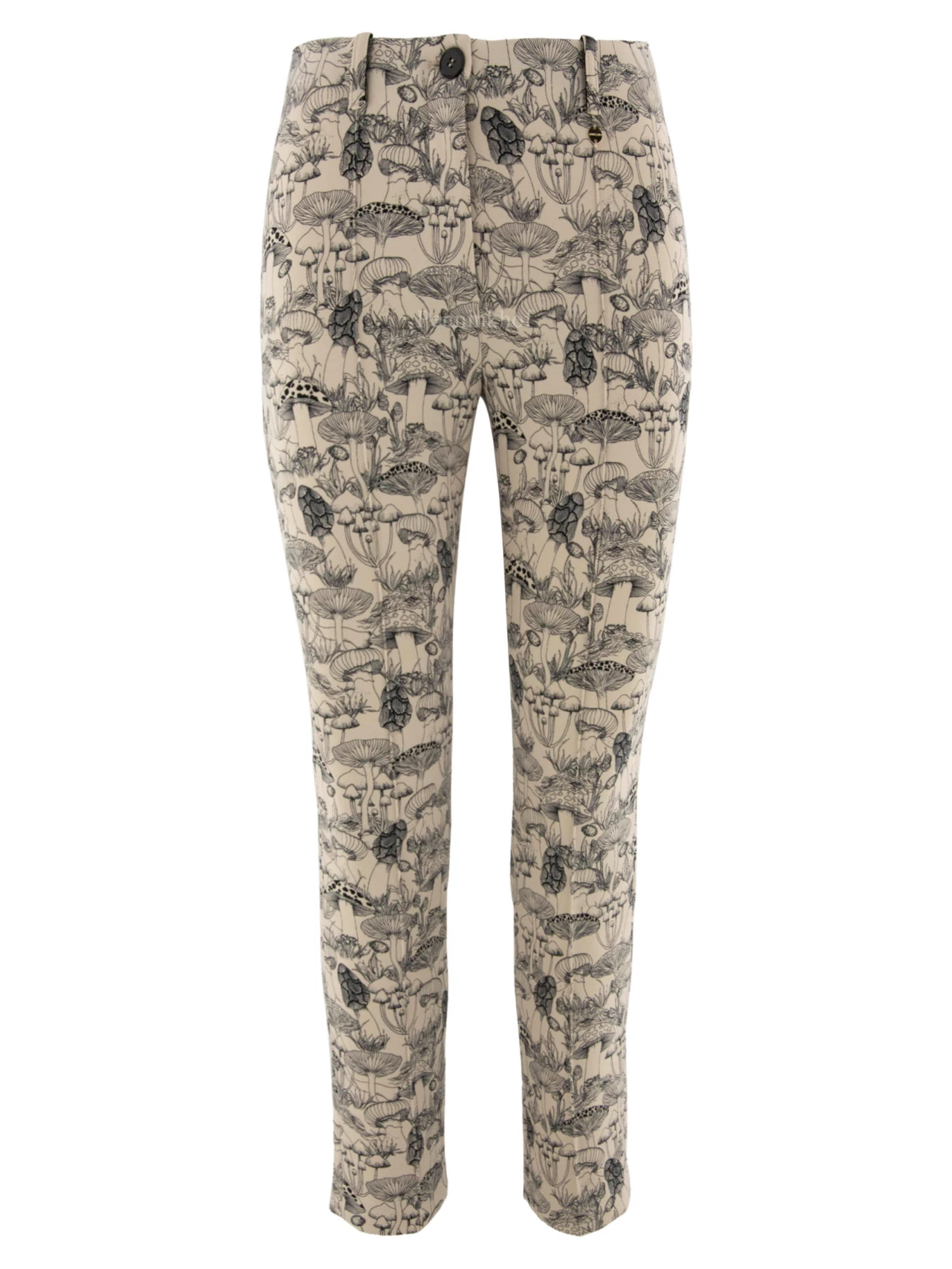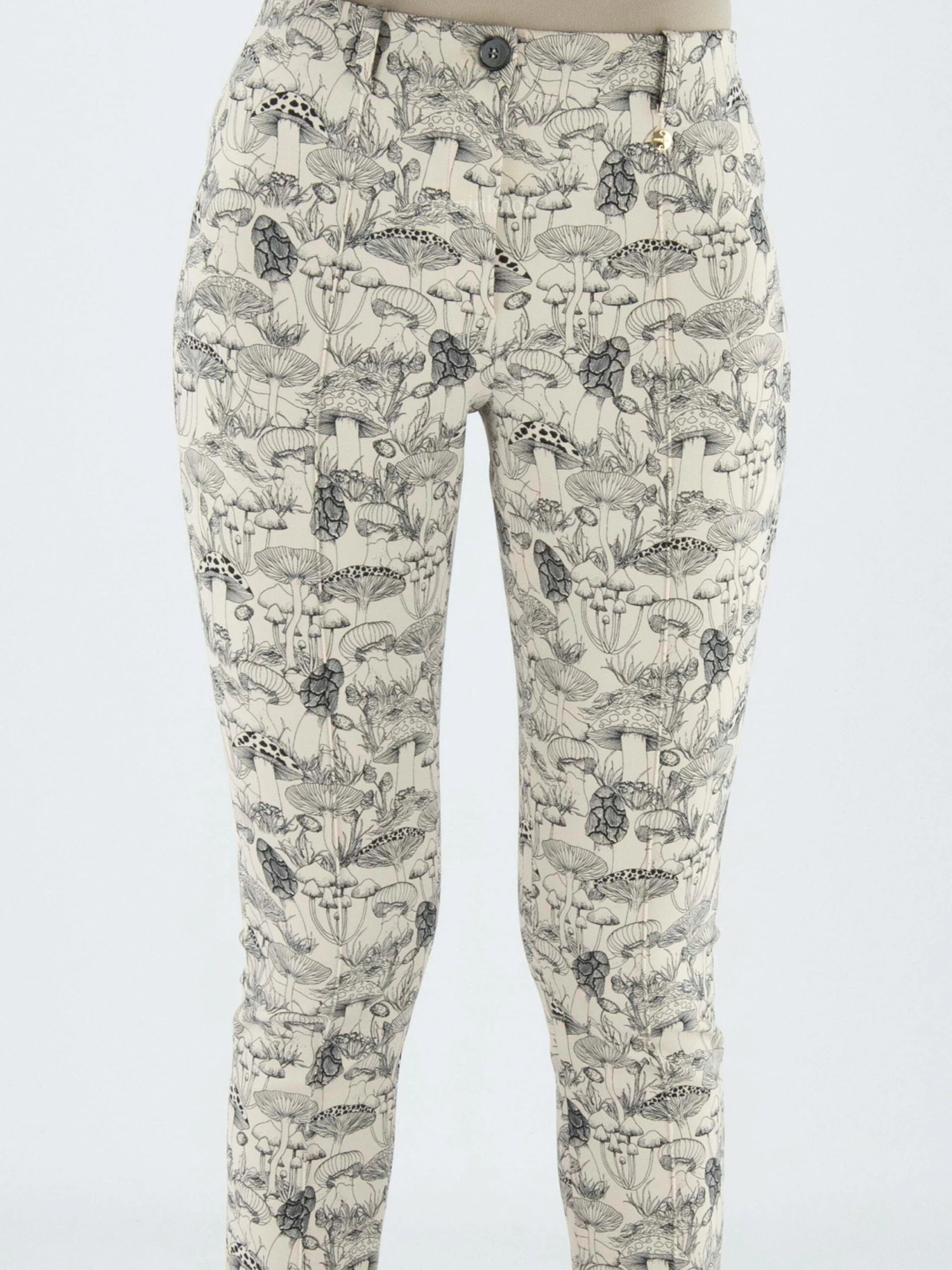 Een broek van Marc Cain in een getekende print van paddestoelen in het zwart op een beige achtergrond. In de taille is een elastieken band. In het midden van de pijpen is een stiknaad. deze broek mag op 30 graden worden gewassen.