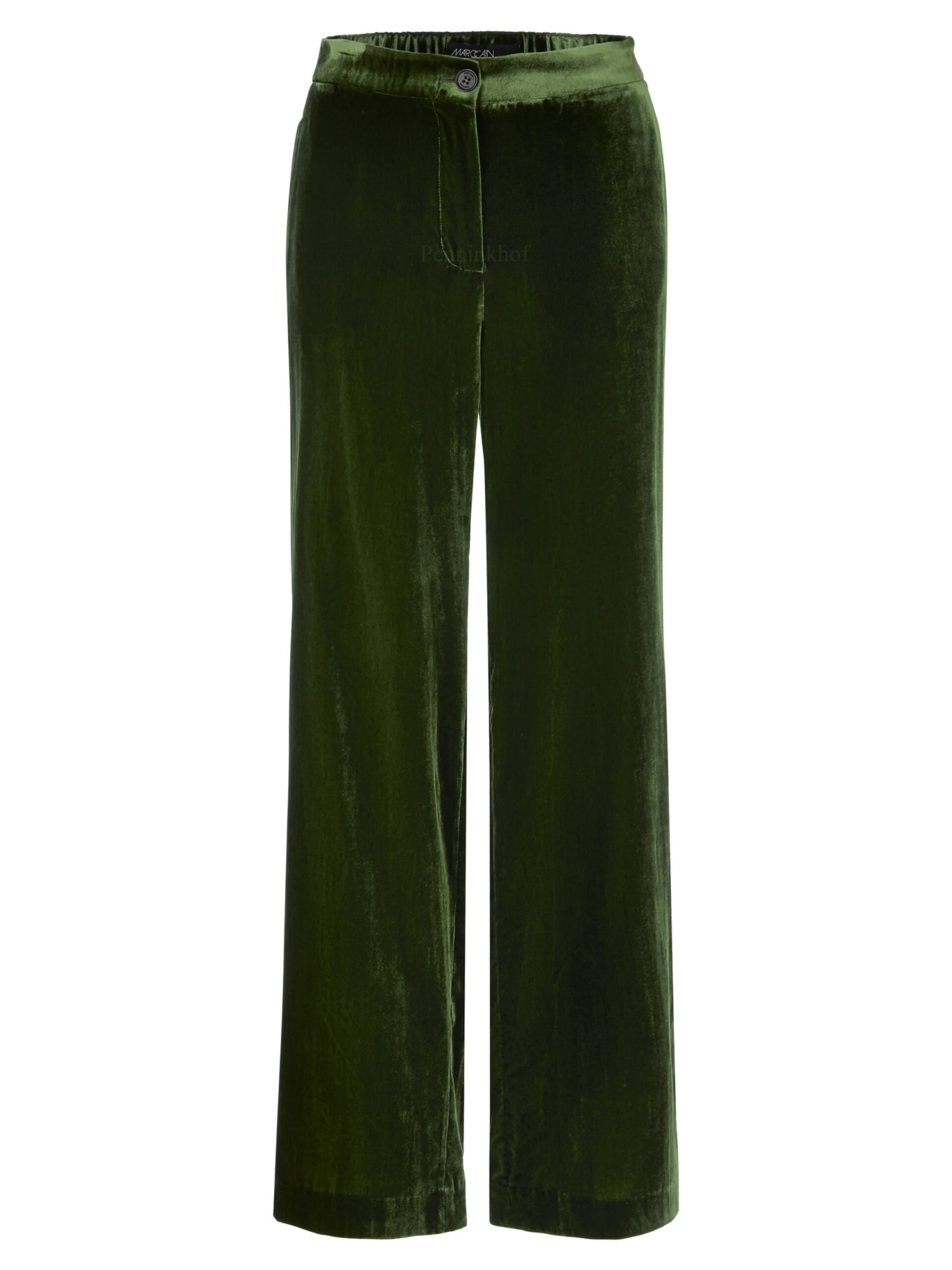 Een rechtgesneden broek van Marc Cain in een velourkwaliteit in de kleur groen. De broek heeft steekzakken en mag op 30 graden worden gewassen.
