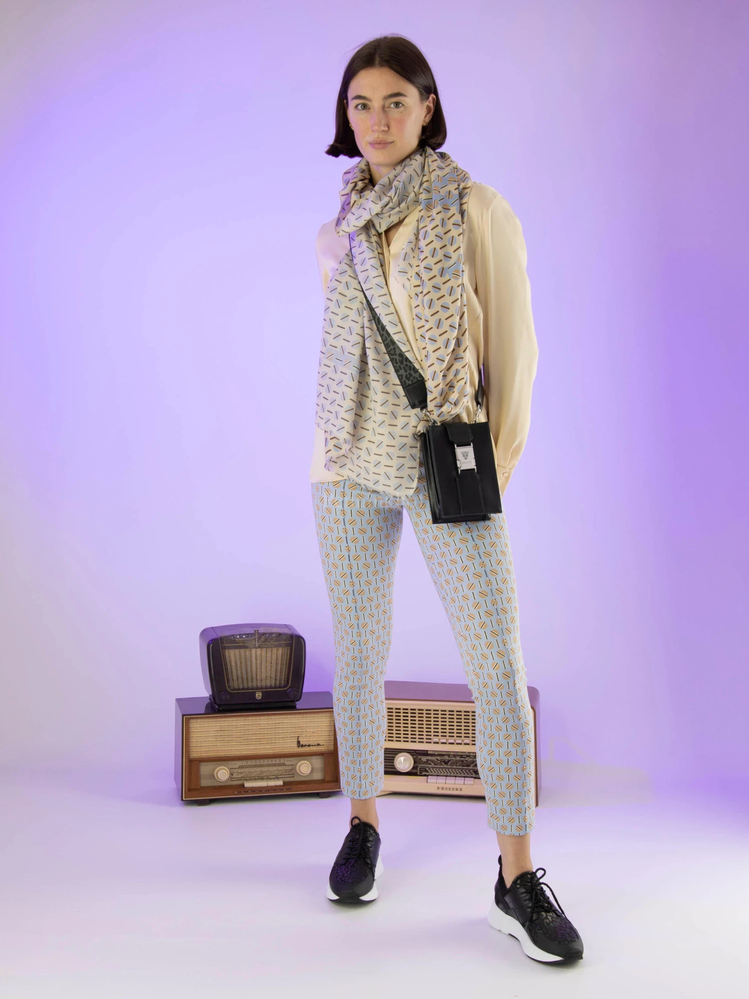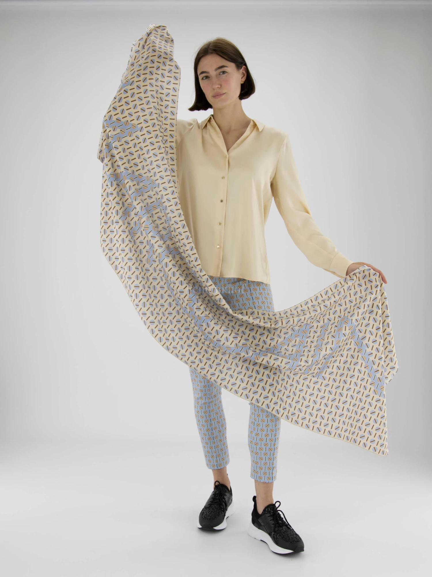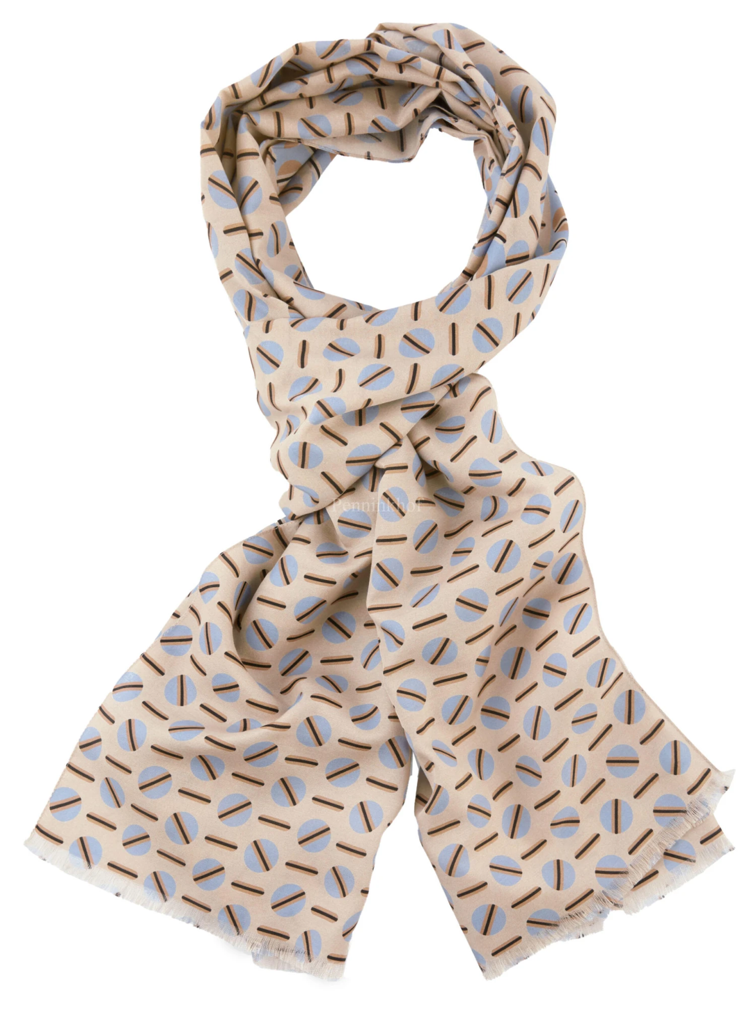 Een shawl van Marc Cain in een grafische print met de kleuren ijsblauw, zwart en taupe op een zandkleurige achtergrond. De uiteinden van de shawl zijn fijn gerafeld. deze shawl mag op de hand worden gewassen.