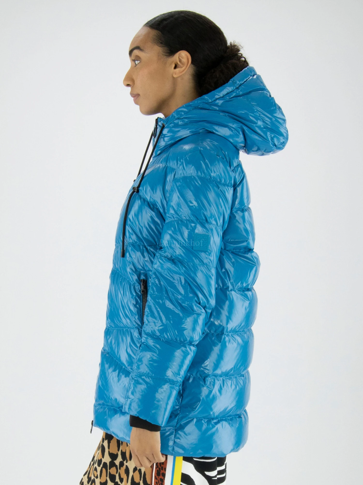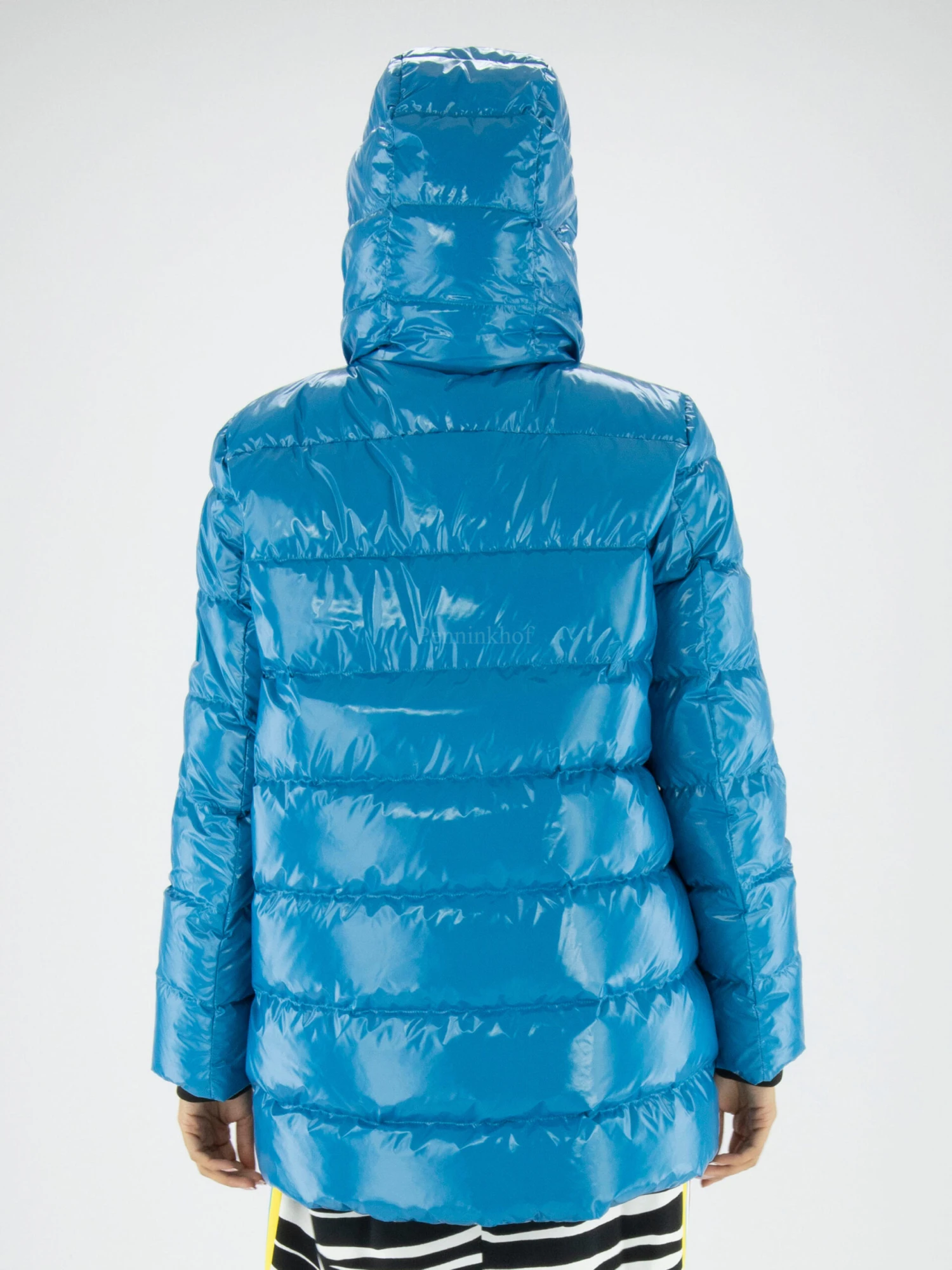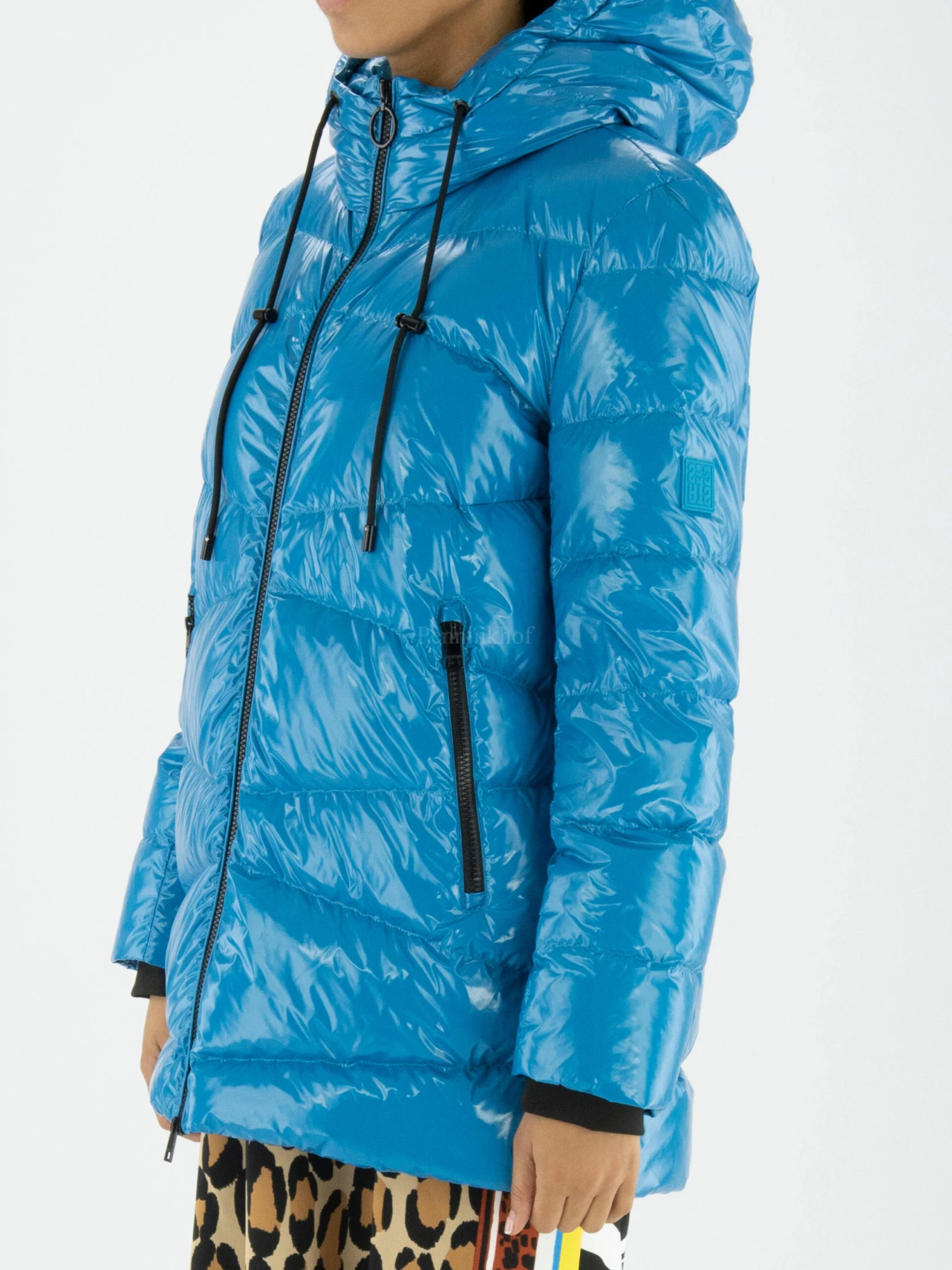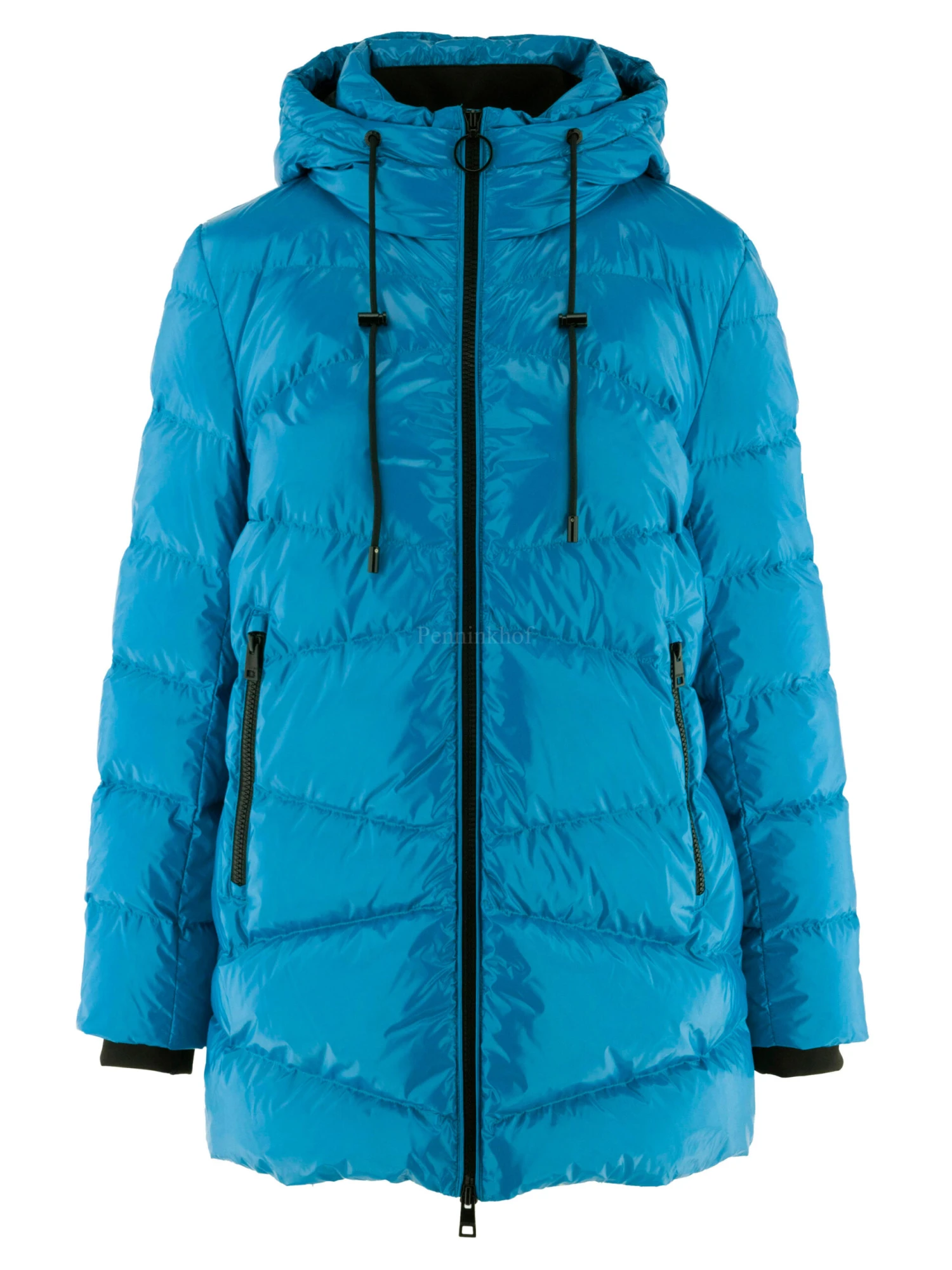 Een gestepte coat van Marc Cain in de kleur blauw. De coat is diagonaal gestept. Aan het uiteinde van de mouwen zijn zwarte manchetten. Deze coat mag op 30 graden worden gewassen.