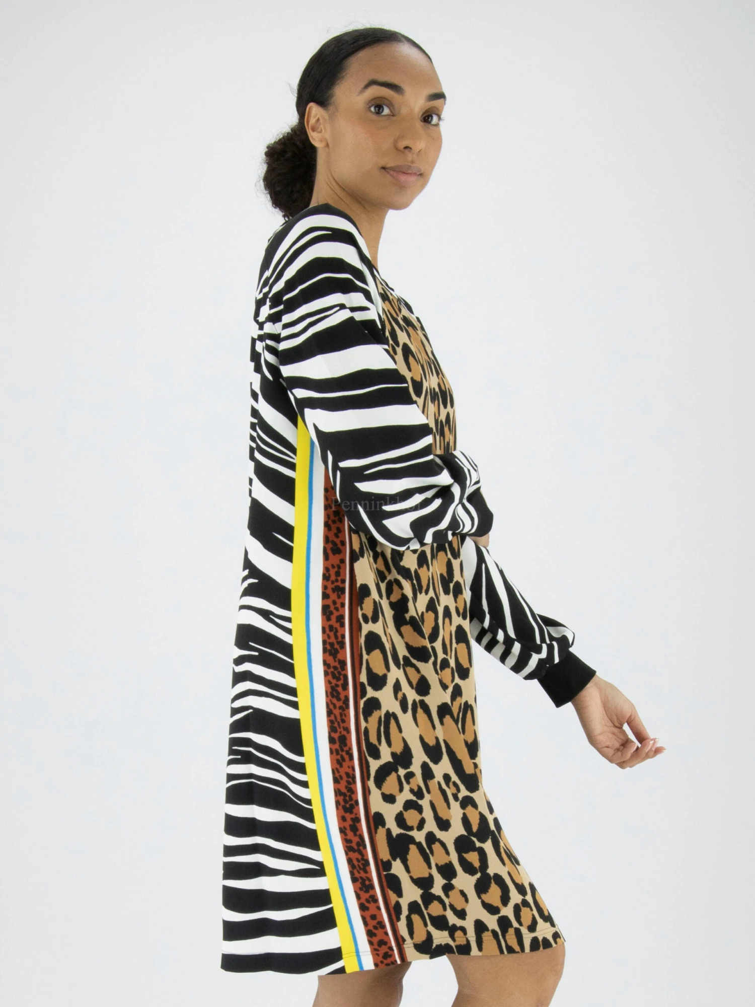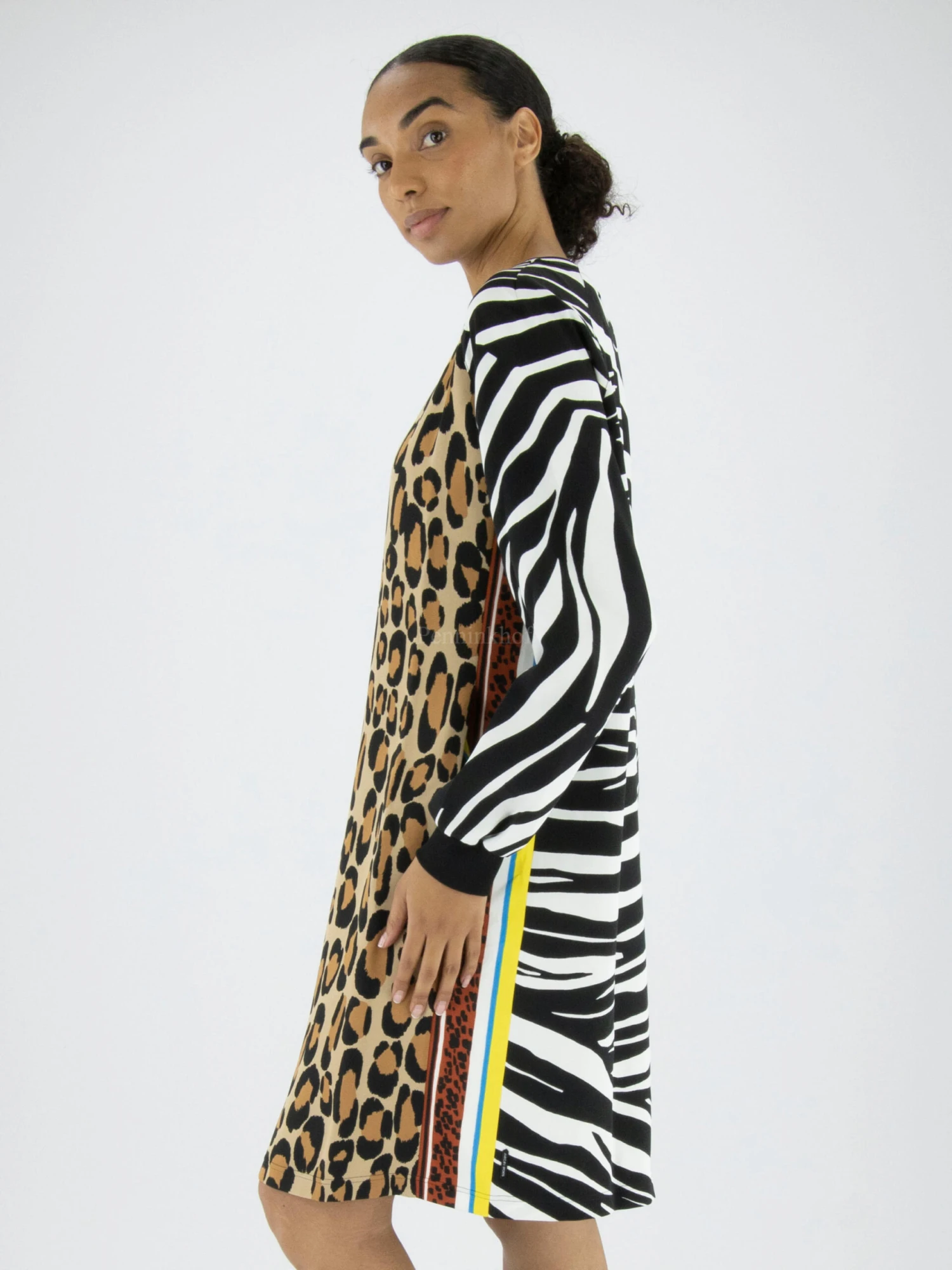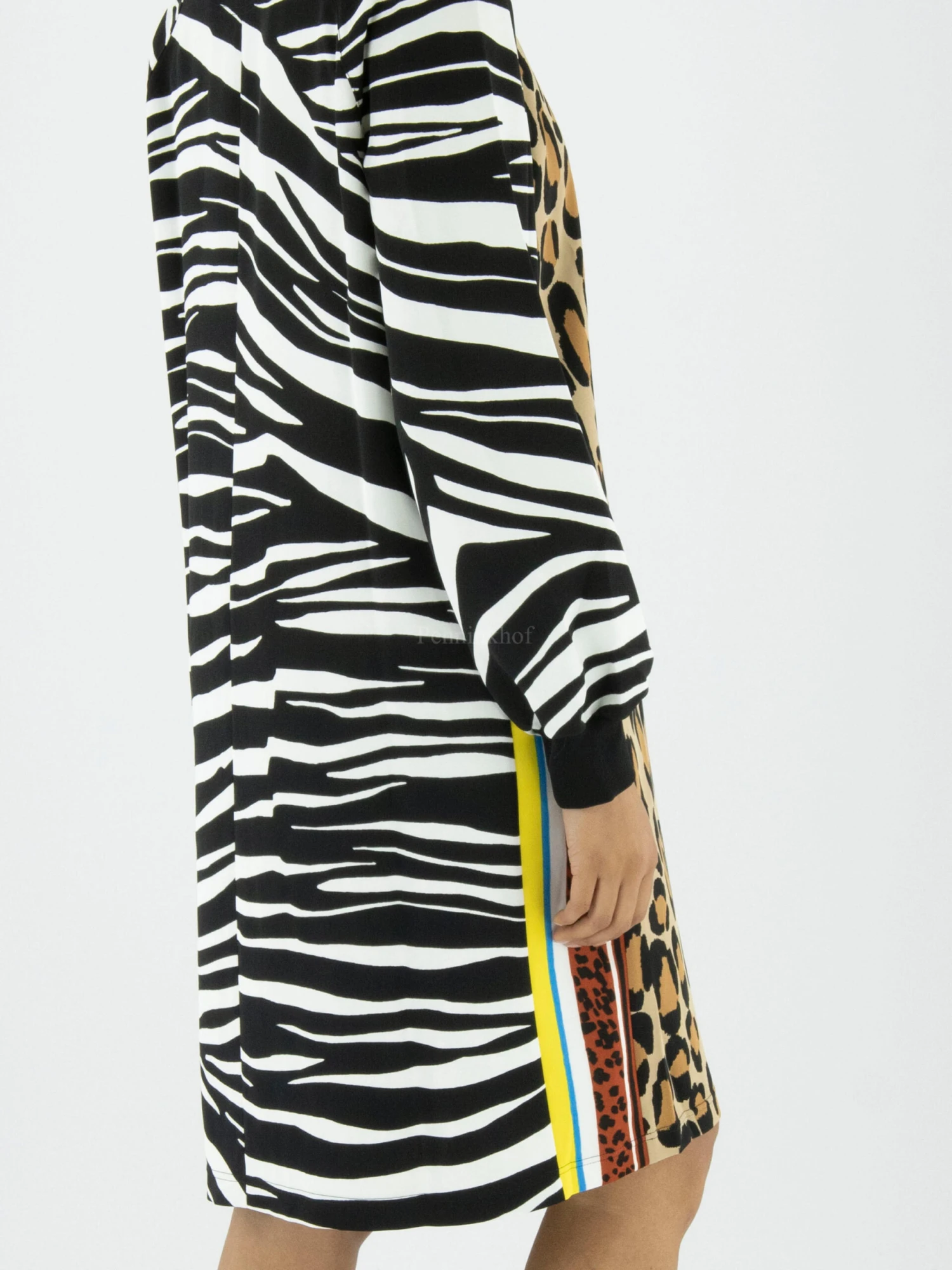 Een jurk van Marc Cain met aan de voorkant een panterprint met meerdere tinten bruin en zwart en aan de achterkant een zebraprint met de kleuren zwart en wit. Langs de zijkanten is een brede bies met de kleuren blauw, geel, wit en roest. Langs de rand van de ronde hals is een fijn geribbelde tricot boord. Aan het uiteinde van de lange mouwen is een fijn geribbelde zwarte tricot boord. Deze jurk mag op 30 graden worden gewassen.