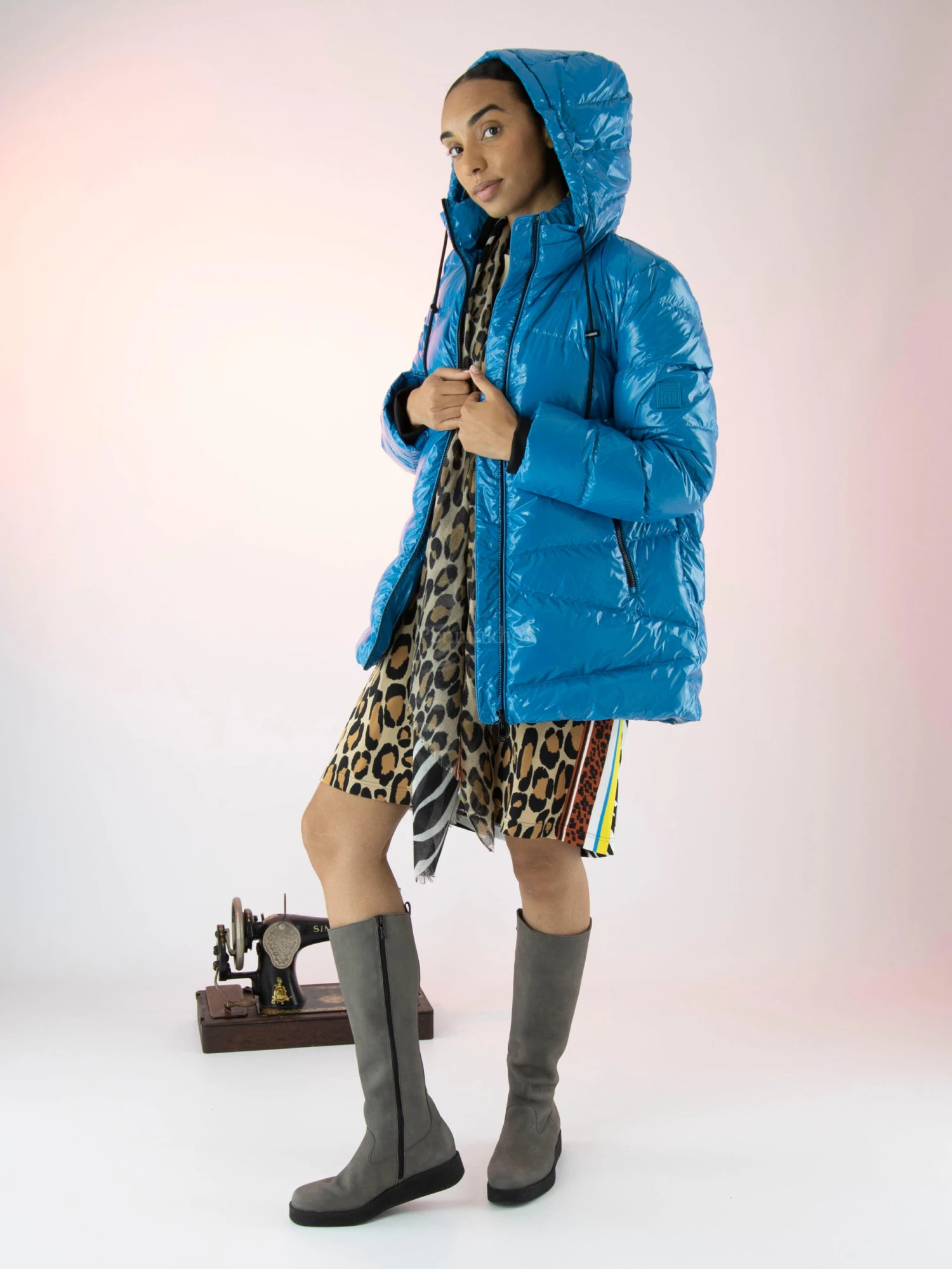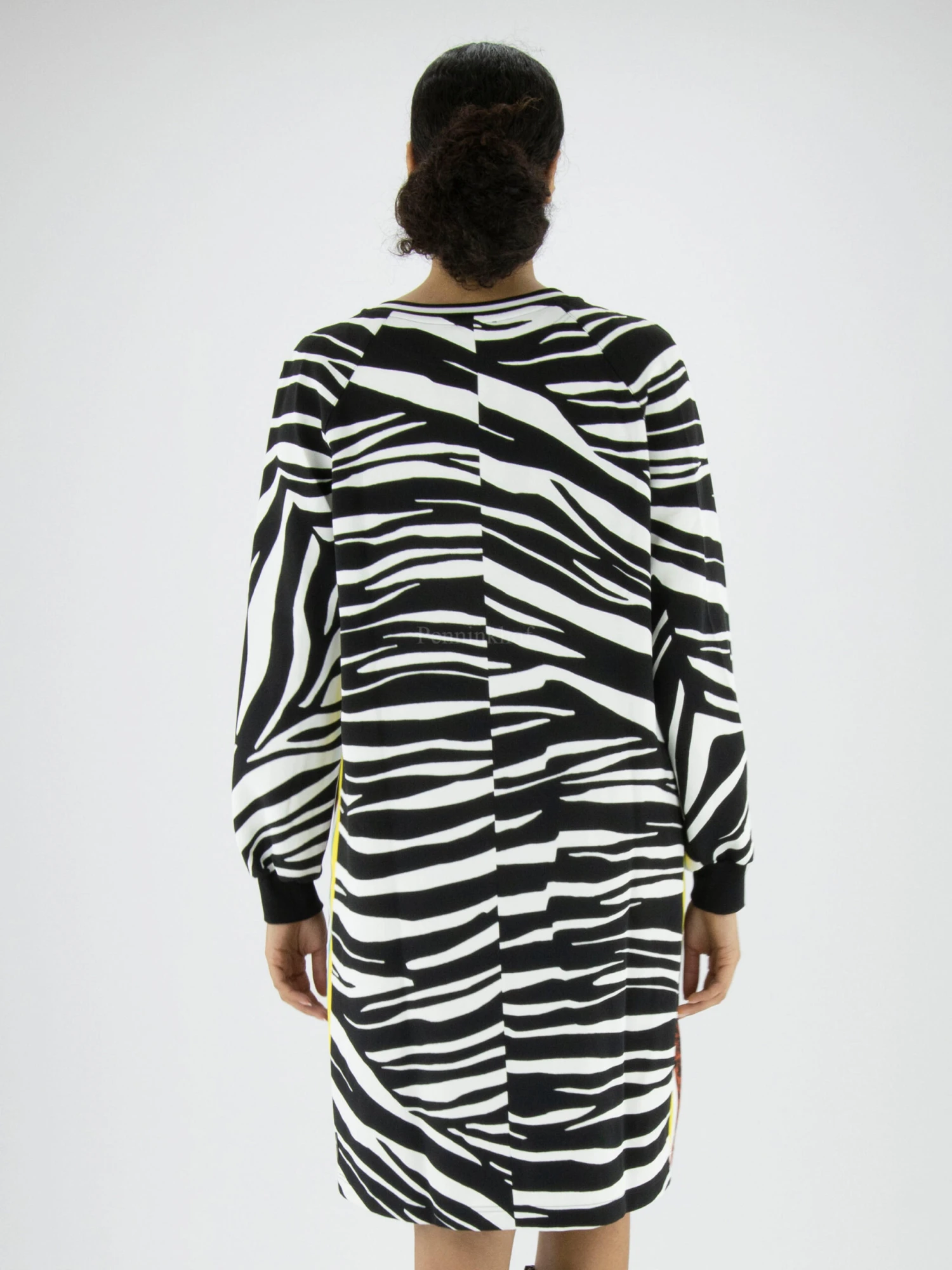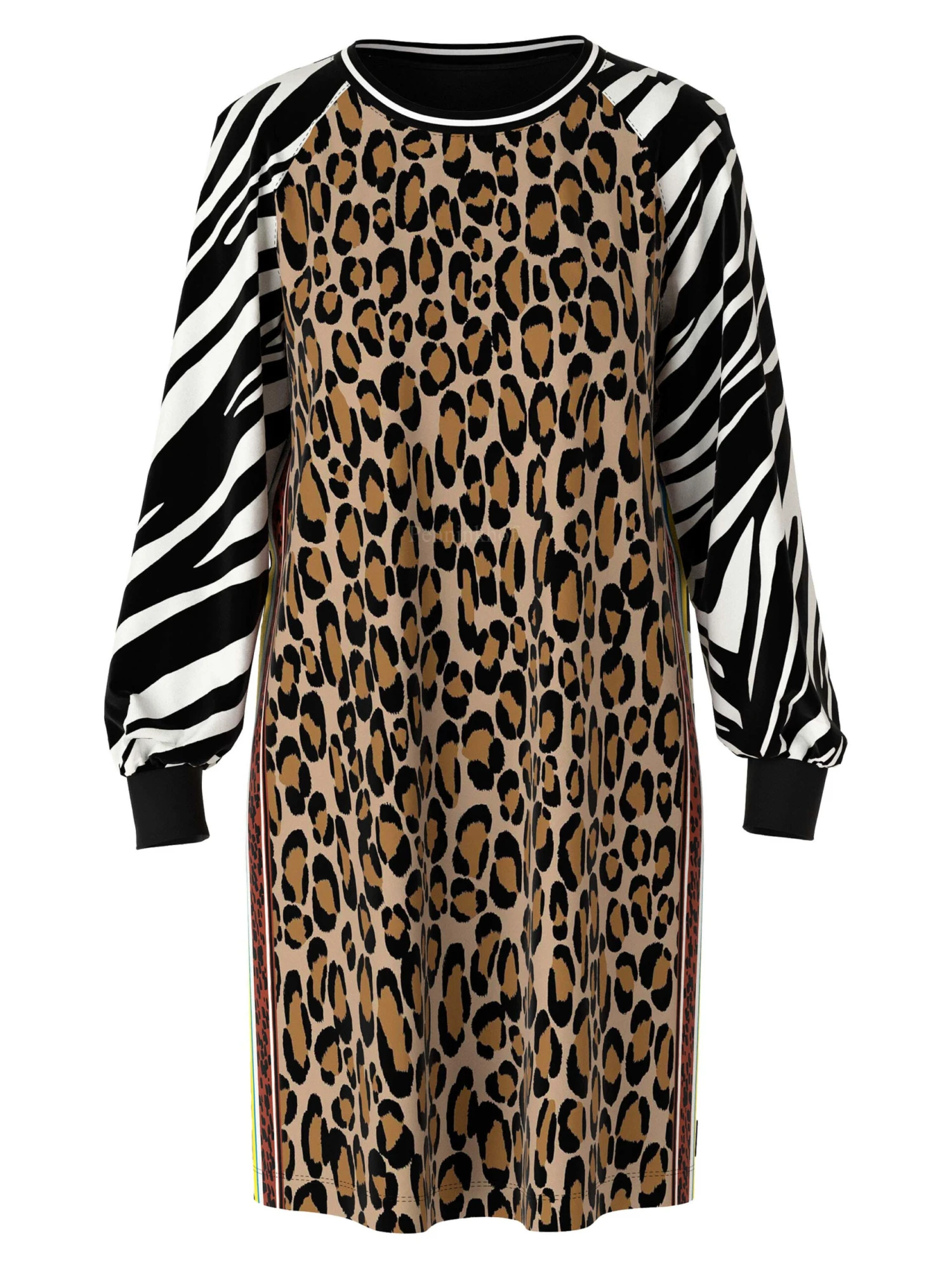 Een jurk van Marc Cain met aan de voorkant een panterprint met meerdere tinten bruin en zwart en aan de achterkant een zebraprint met de kleuren zwart en wit. Langs de zijkanten is een brede bies met de kleuren blauw, geel, wit en roest. Langs de rand van de ronde hals is een fijn geribbelde tricot boord. Aan het uiteinde van de lange mouwen is een fijn geribbelde zwarte tricot boord. Deze jurk mag op 30 graden worden gewassen.