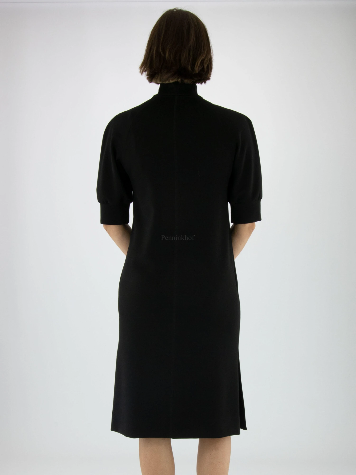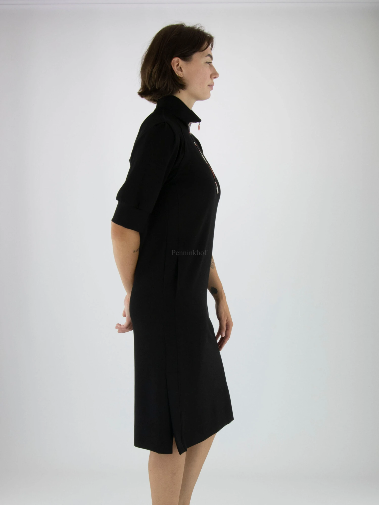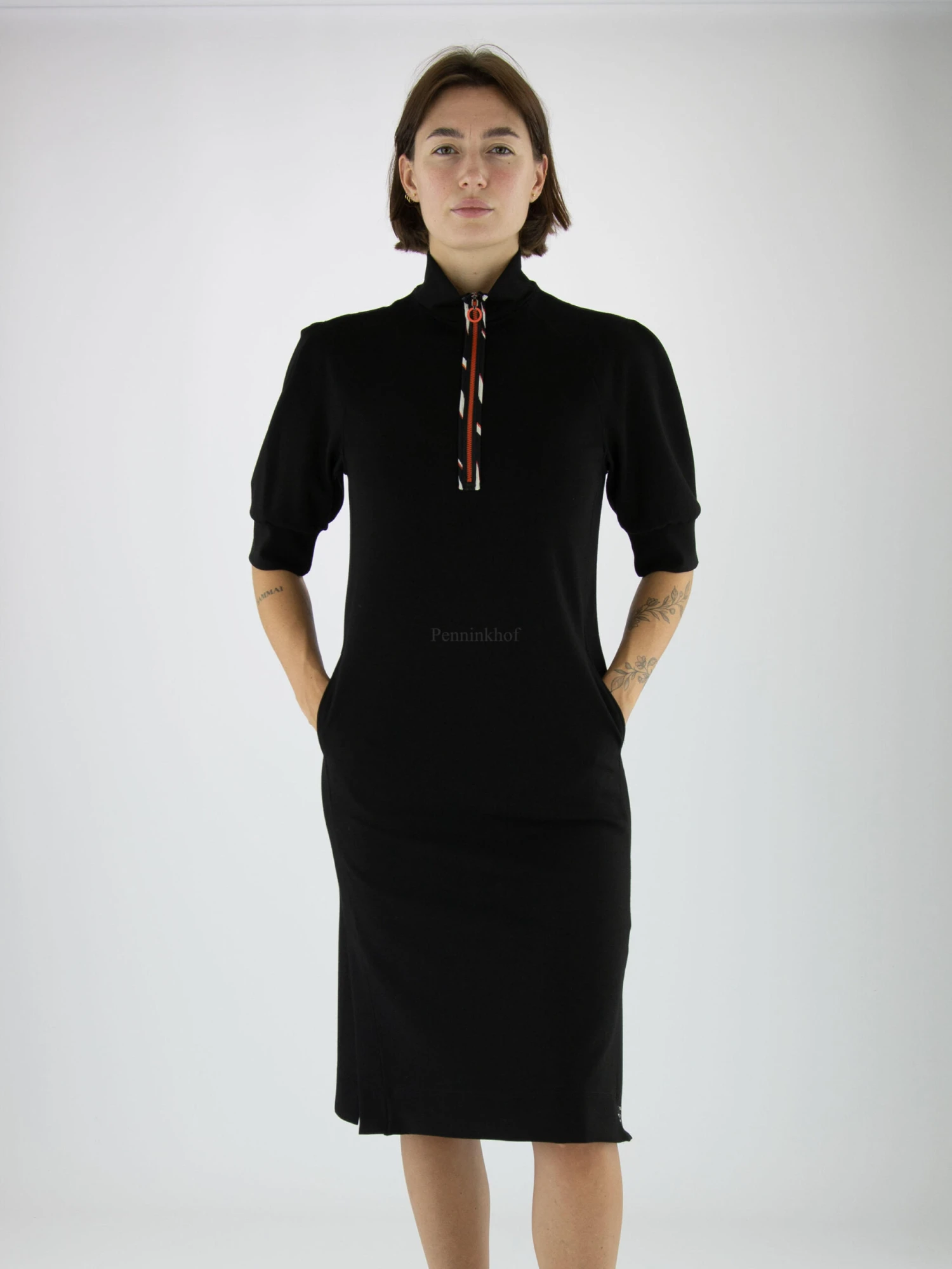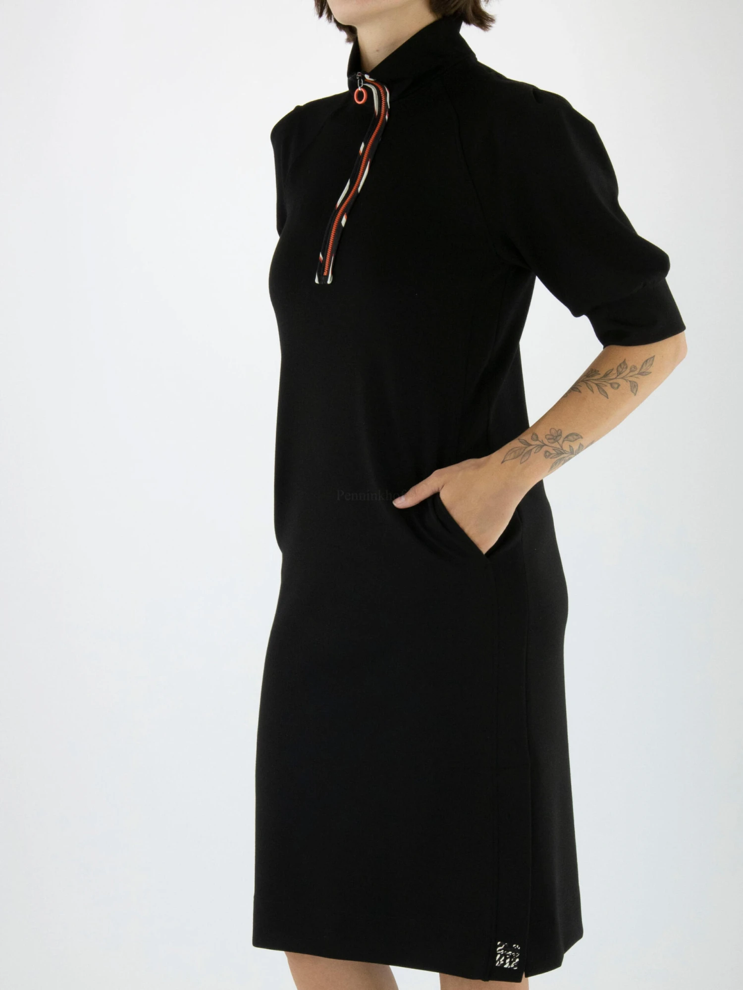 Een jurk van Marc Cain in de kleur zwart. Vanuit de turtle col is in het midden een rits tot de buste. Langs de rits is een bies met een gevlamde print met de kleuren wit, zwart en oranje. Aan de onderkant is aan beide zijkanten een split. Ter hoogte van de taille zijn steekzakken en de jurk mag op 30 graden worden gewassen.