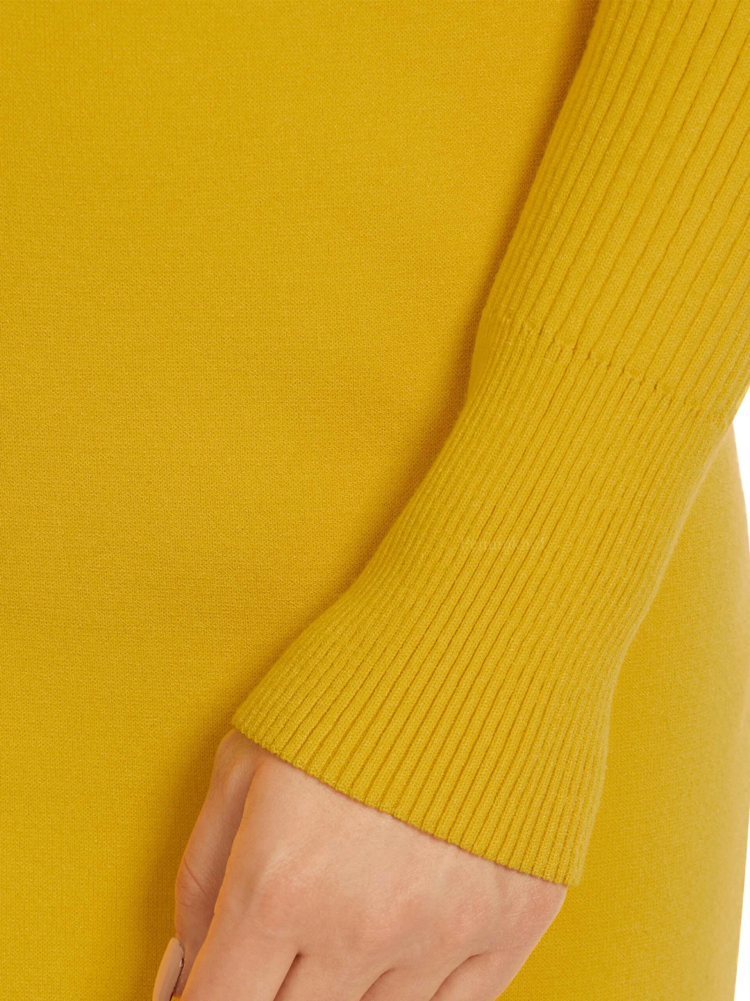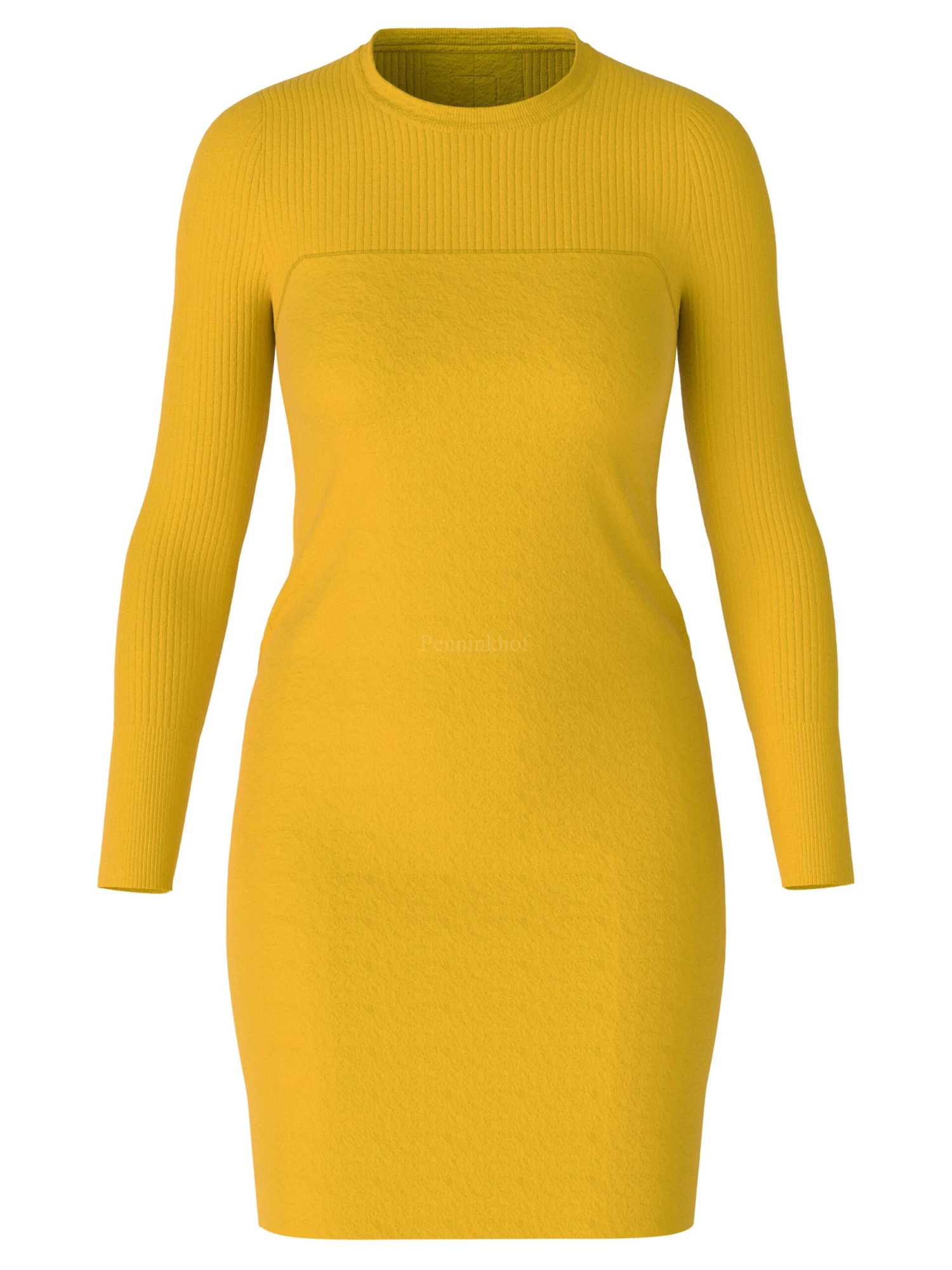 Een jurk van Marc Cain in de kleur geel. Vanaf de ronde hals tot aan de buste samen met de lange mouwen is de stof geribbeld. vanaf de buste naar beneden is de stof glad. Deze jurk mag op 30 graden worden gewassen.