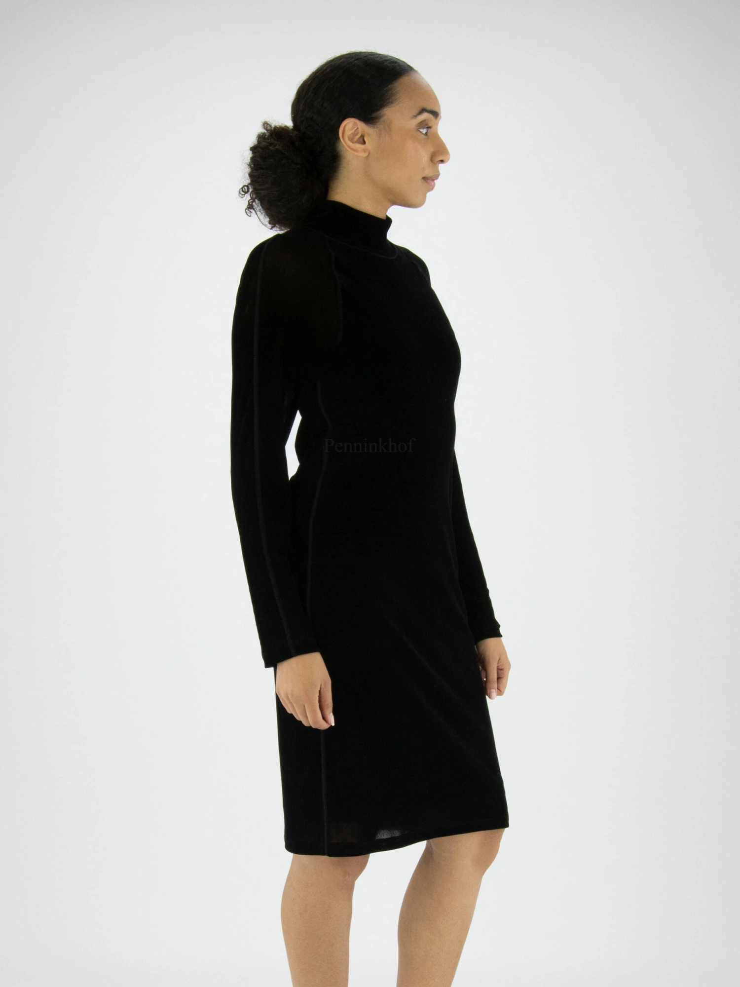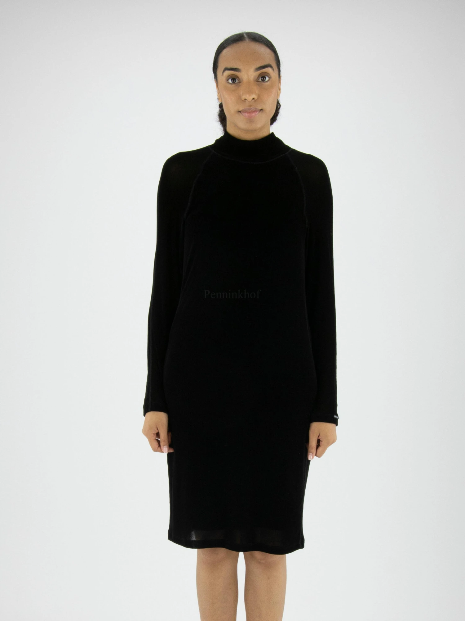Een velour jurk van Marc Cain in de kleur zwart. De jurk heeft een vallende hoge hals. Vanaf de schouders is de stof van de lange mouwen licht transparant. De jurk is gevoerd en mag op 30 graden worden gewassen.