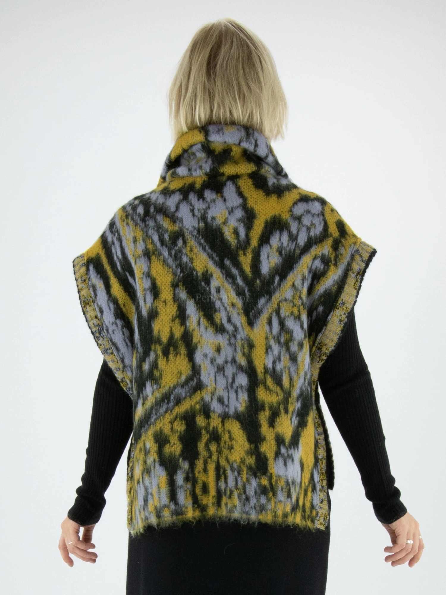 Een spencer Van Marc Cain in een print met de kleuren geel, lila en zwart. De spencer heeft een vallende col met een ritssluiting in het midden. Langs de zijkanten is de spencer met één knoopsluiting aan beide kanten gesloten. Deze spencer mag op de hand worden gewassen.