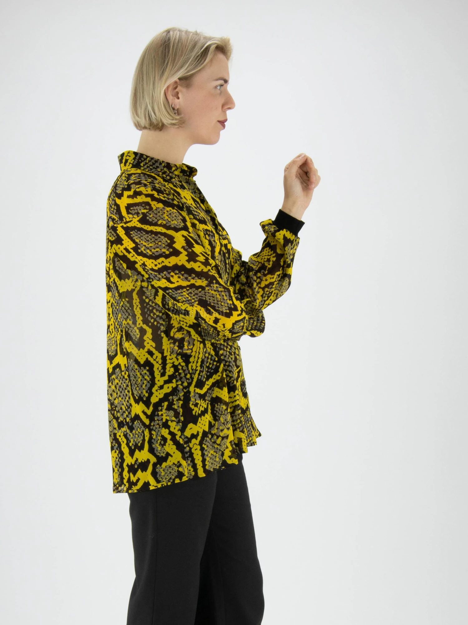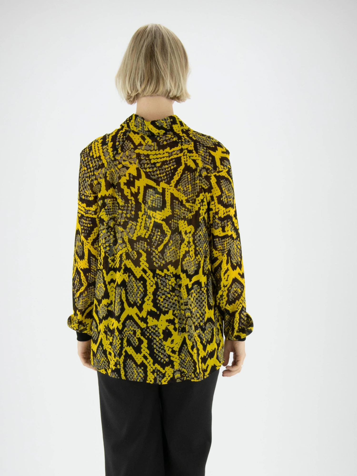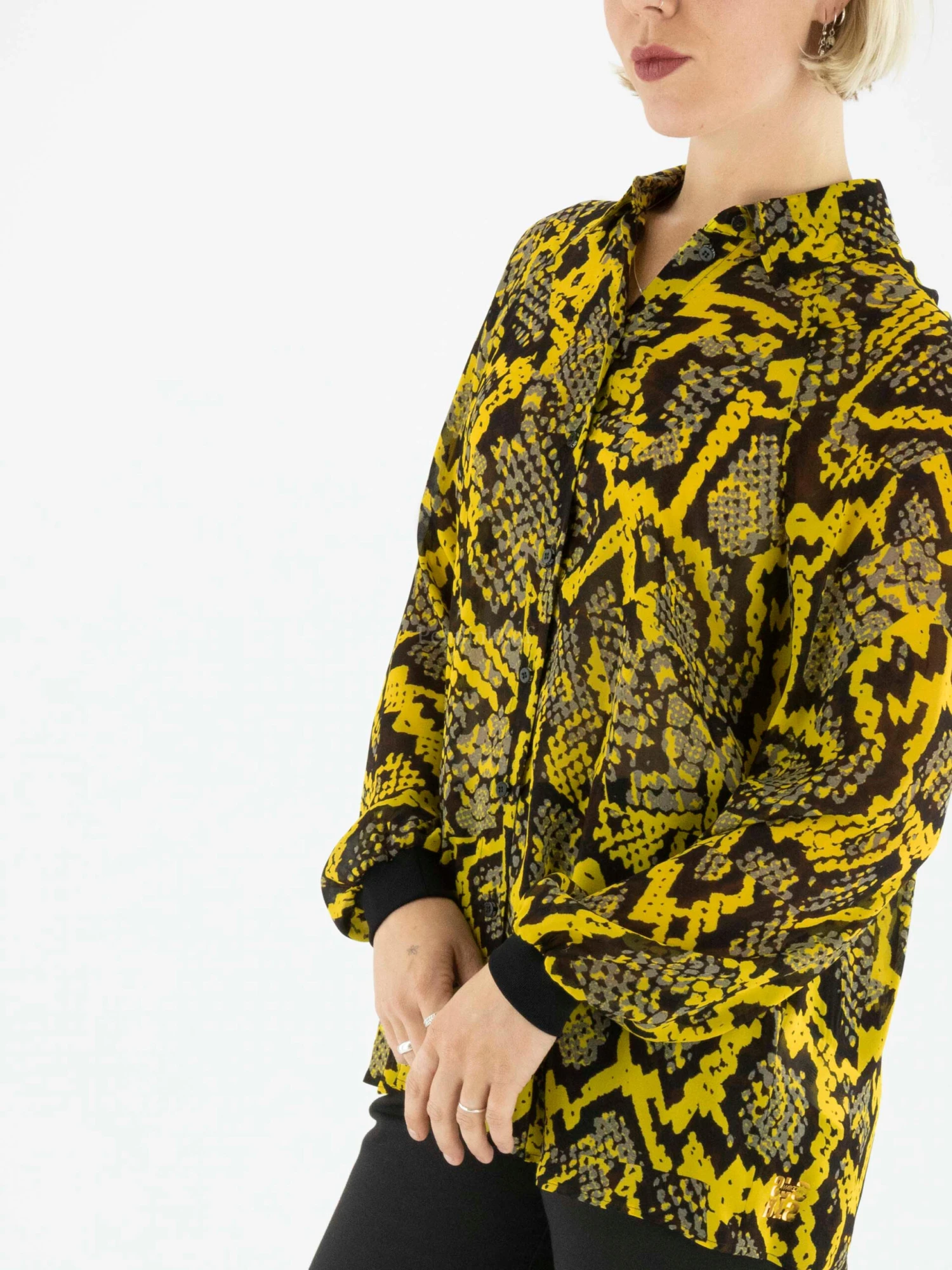 Een blouse van Marc Cain in een reptiel print met de kleuren geel, grijs en zwart. Aan het uiteinde van de lange mouwen is een zwarte fijn geribbelde tricot boord. Deze blouse mag op de hand worden gewassen.