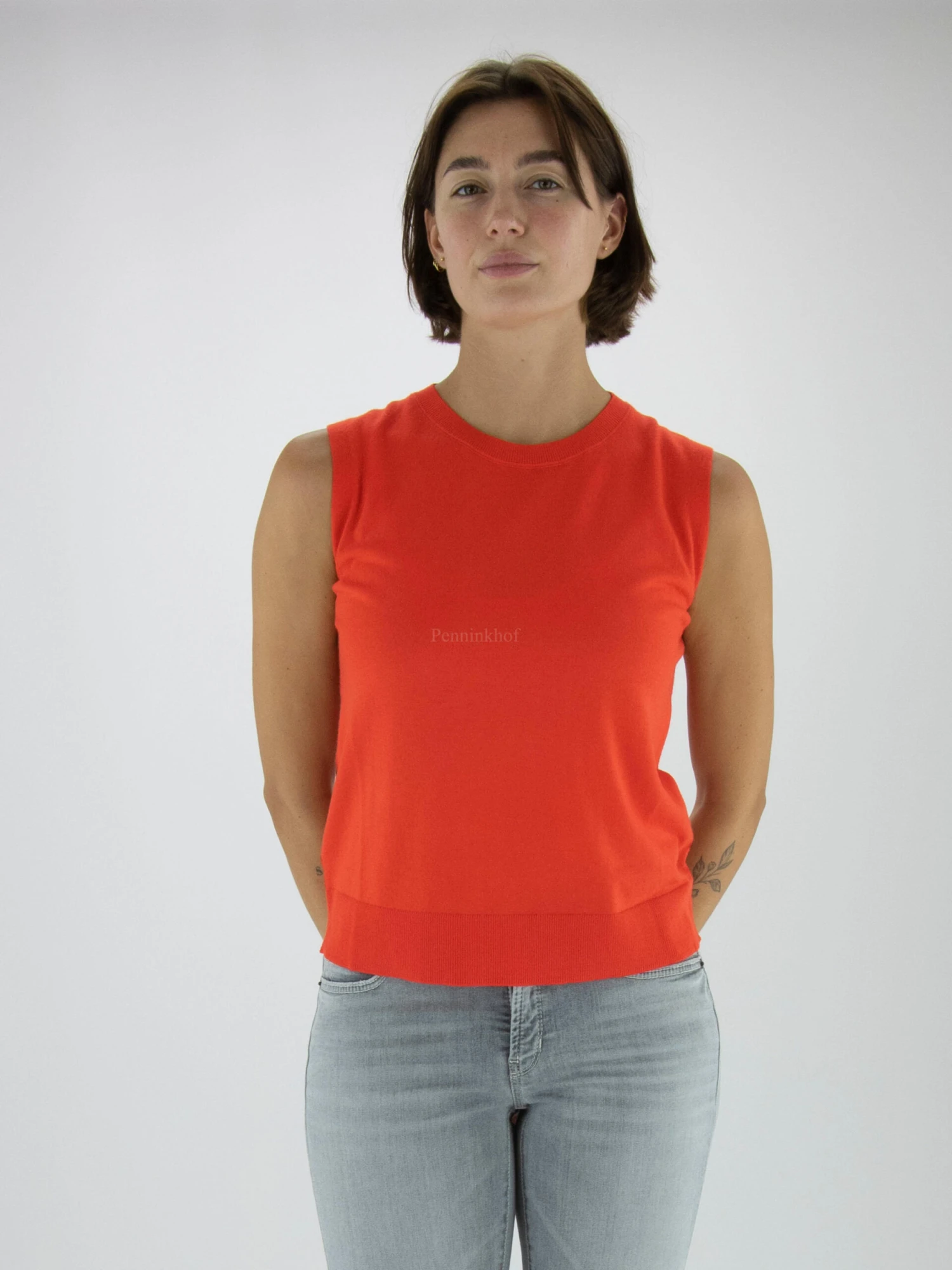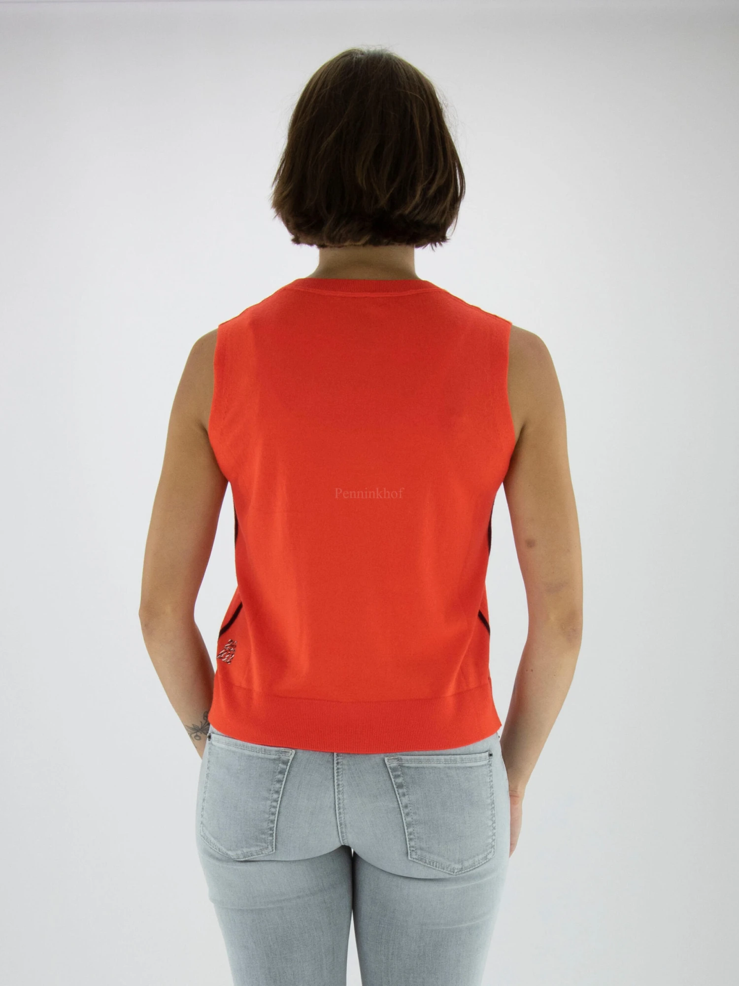 Een hes van Marc Cain in de kleur oranje. De hes heeft een ronde hals en langs de zijkanten is een zwarte bies. Dit hes mag op de hand worden gewassen.