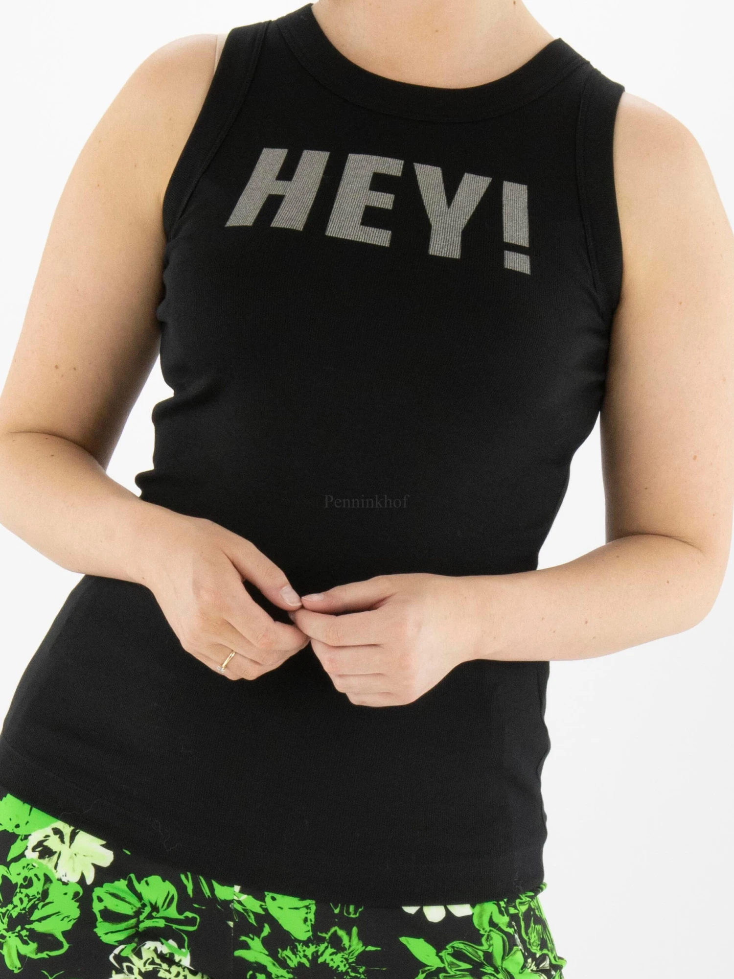 Een top van Marc Cain in de kleur zwart. Aan de voorkant is in een zilver metallic kleur het woord “HEY” geprint. De top heeft een ronde hals en mag op 30 graden worden gewassen.