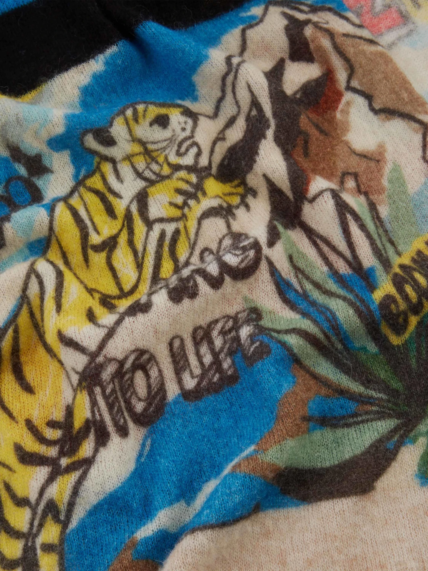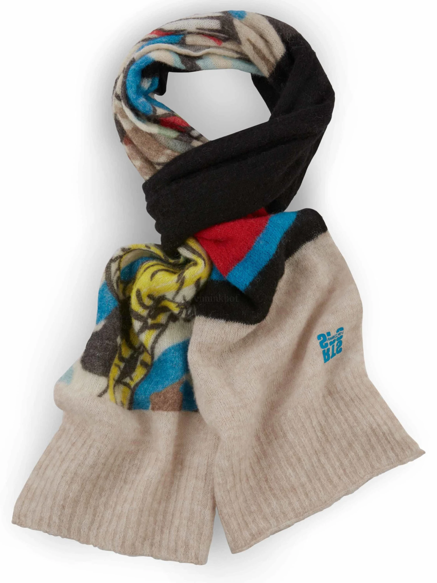 Een shawl van Marc Cain in een cartoonprint met de hoofdkleuren blauw, geel en zwart op een beige achtergrond. De uiteinden van de shawl zijn in een uni beige kleur. Deze shawl mag op de hand worden gewassen.