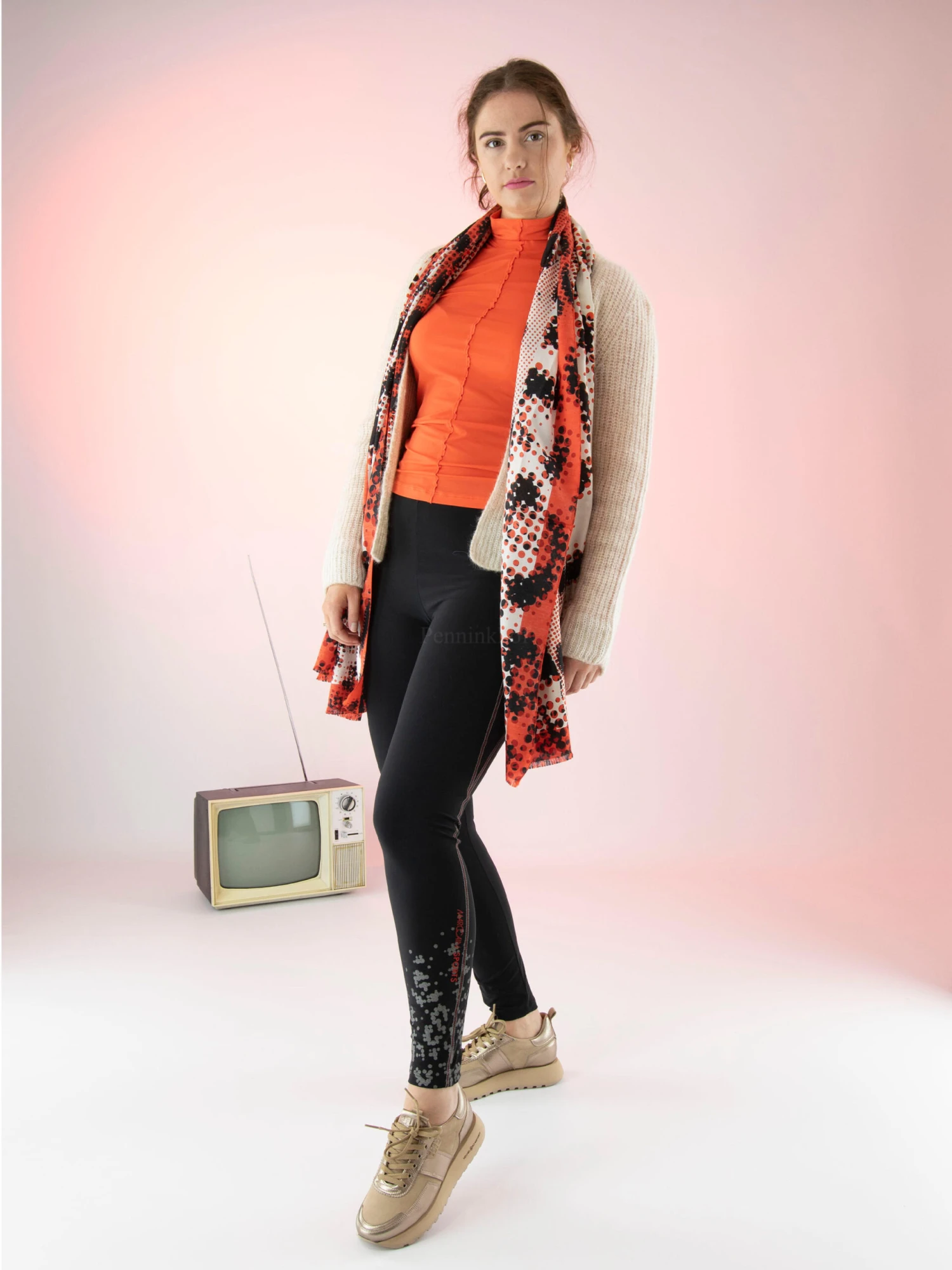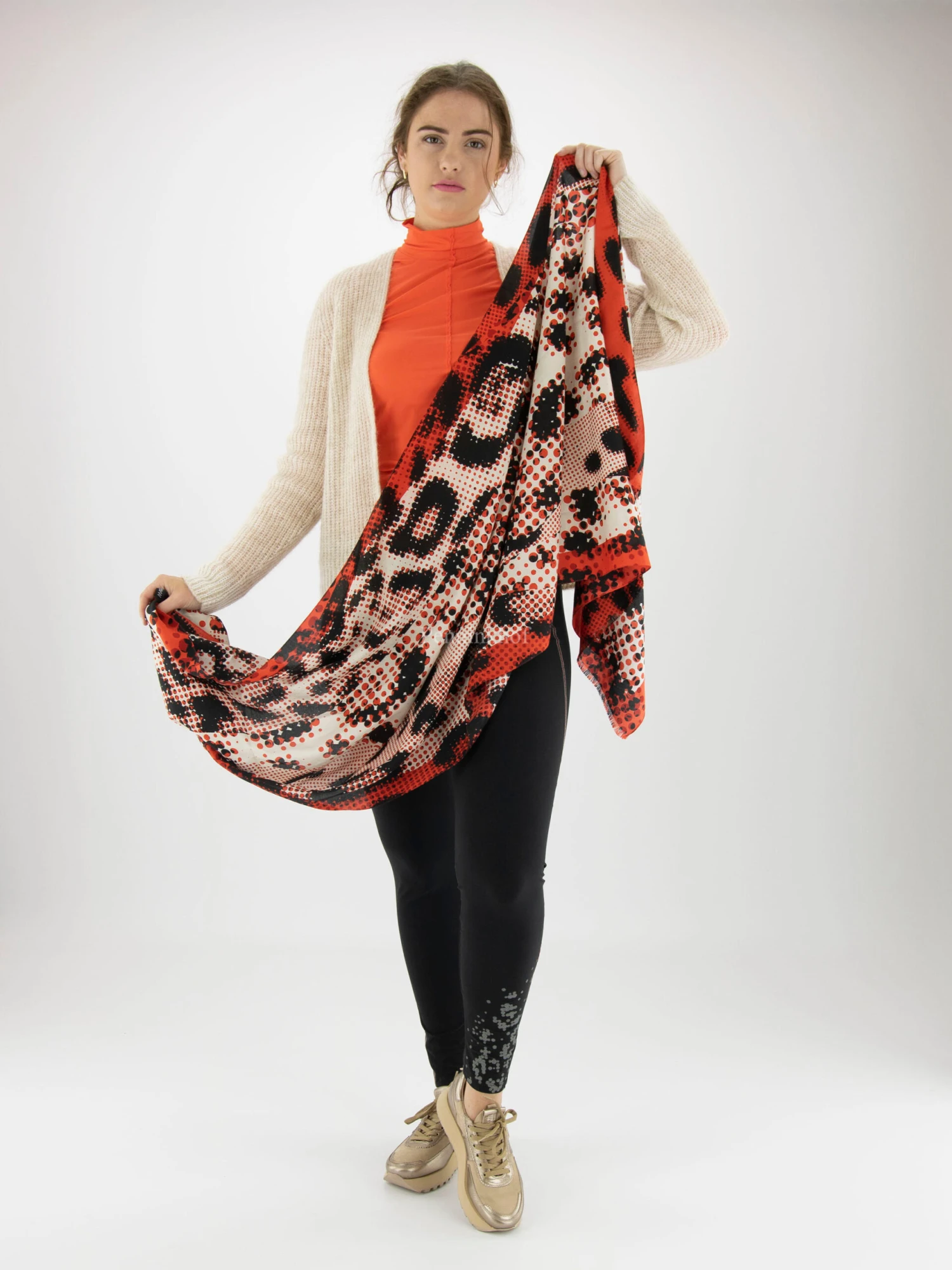 Een shawl van Marc Cain in een grafische panterprint met de kleuren rood en zwart op een roomwitte achtergrond. Langs de rand isa een geprinte rode bies. Deze shawl mag op de hand worden gewassen.