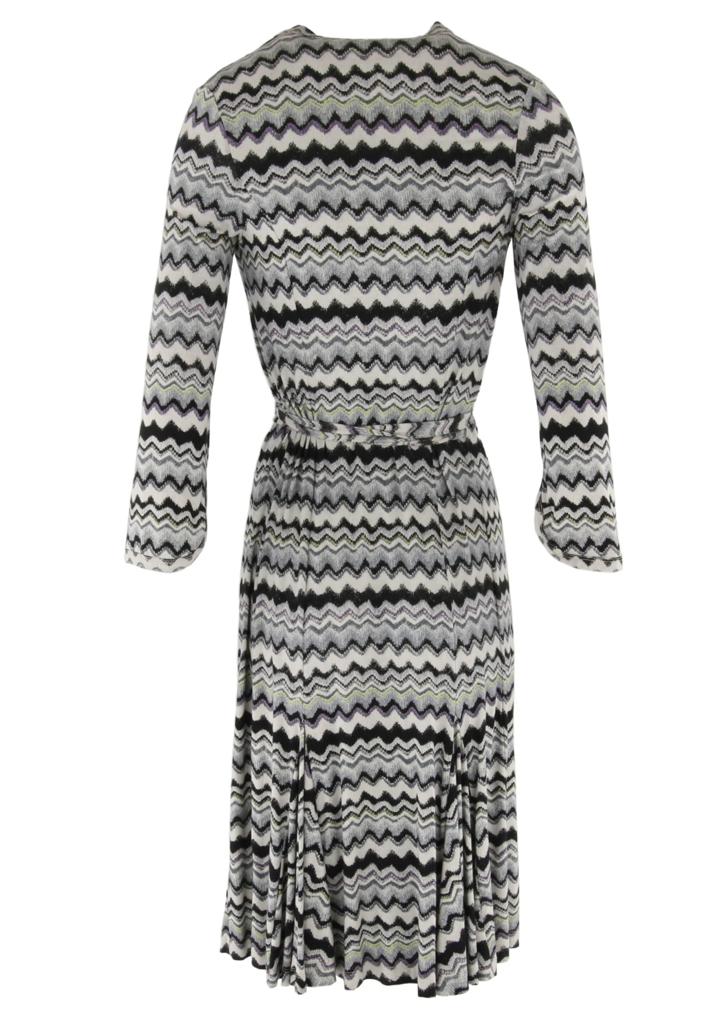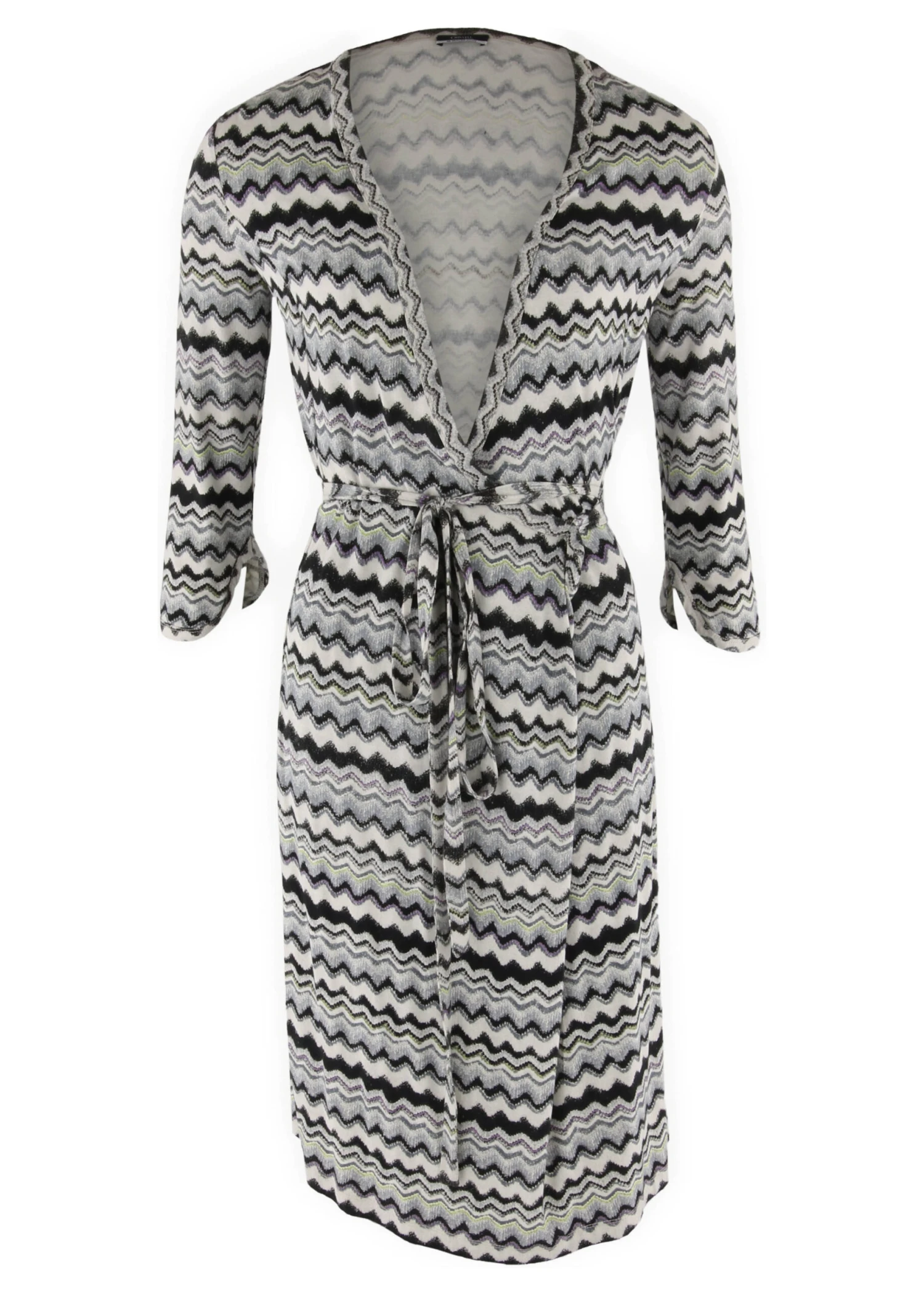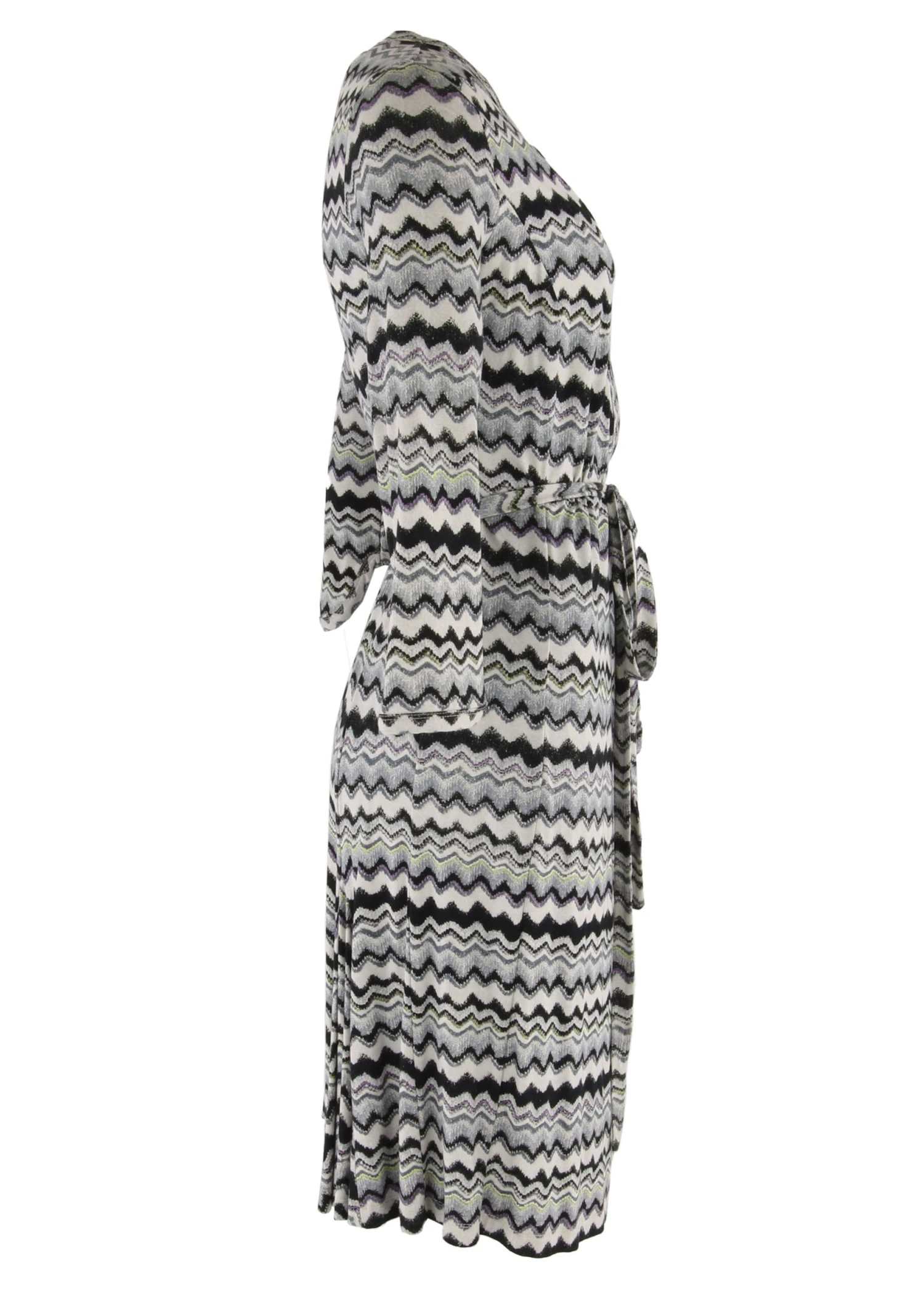 Een overslagjurk van Orwell in een missoni print met meerdere tinten grijs, paars en pistache groen. De jurk heeft halflange mouwen. Deze jurk mag op de hand worden gewassen.