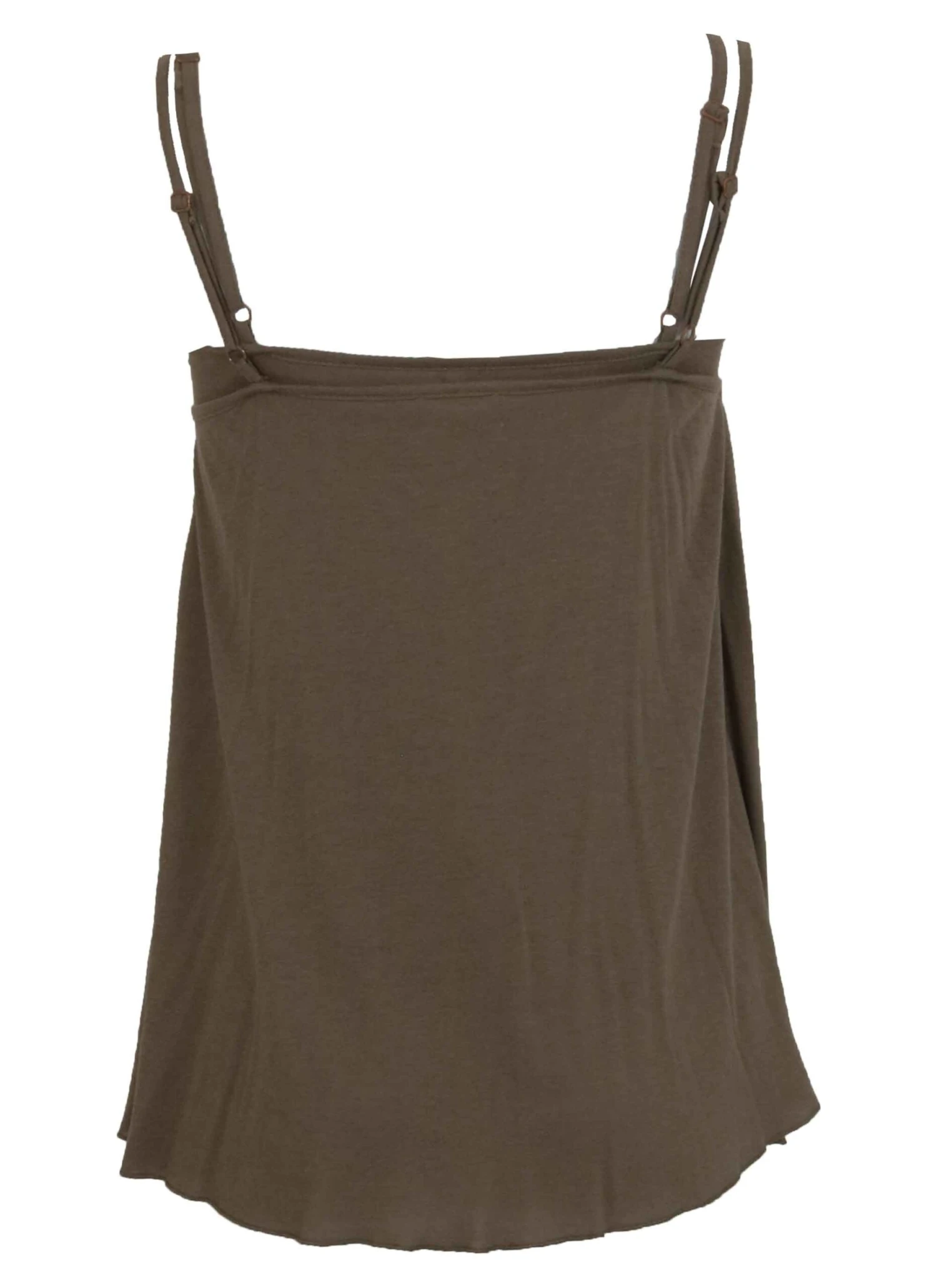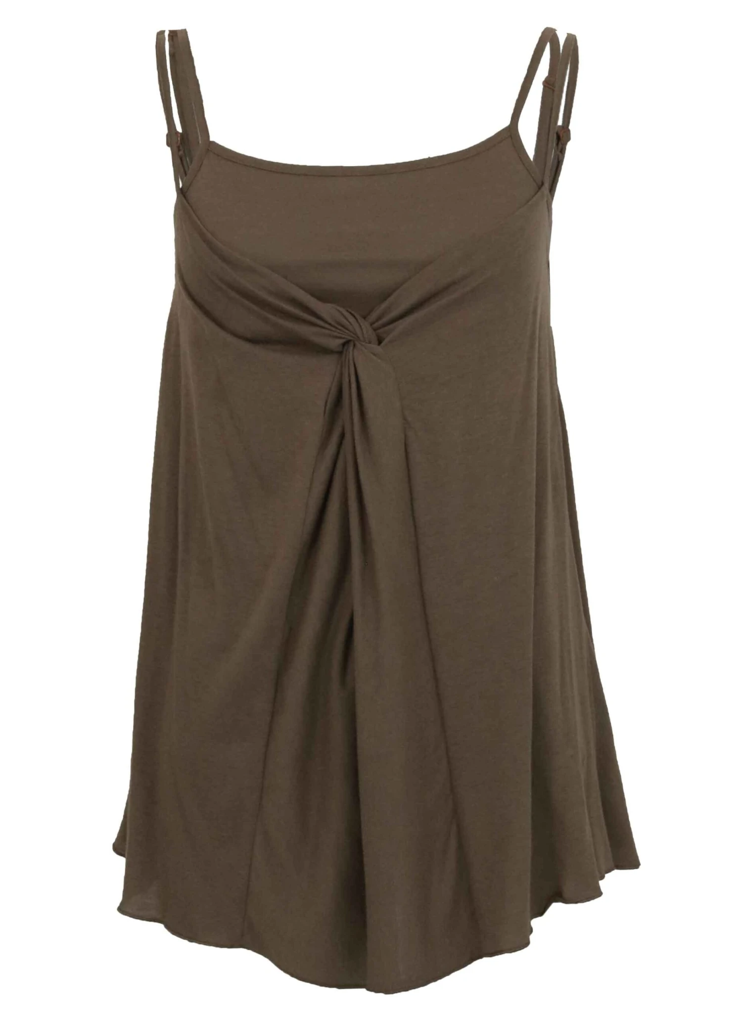 Een dubbele top van Orwell in de kleur bruin. De top heeft spaghettibandjes. De onder top is een basis top. De boven top is geknoopt aan de voorzijde. Deze top mag op 30 graden worden gewassen.