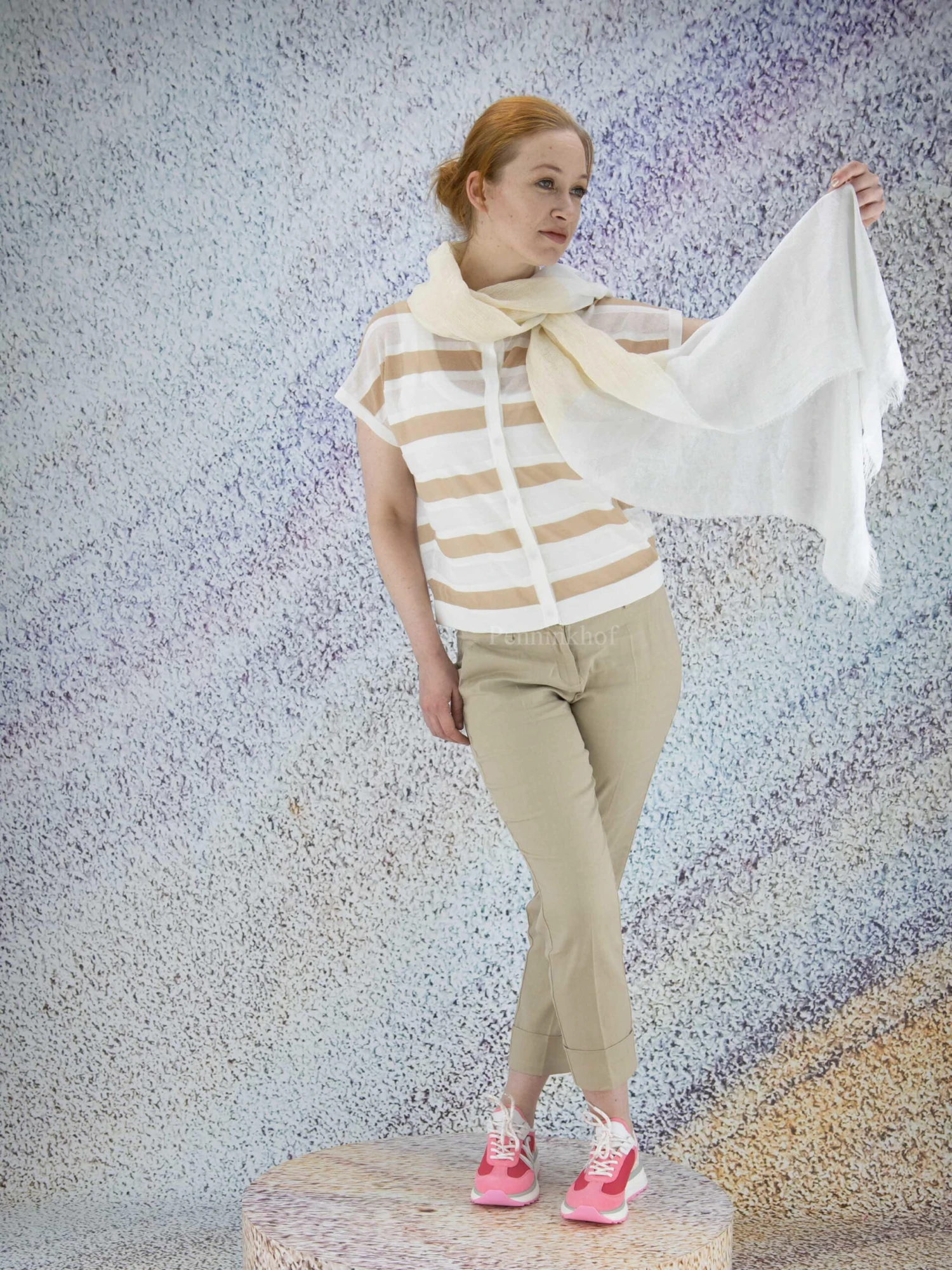 Een luxe transparante shawl van Peserico in een combinatie van 2 structuren. De eerste is een open wafelstructuur in een vanille kleur en de 2e is een wit met zilverdraad geweven structuur. Dee shawl mag niet worden gewassen.