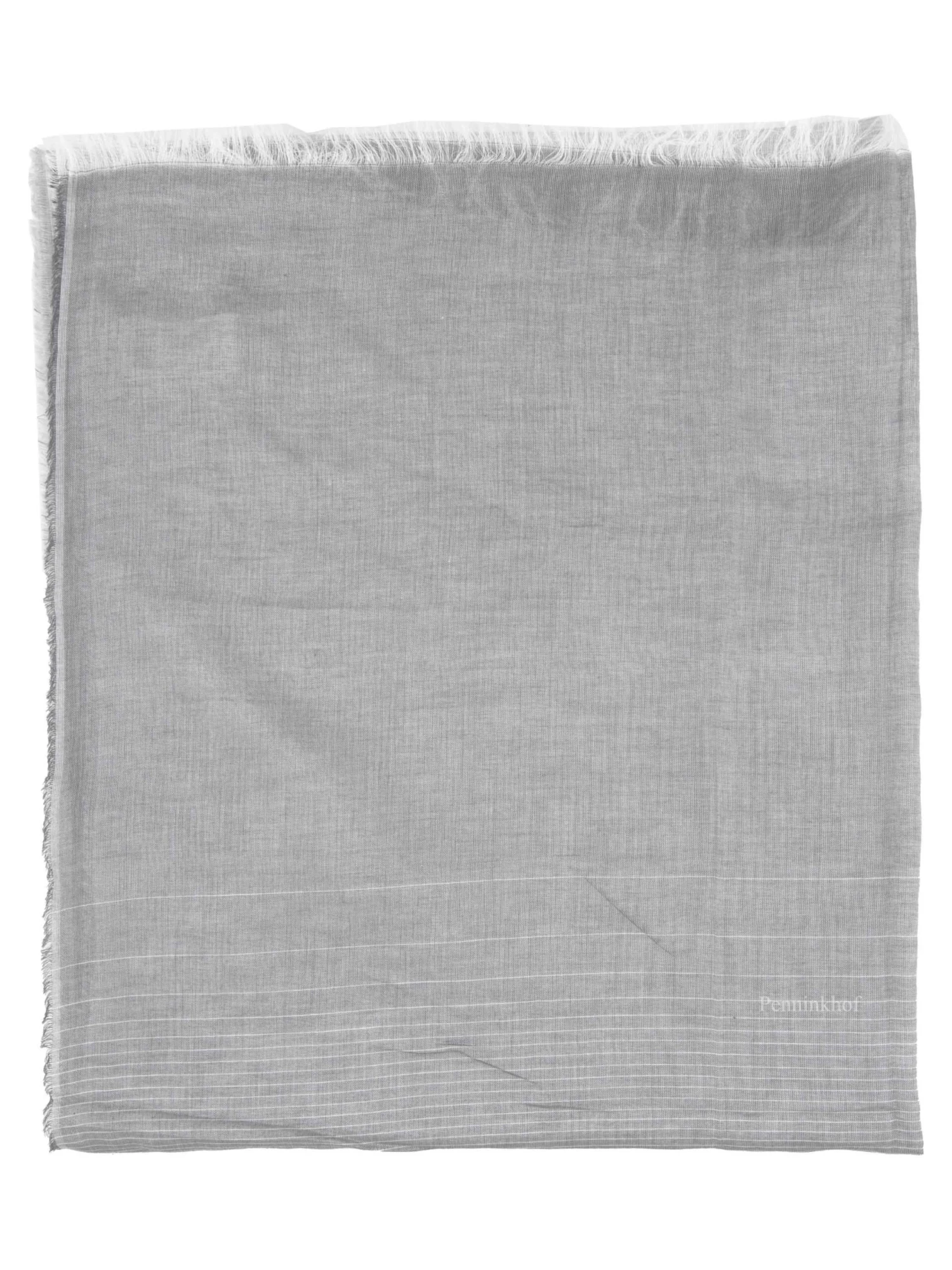 Een licht transparante shawl van Peserico in meerdere tinten grijs in een dégradé met lijnen. Aan het uiteinde van de shawl zijn lange fijne witte rafels. Deze shawl mag op de hand worden gewassen.