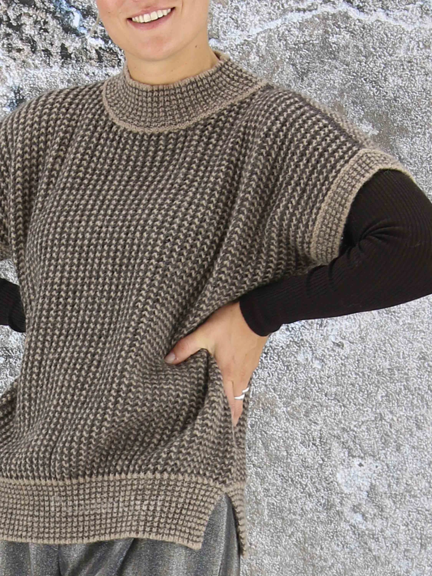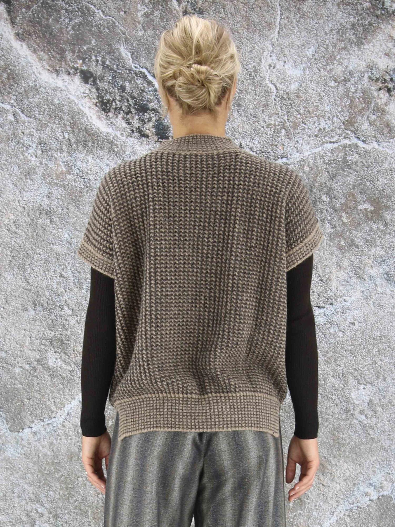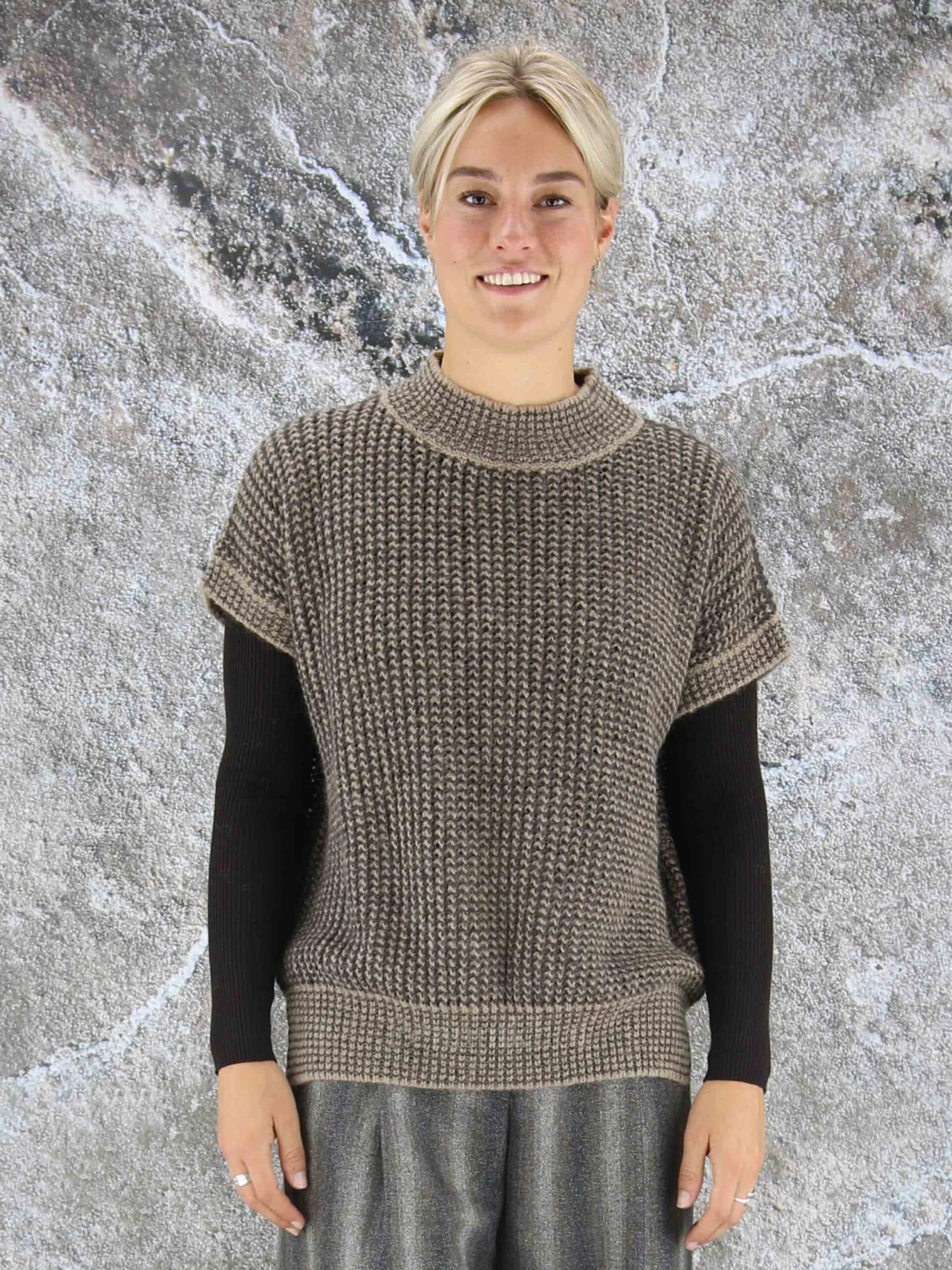 Een luxe iets open gebreid hes van Peserico in de kleuren bruin met mokkabruin. In de stof is een zilverkleurig draad geweven. Het hes heeft een hoge ronde hals en mag op de hand worden gewassen.