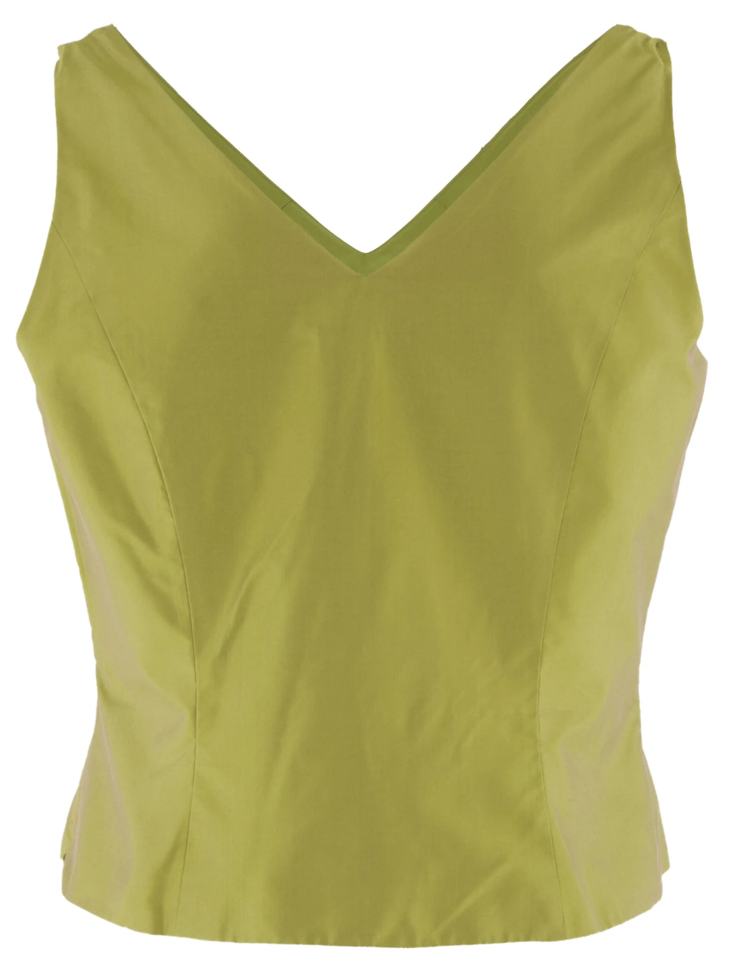 Een top van Renato Nucci in een mat satijnen groene kleur. De top heeft aan de voor en achterkant een V- Hals. Deze top mag niet worden gewassen.