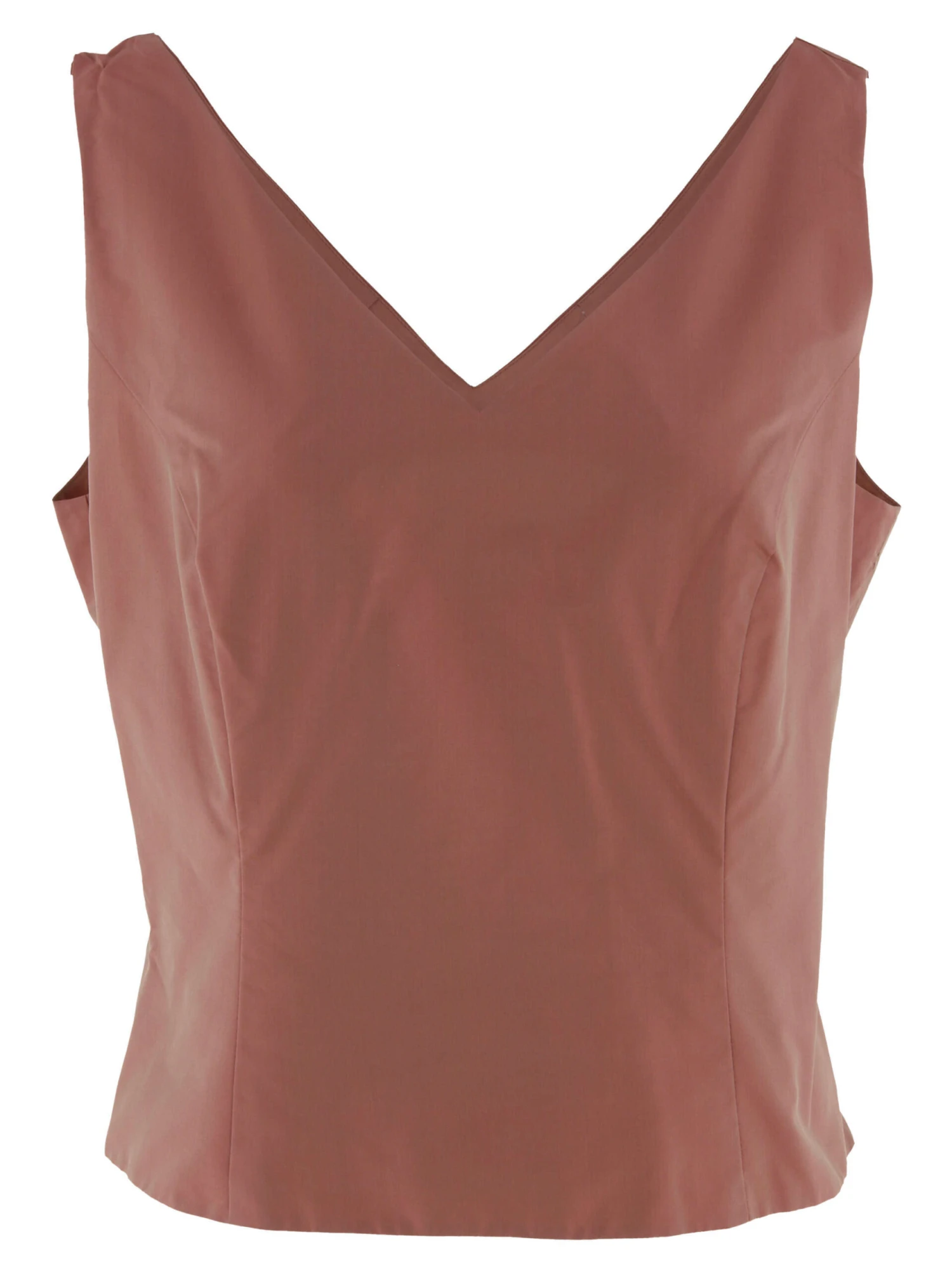 Een top van Renato Nucci in een mat satijnen rode kleur. De top heeft aan de voor en achterkant een V- Hals. Deze top mag niet worden gewassen.