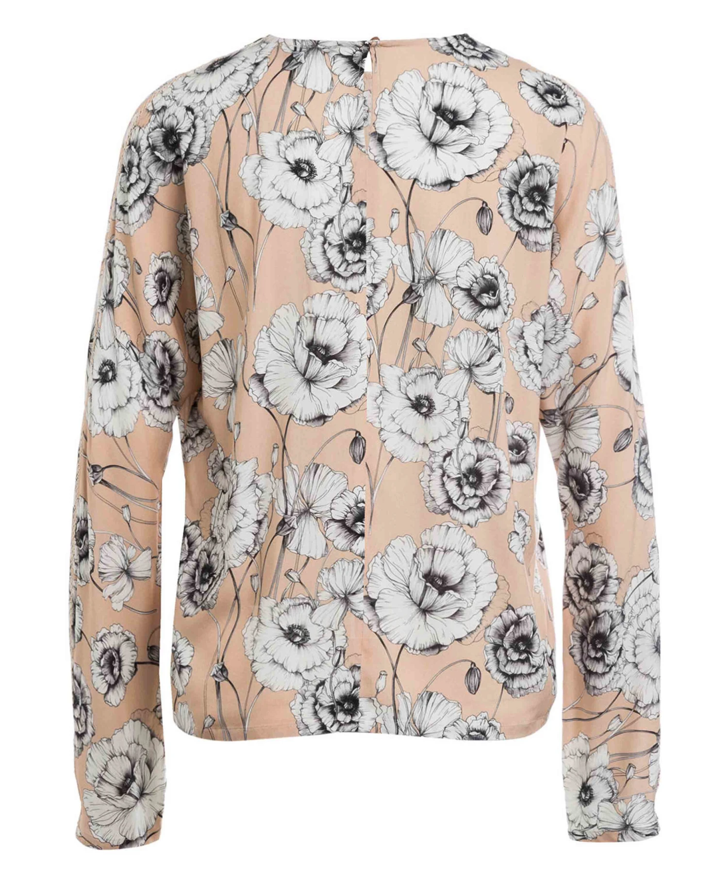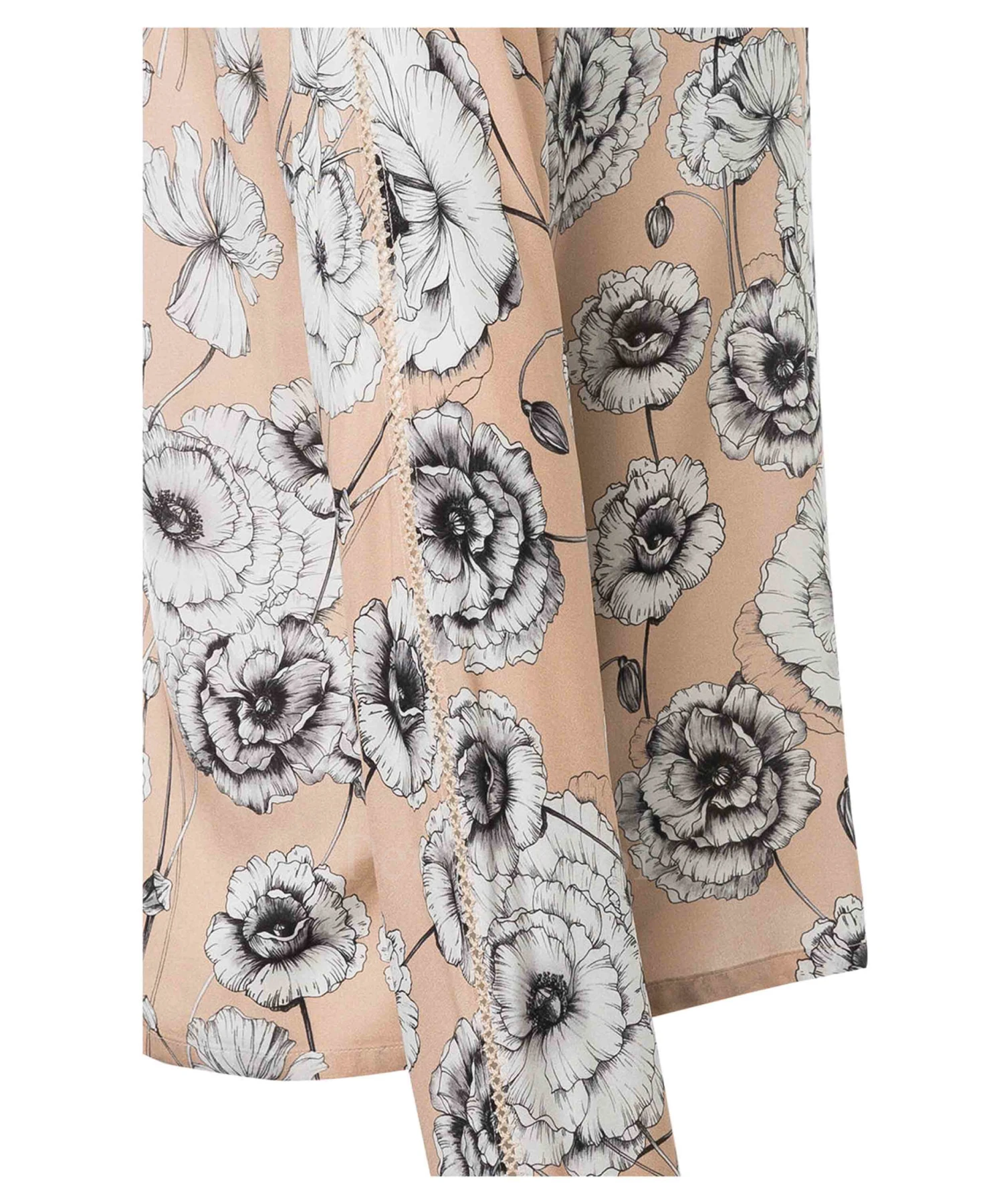 Een blouse van Riani in een bloemenprint met de kleuren zwart en wit op een zandkleurige achtergrond. In het midden van de voorzijde is een ajour bies. De blouse heeft een ronde hals en mag op 30 graden worden gewassen.