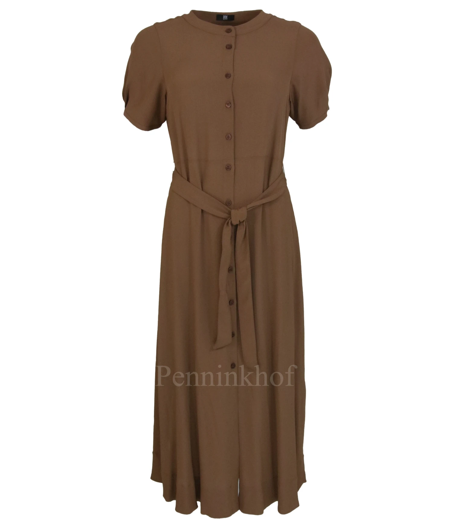 Een doorknoop jurk van Riani in de kleur bruin. De jurk heeft korte mouwen en in de taille is een ceintuur. Bij het uiteinde van de mouwen zijn aan de bovenkant enkele plooien. Aan de onderkant zijn aan beide zijden diepe splitten. Deze jurk mag op 30 graden worden gewassen.